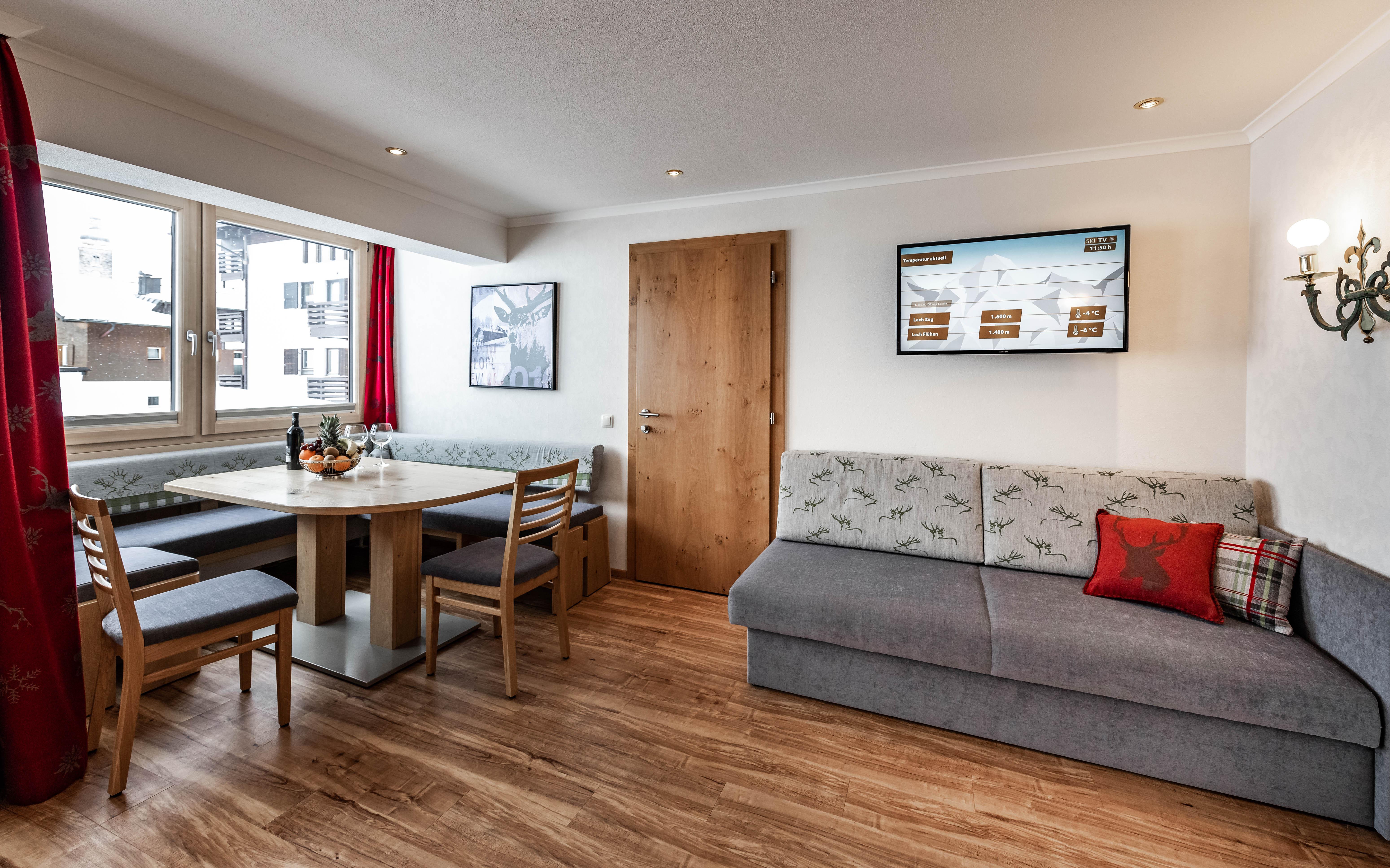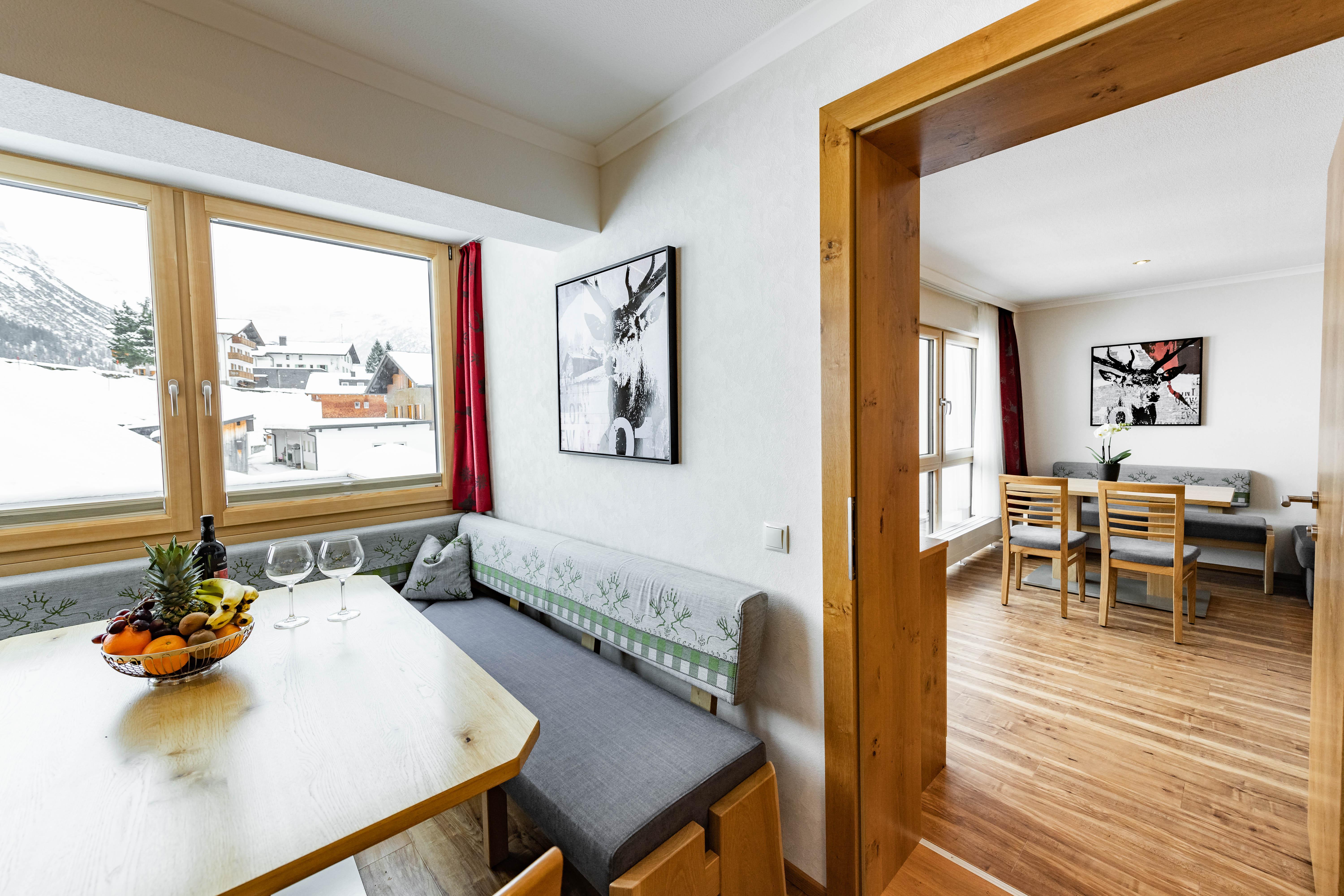 Type 8 Superior Appartement ca. 106 m2 Unsere Type 8 Superior Ferienwohnung besteht aus 2 komplett getrennten Appartements für jeweils 2-4 Personen und ist mit einer Verbindungstüre ausgestattet. Mit ihren großzügigen Essbereichen und Sitzecken im Wohnraum ist sie perfekt für große Familien bzw. für bis zu 8 Freunde geeignet. Mit allem Komfort den man für einen zauberhaften Lech-Winterurlaub braucht.