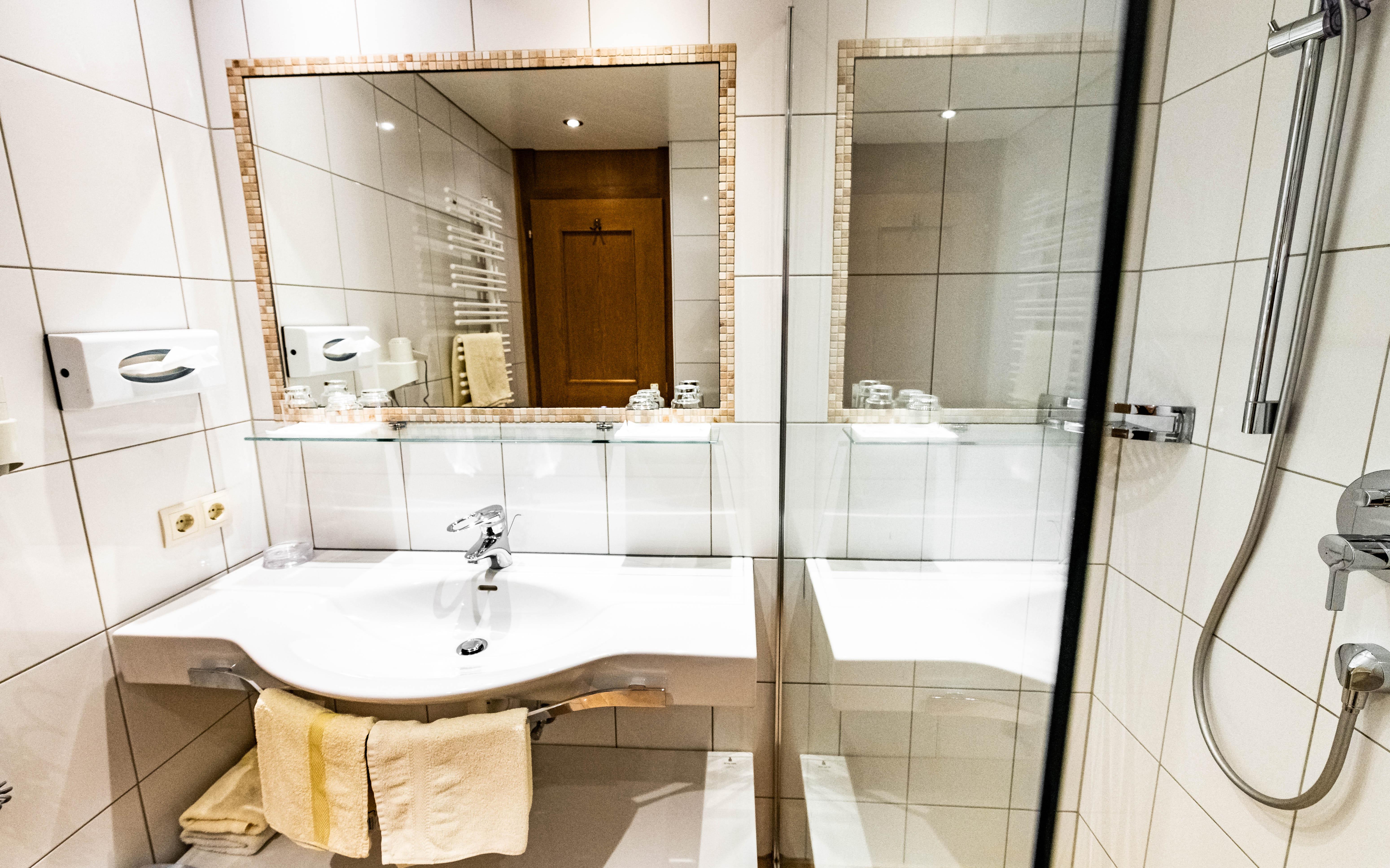 • 1 Badezimmer mit Dusche, Waschbecken, Haartrockner und Kosmetikspiegel und separatem WC