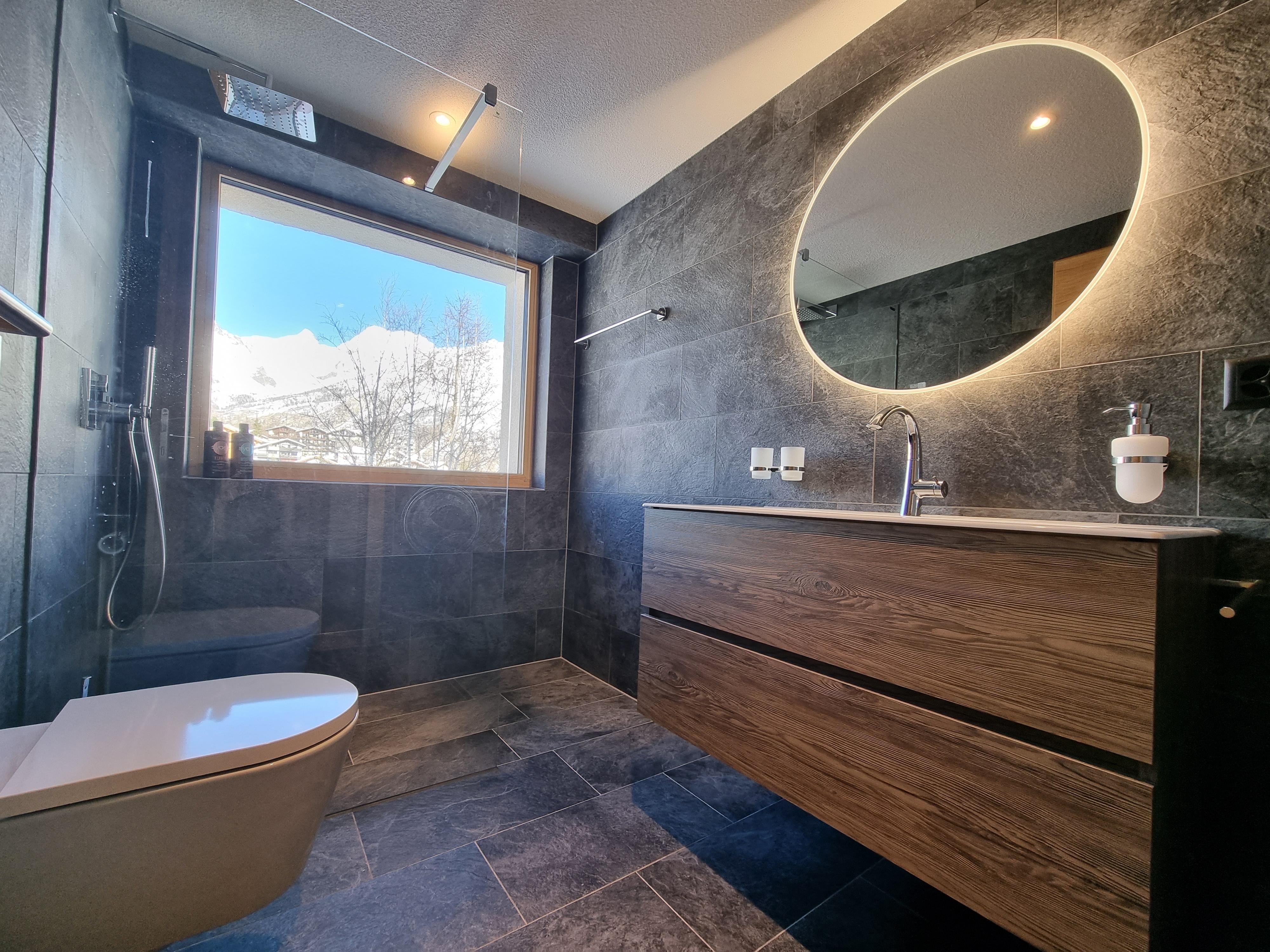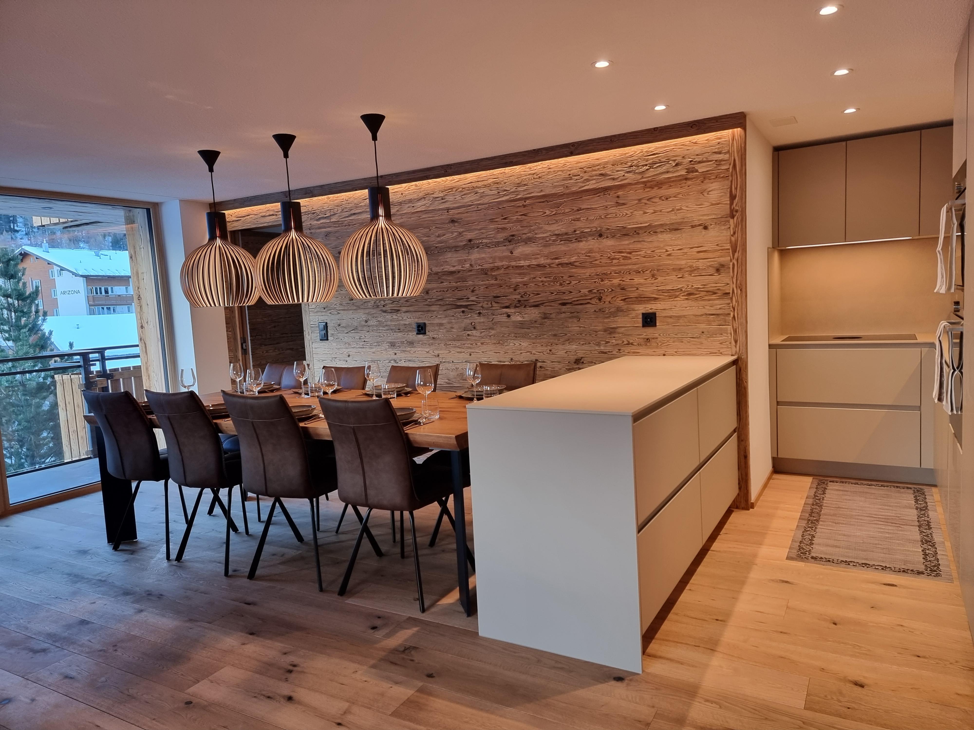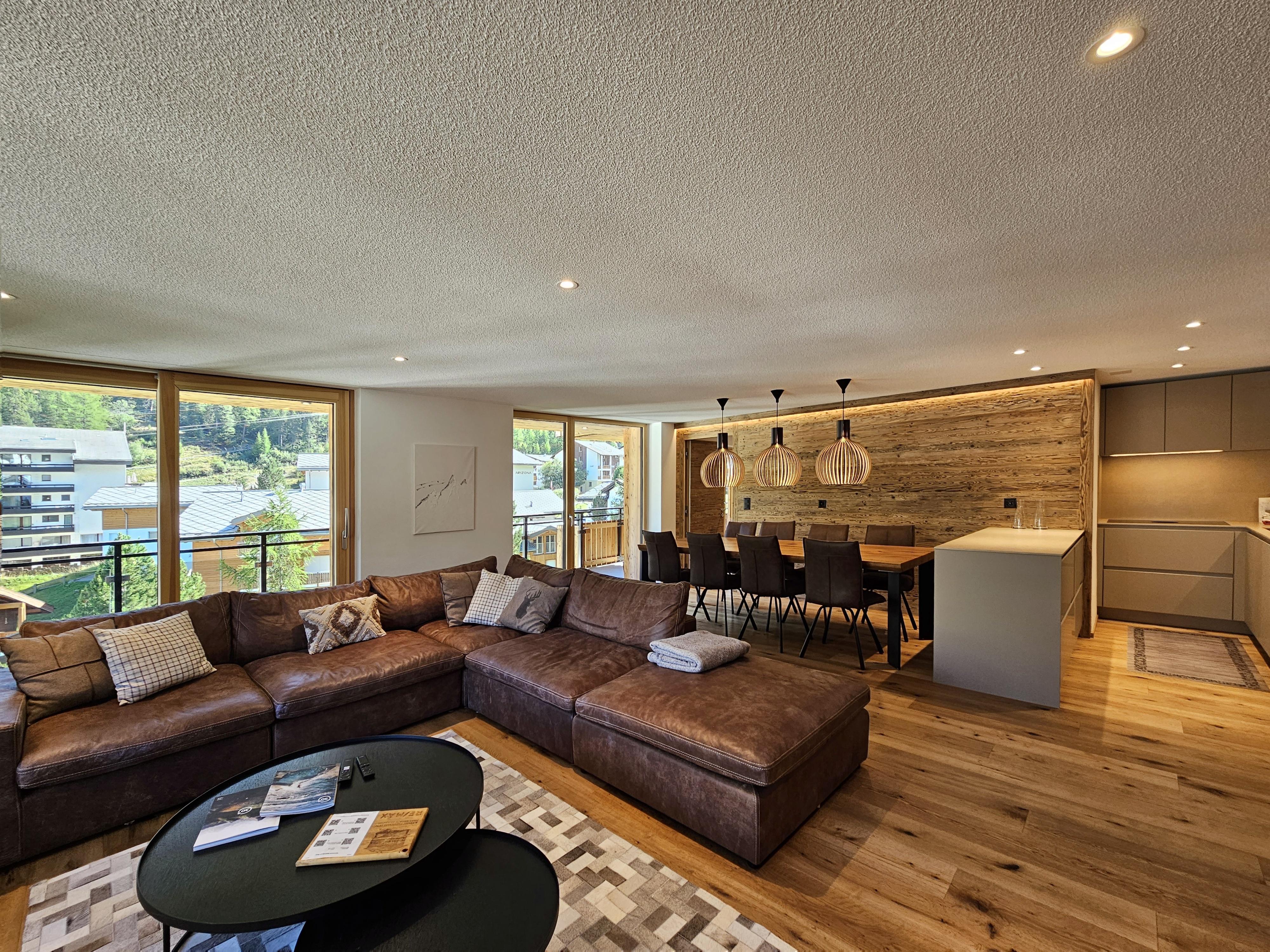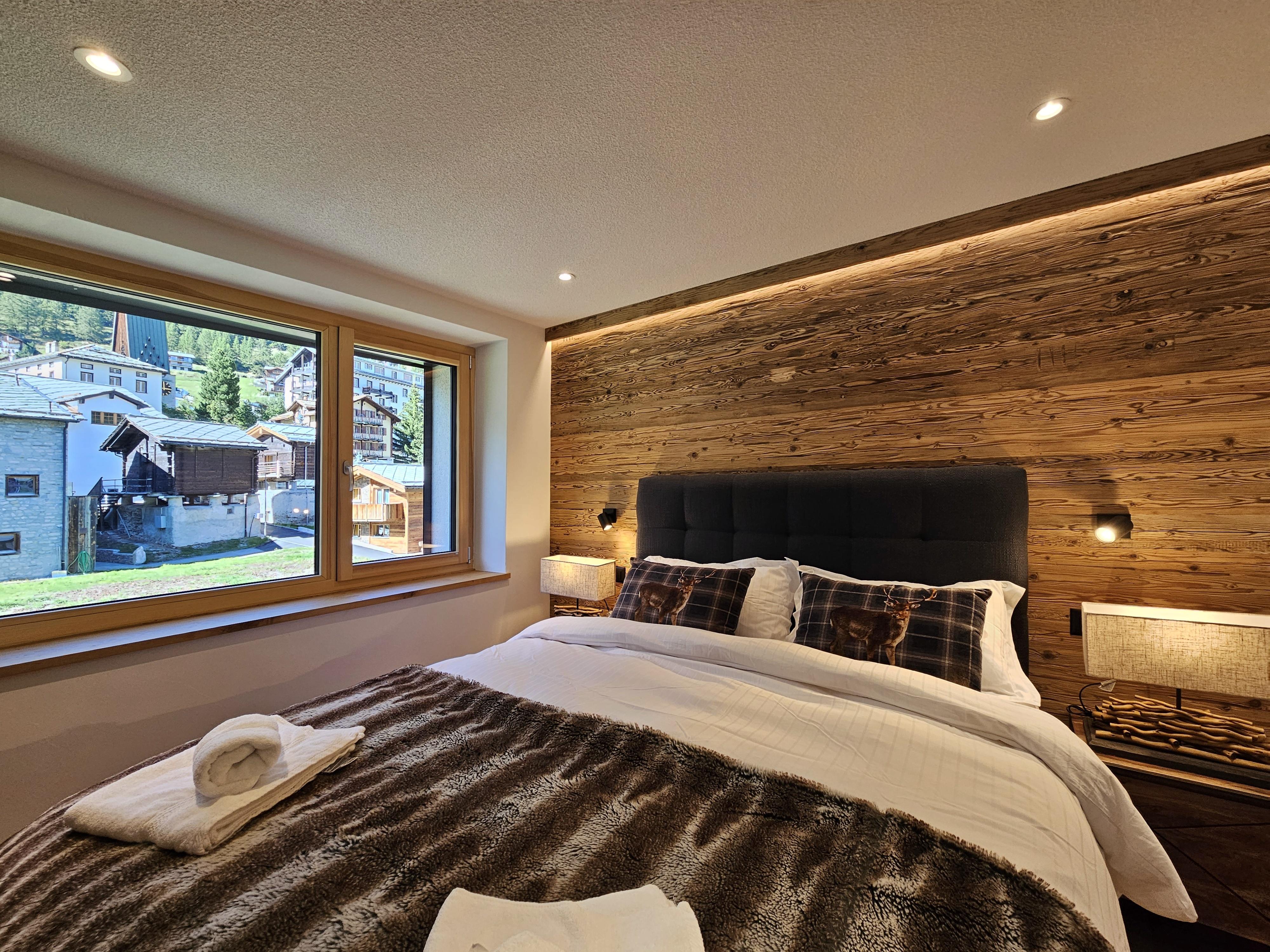 Die Wohnung befindet sich im 3.OG und hat 3 Schlafzimmer und 2 Badezimmer. 2 Schlafzimmer haben je ein Doppelbett und das 3. Schlafzimmer verfügt über 2 Kajütenbetten. Somit bietet die Wohnung Platz für 8 Personen, ideal für Familien mit Kindern. 1 Schlafzimmer verfügt über ein en-Suite Badezimmer mit Dusche/WC/Waschbecken. Die anderen 2 Schlafzimmer teilen sich 1 Badezimmer mit Dusche/WC/Waschbecken. Das Wohnzimmer ist im wunderschönen, luxuriösen Chalet-Chic style eingerichtet mit viel Holz. Der Kamin rundet diese Chalet Atmosphäre genauso perfekt ab, wie die Leseecke an den grossen Fenstern. Im Wohnzimmer befindet sich auch die offene, top moderne Küche. In der Wohnung befindet sich auch ein praktischer Waschturm.
