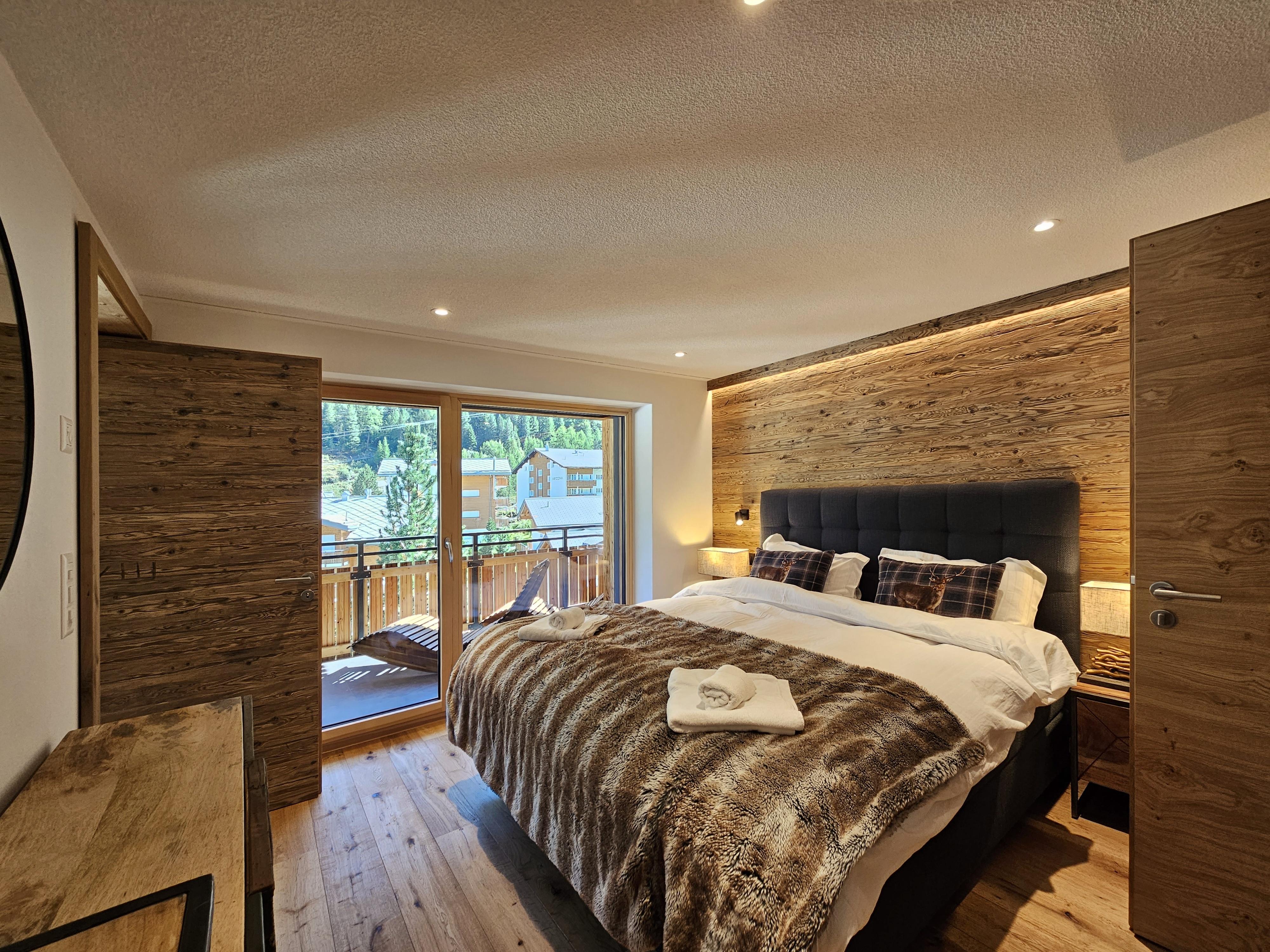 Vom Wohnzimmer und auch Master Schlafzimmer hat man einen Ausgang zum östlich ausgerichteten Balkon. Zum Apartment gehört ein privater Skischrank.