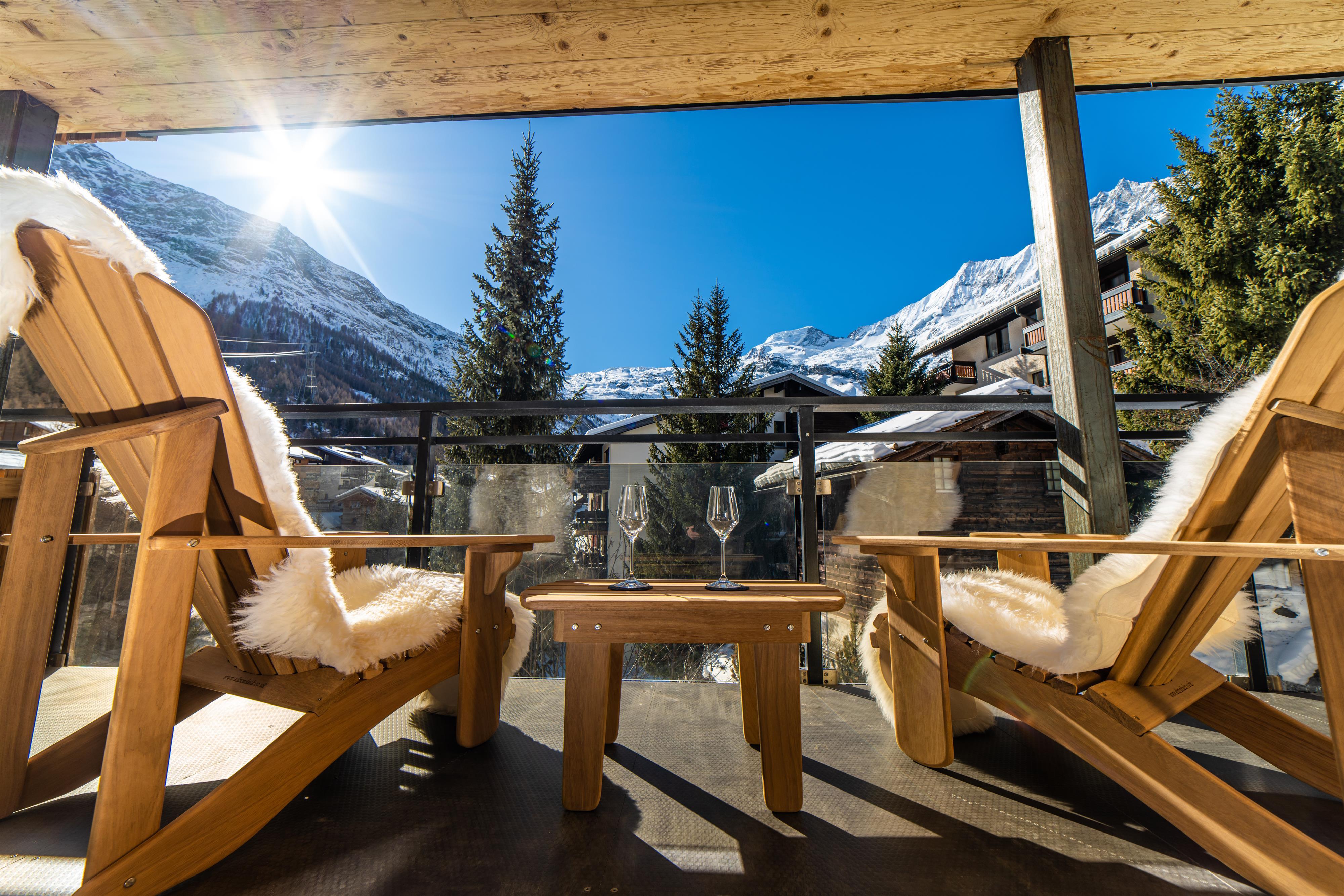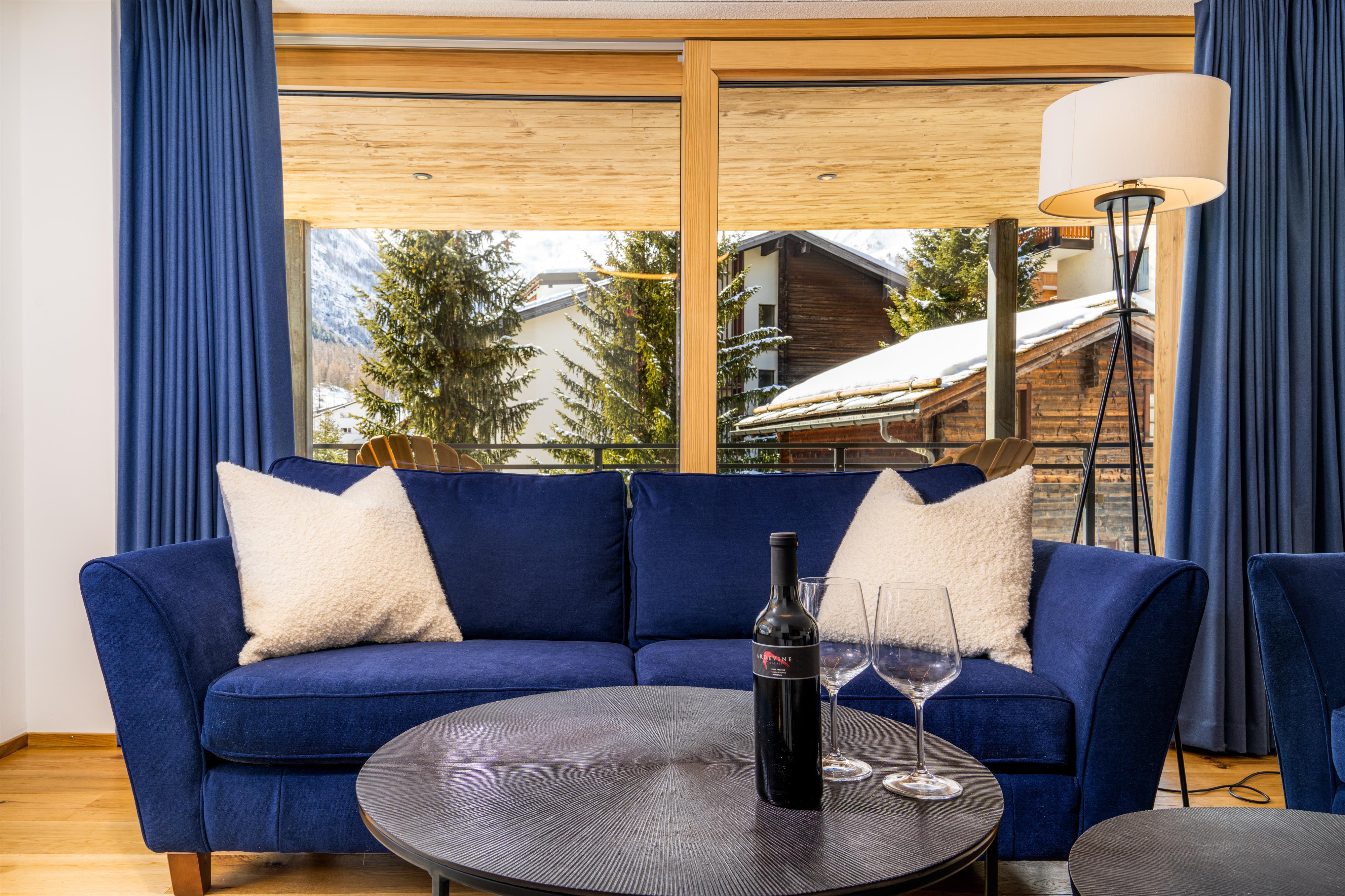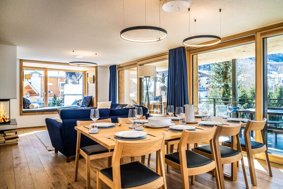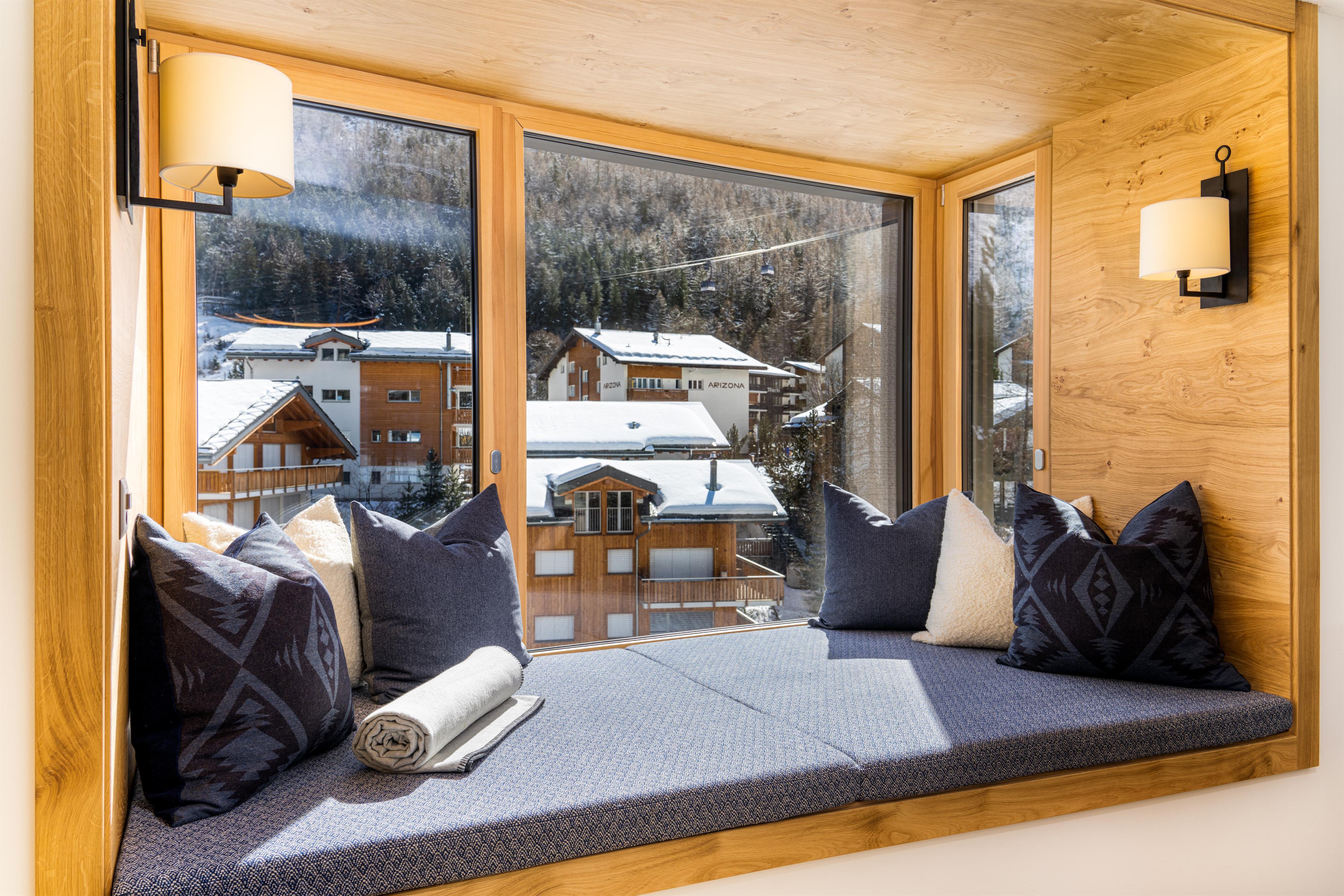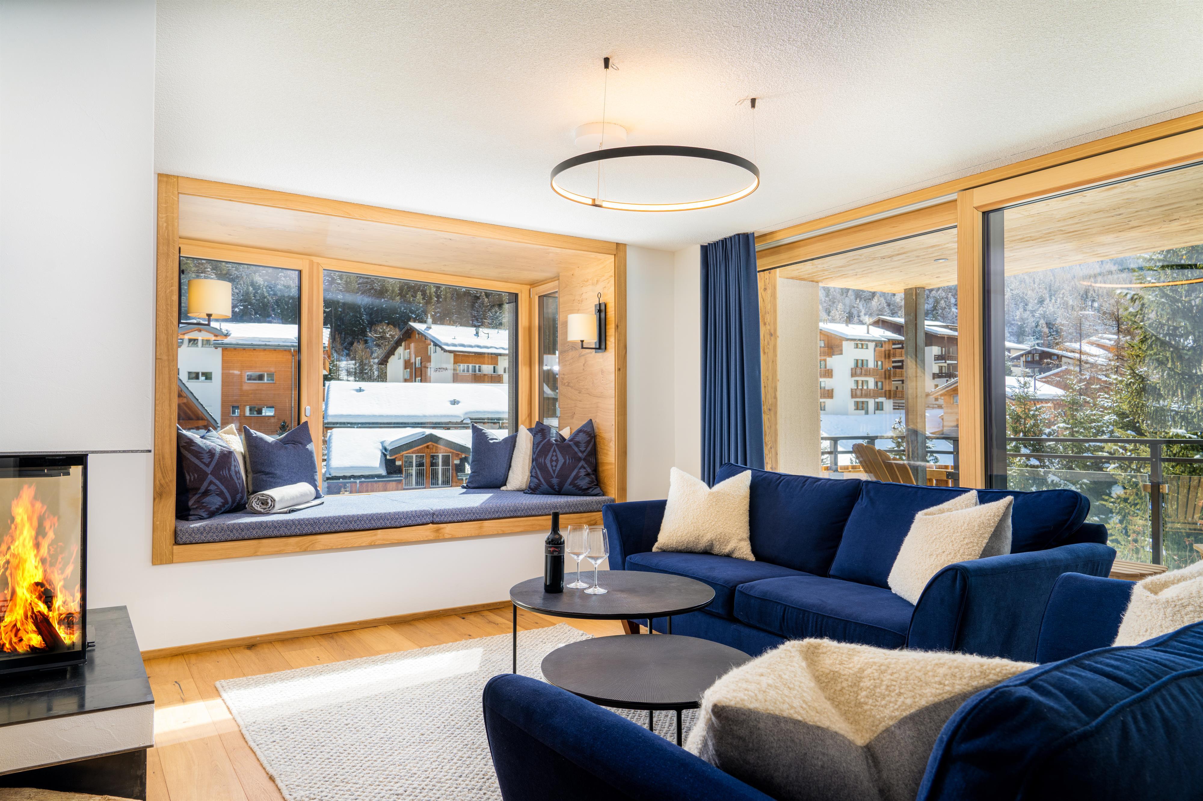 - Das Wohnzimmer ist in einem schönen, luxuriösen Chalet-Chic-Stil mit viel Holz eingerichtet. Der Kamin rundet diese Chalet-Atmosphäre ebenso perfekt ab wie die Leseecke mit Panoramafenstern.