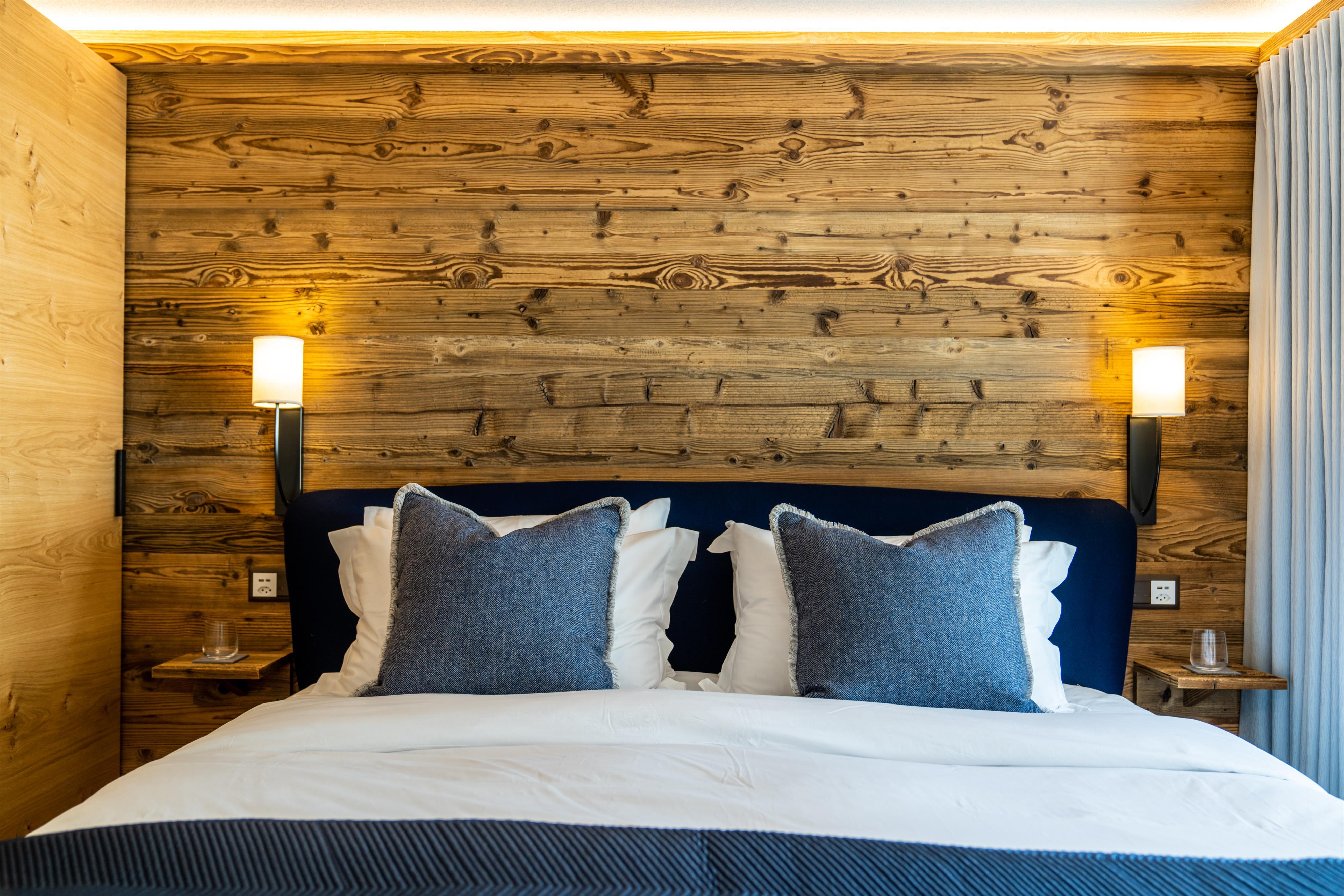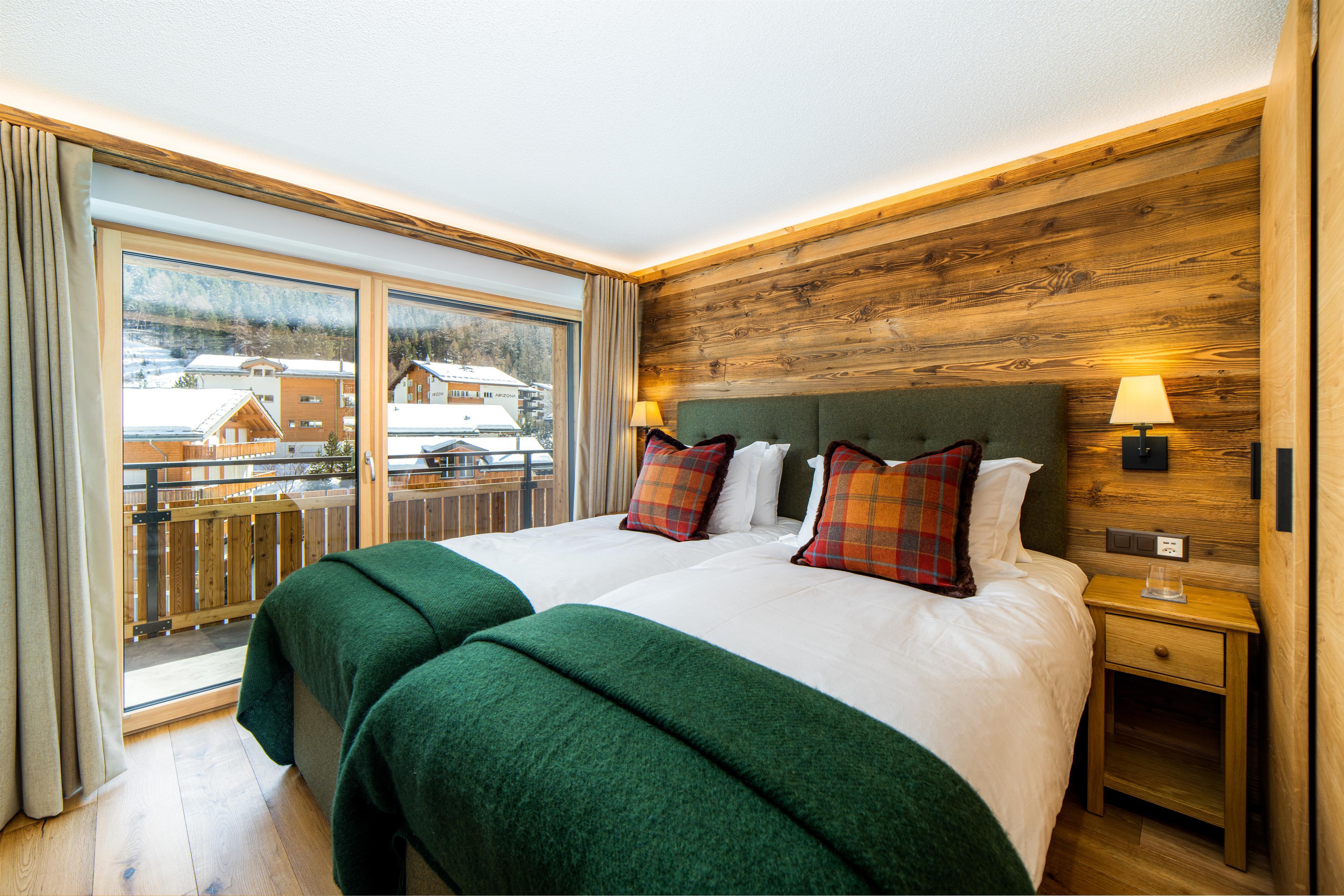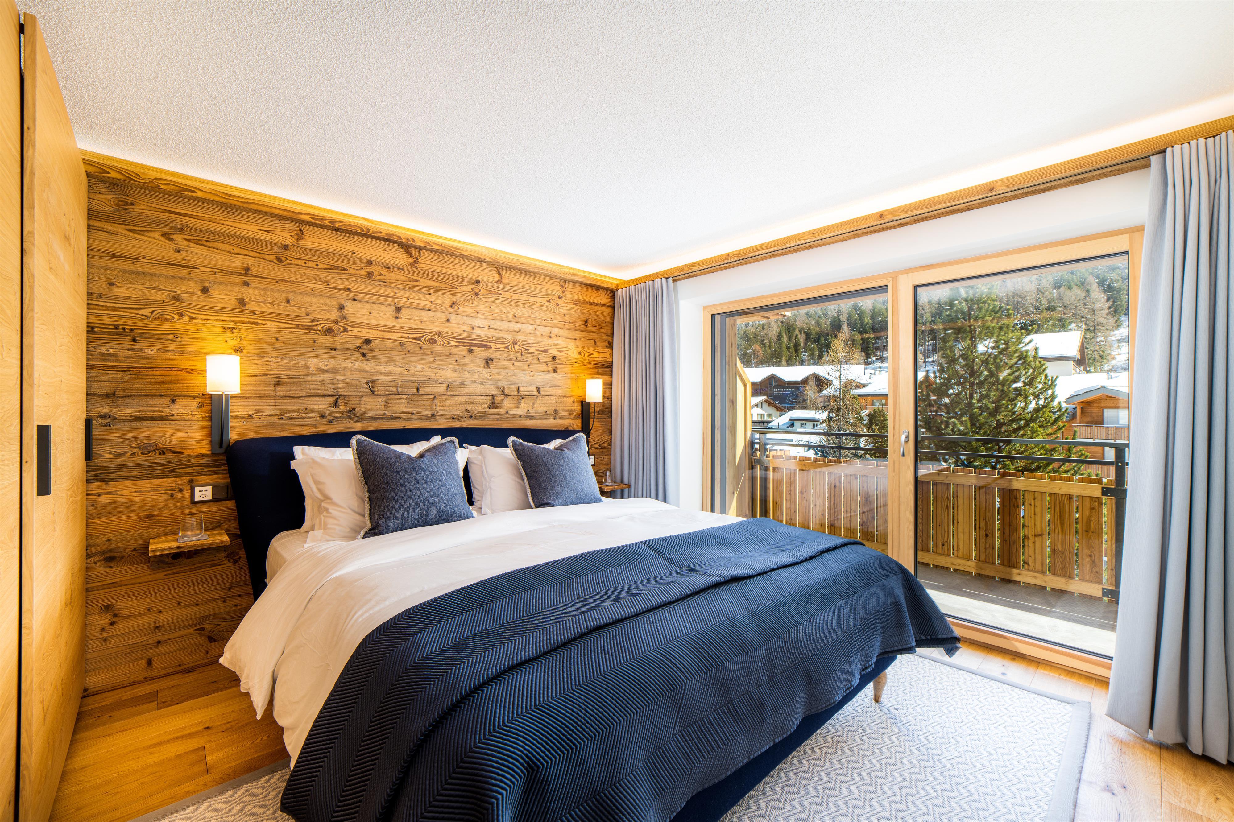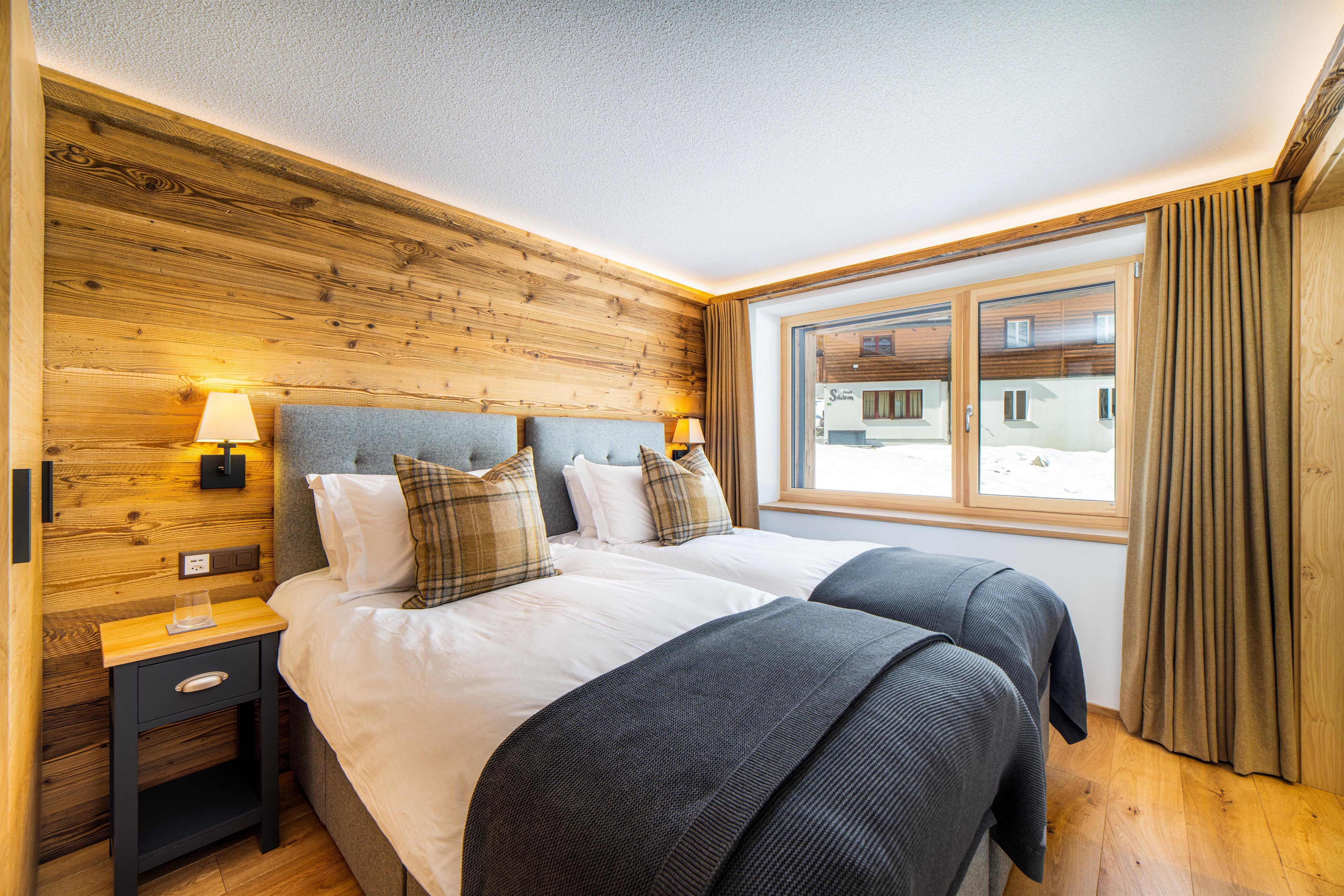 - Das Wohnzimmer ist in einem schönen, luxuriösen Chalet-Chic-Stil mit viel Holz eingerichtet. Der Kamin rundet diese Chalet-Atmosphäre ebenso perfekt ab wie die Leseecke mit Panoramafenstern.