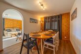 Esszimmer und voll ausgestattete Küche.