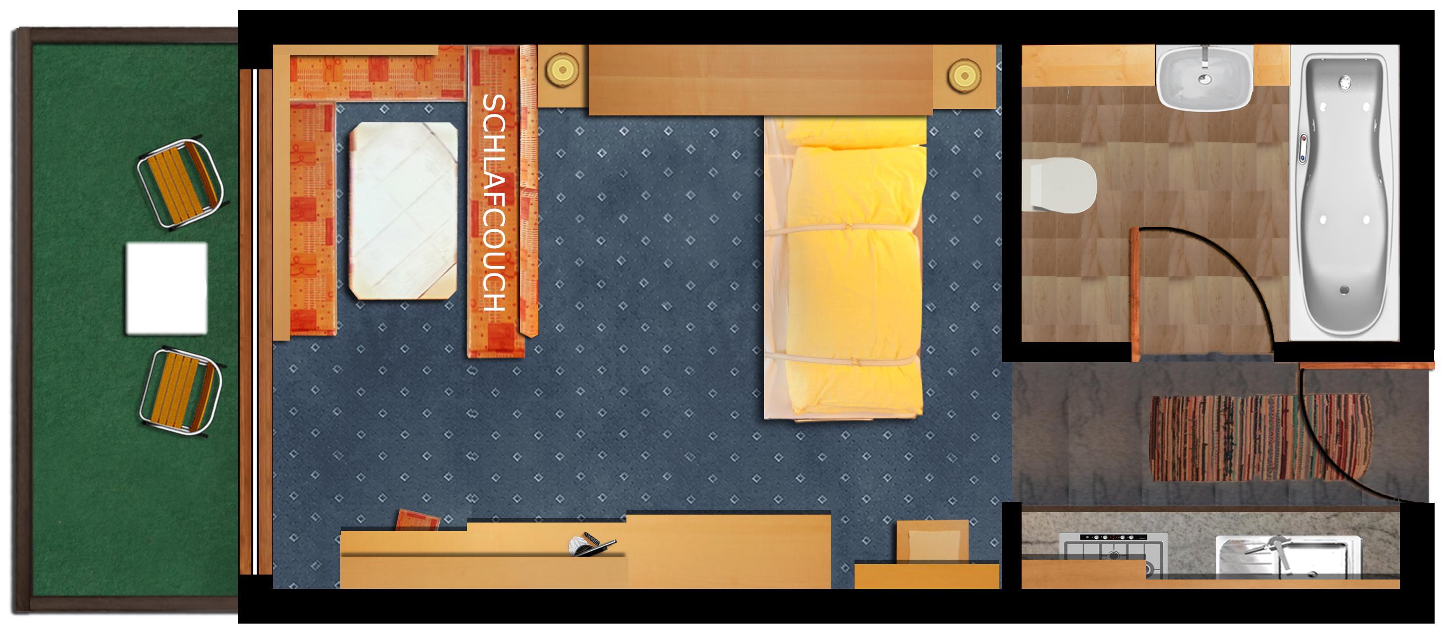 APPARTEMENT FÜR 2 PERSONEN 31 qm Gemütlicher Wohn-/Schlafraum, Bad oder Dusche/WC und Balkon.