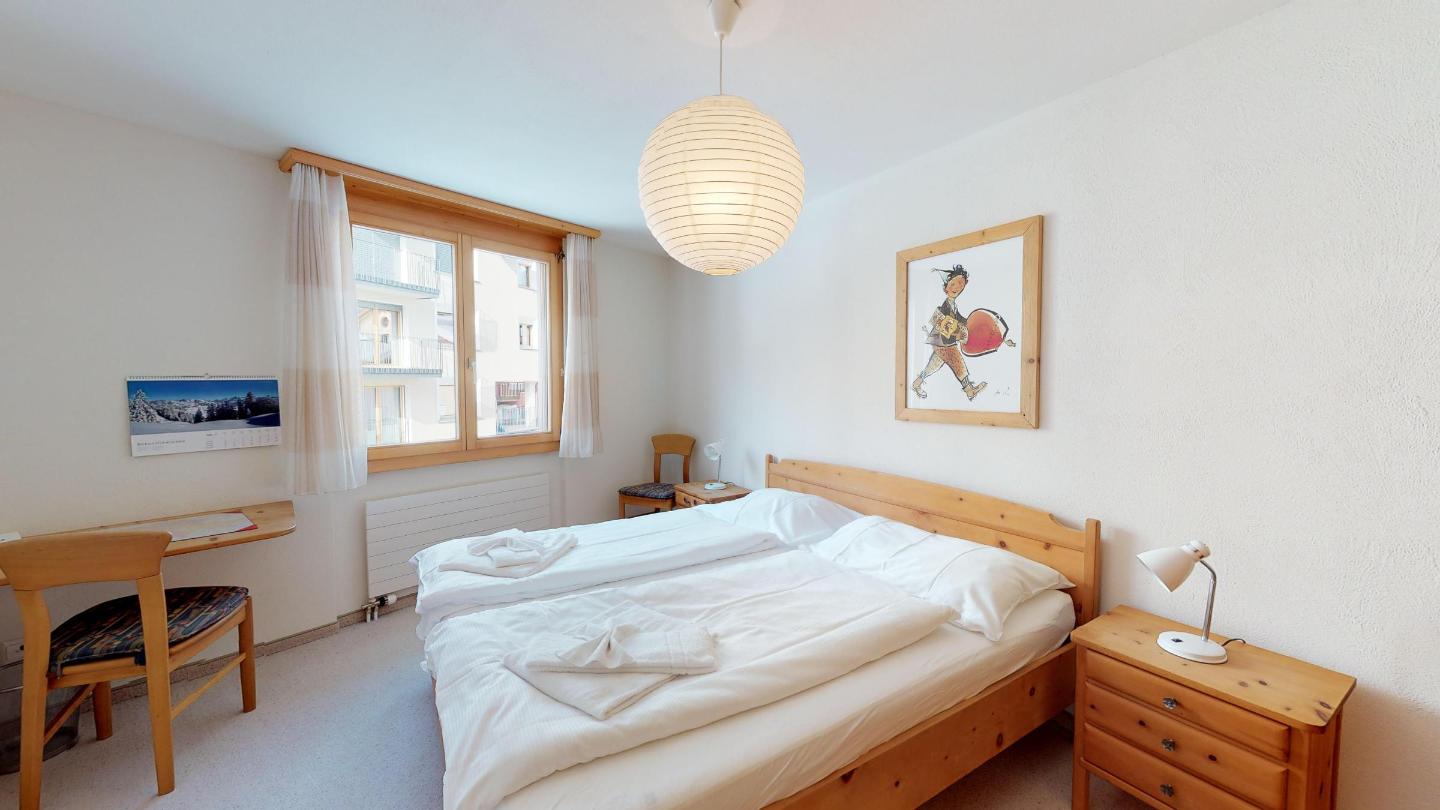 Ansprechende und helle 3-Zimmerwohnung mit wunderschöner Berg- und Seesicht. Ca. 85 m² im 2. Stock. Eingang mit Garderobe. Ganze Wohnung mit Teppichboden. Helles und grosszügiges Wohn-/Esszimmer mit offener Küche (Mikrowelle und Raclette-Ofen) und Ausgang auf den Balkon (südliche Ausrichtung). Badezimmer mit Dusche, Lavabo und WC. Doppelschlafzimmer (2 Einzelmatratzen 90x200) mit kleinem Schreibtisch in schönem Holzausbau. Zweibettzimmer (2x90x200) mit Schreibnische ebenfalls in Holz. 1 Garage. Haustiere sind nicht erlaubt. Nichtraucher.