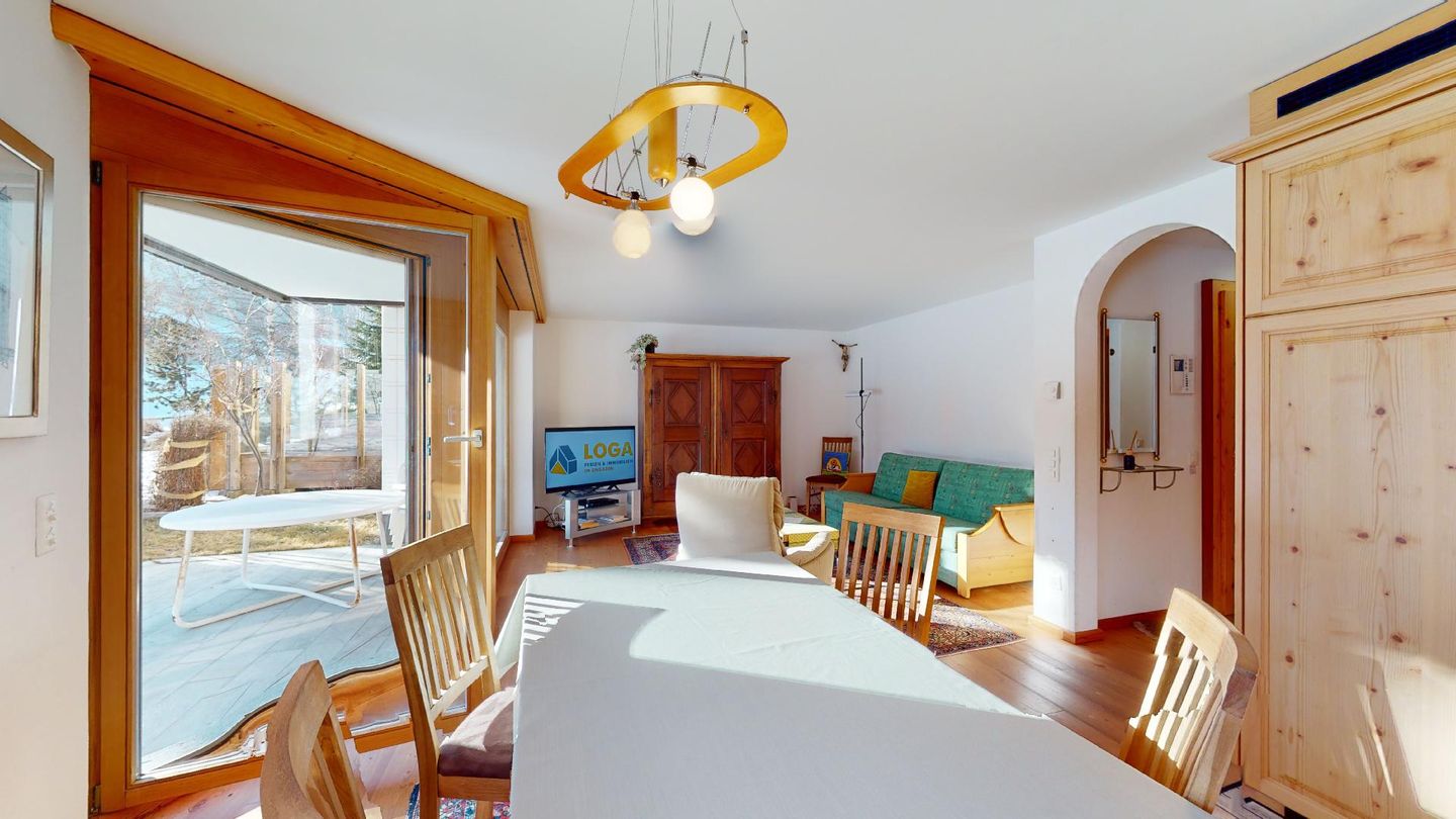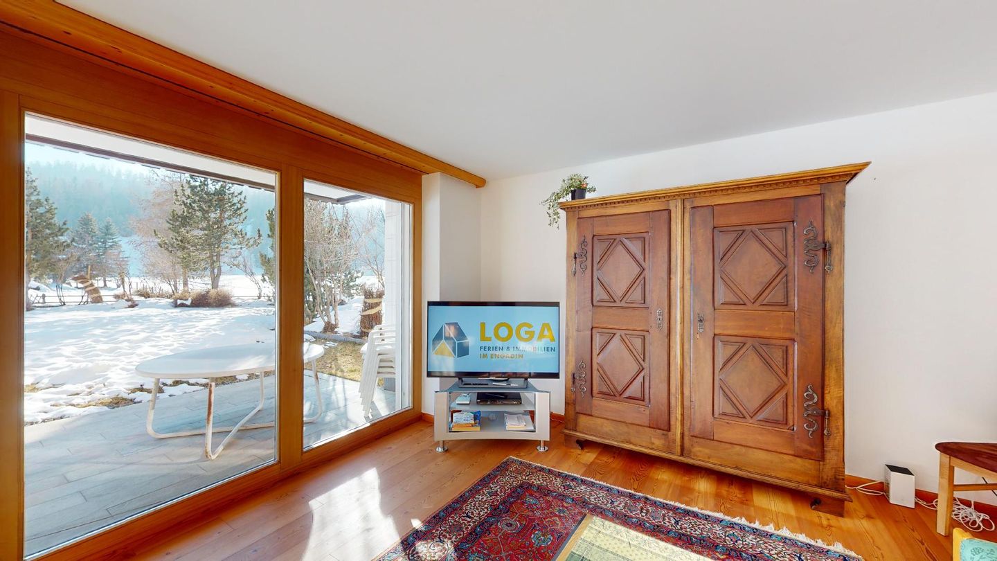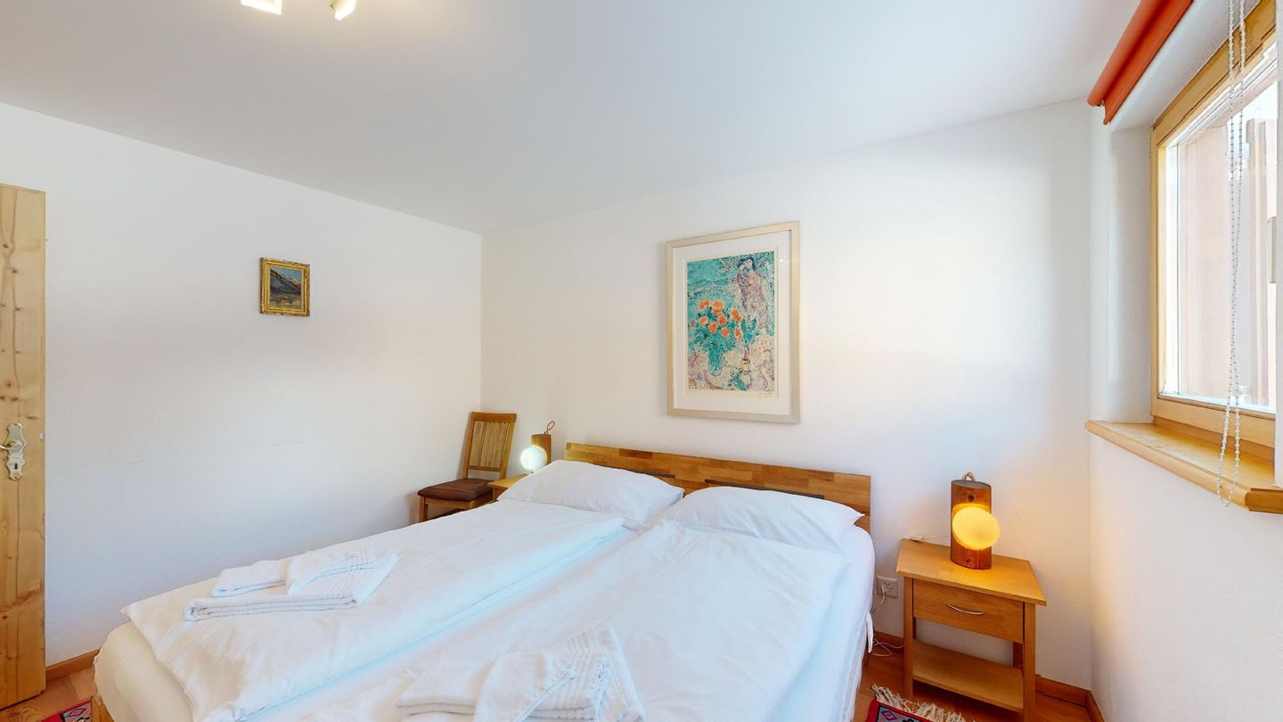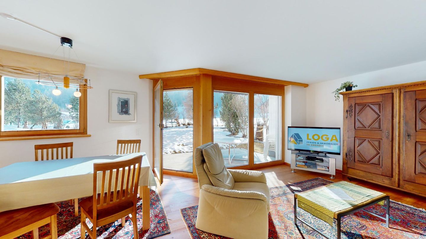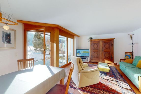 2-Zimmerwohnung im Erdgeschoss, mit ca. 60 m2. Eingang mit Garderobe. Ess-/ Wohnzimmer mit Schlafsofa (zwei Einzelmatratzen) und direktem Ausgang zum Gartensitzplatz. Offene Küche mit Backofen, Mikrowelle, Chicco d'Oro Kaffeemaschine, Geschirrspüler, Racletteofen und Kühlschrank. Ein Doppelzimmer (2x 90cm x 200cm). Radio, CD-Player, TV, DVD, Internet. Dusche (behindertengerecht), WC, Lavabo mit Fenster. Komfortable Einrichtung. Garagenplatz. Waschküche und Skiraum zur Mitbenützung. Haustiere sind nicht erlaubt. Speziell: Sauna und Aufenthalts- Spielraum im Haus.