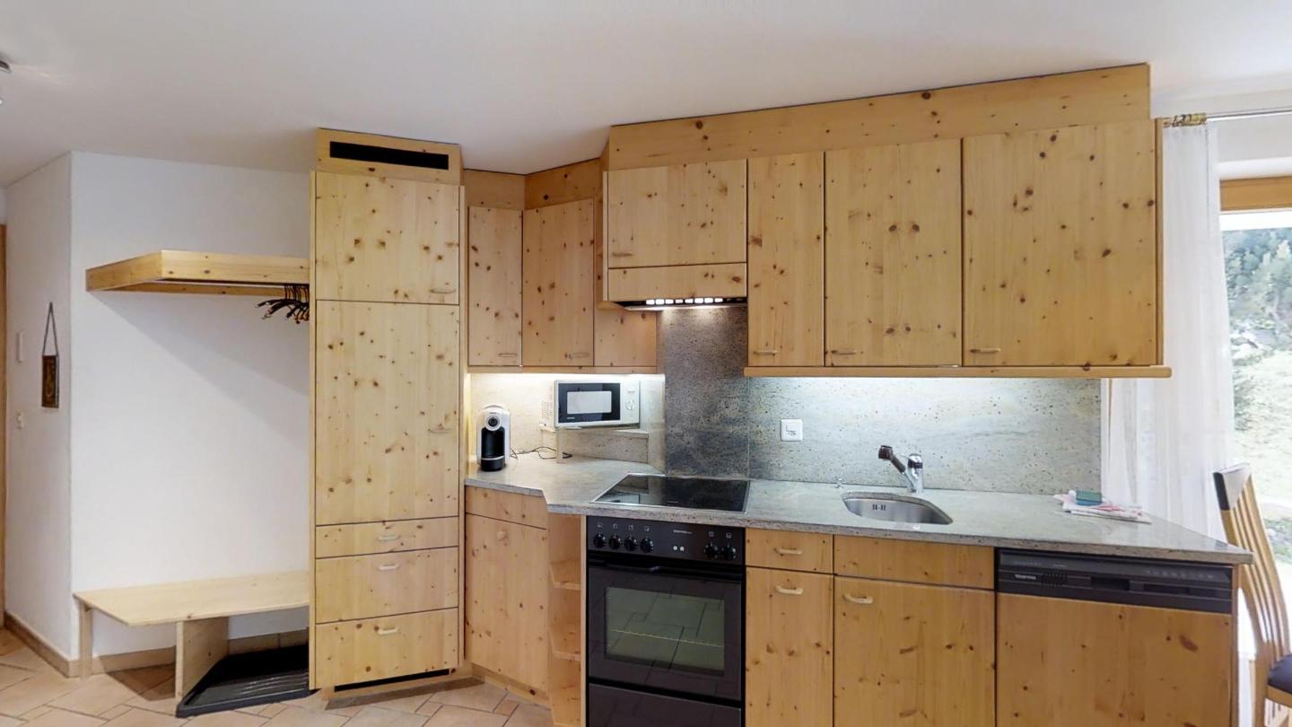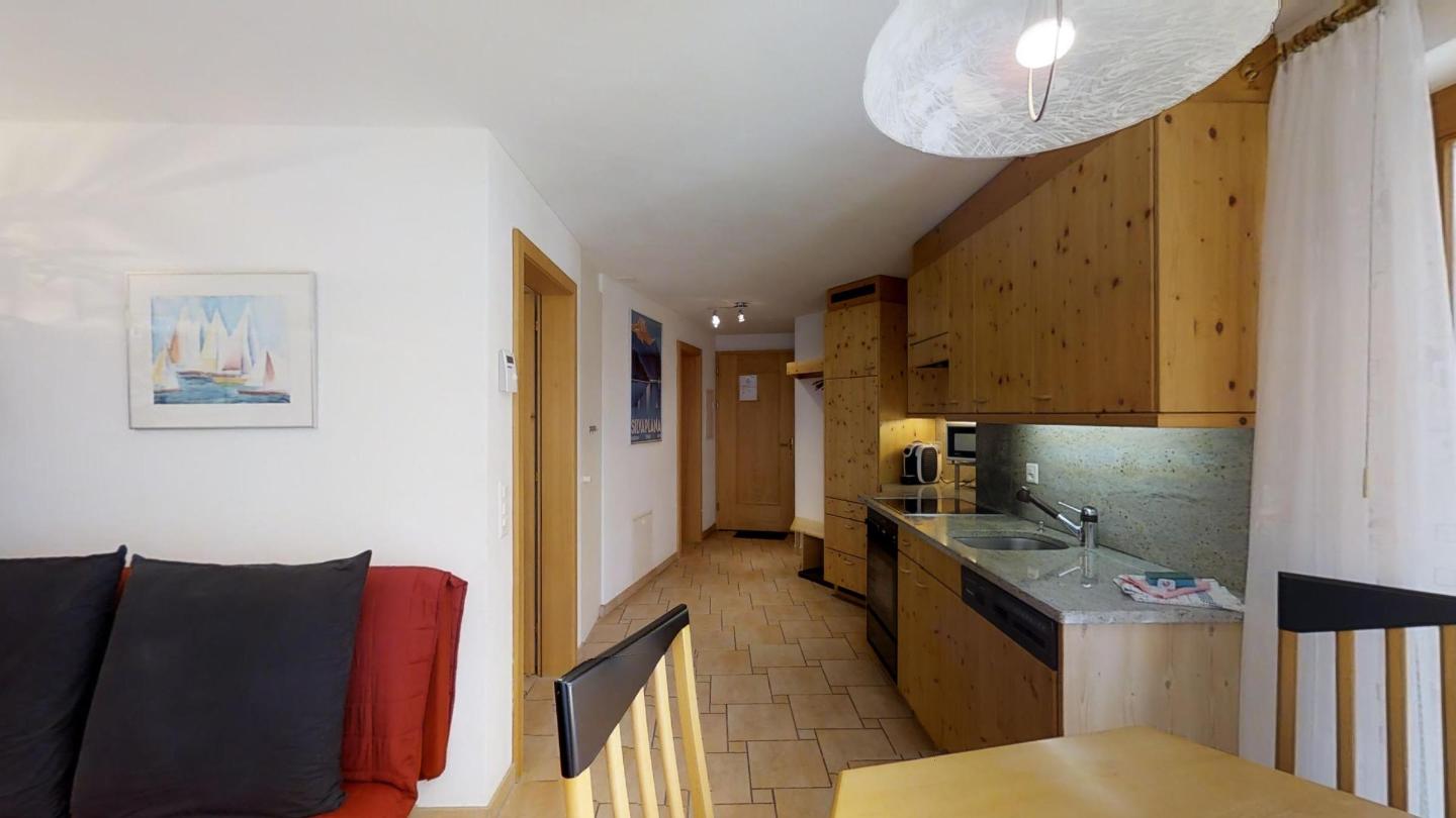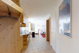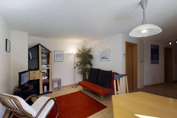 2½-Zimmerwohnung im Erdgeschoss, 53 m2. Entree mit Garderobe, Wohnzimmer mit zwei Schlafmöglichkeiten (Schlafsofa 160x200). Radio, Fernseher und Telefon. Offene Küche mit Backofen, Geschirrspüler und Mikrowelle. CHICCO D'ORO Kaffeemaschine. Fondue-Geschirr vorhanden. Abdeckung in Naturstein. Doppelzimmer (Doppelbett 160x210). Bad/WC/Lavabo. Sitzplatz mit Natursteinplatten. Abendsonne. Neue, komfortable Einrichtung. Garagenplatz. Waschküche und Skiraum zur Mitbenützung. Haustiere sind erlaubt.