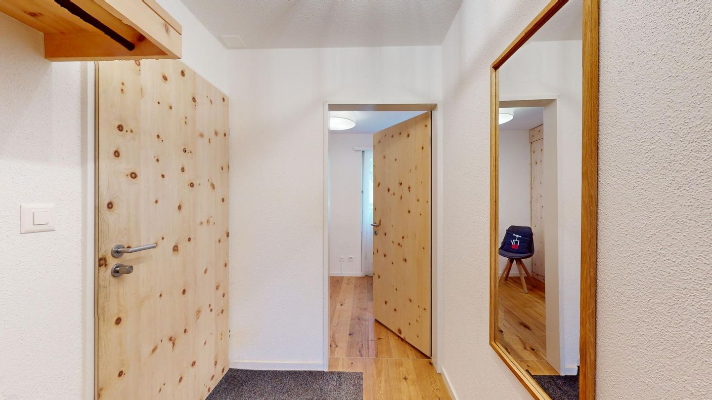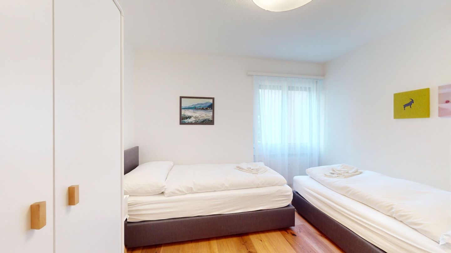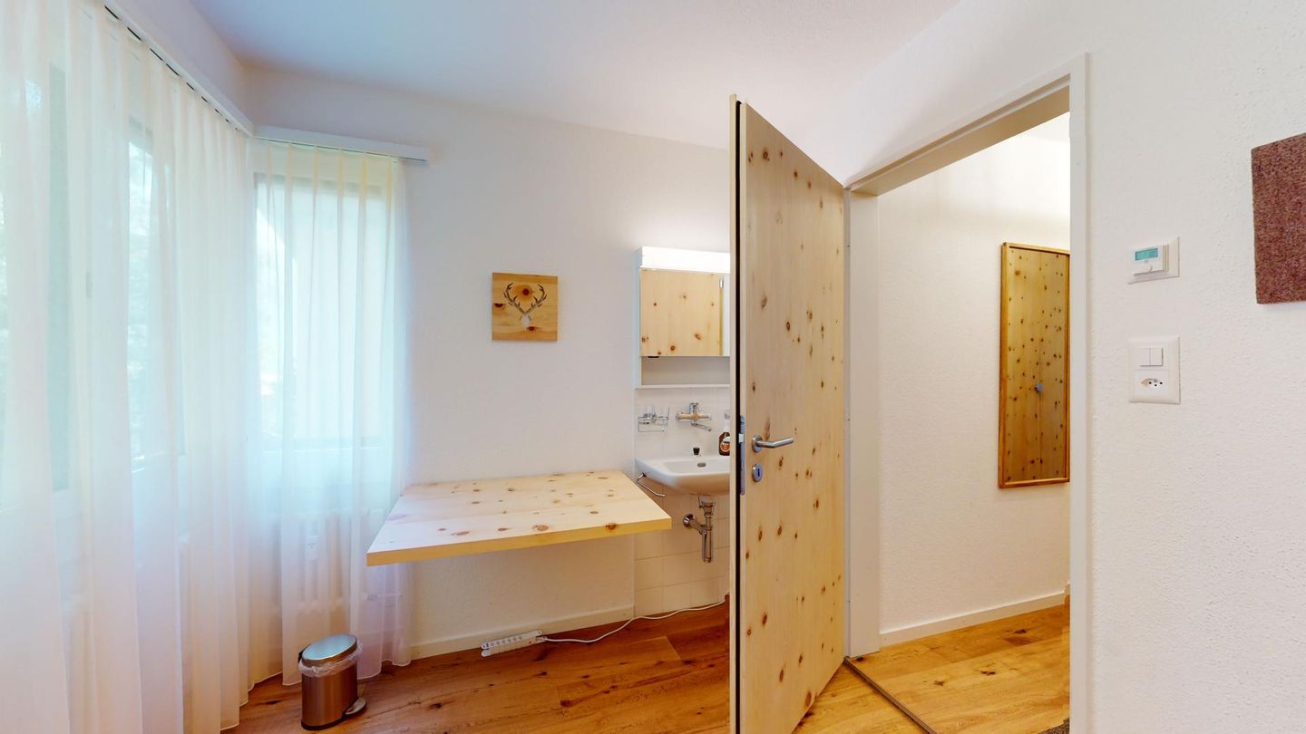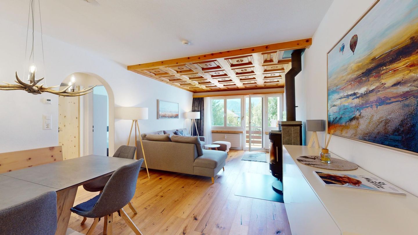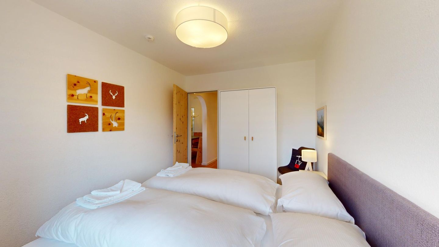 4-Zimmerwohnung im erhöhten Erdgeschoss, 80m². Entree mit Garderobe. Wohn-/ Esszimmer mit Kamin. Südbalkon mit Bergsicht. Separate Küche mit Backofen, Kühlschrank, Chicco d'Oro Kaffeemaschine und Geschirrspülmaschine. Schlafzimmer mit zwei Einzelbetten. Ein Schlafzimmer mit einem Doppelbett. Bürozimmer. Dusche/WC/Lavabo. Bad/WC/Lavabo. TV, Radio und Internet. Erstklassige und moderne Einrichtung. Holzböden in den Schlaf- und Wohnzimmern. Zur Wohnung gehört auch eine private Garagenbox (Einfahrt max. 2.2m breit, 1.9m hoch) für ein Fahrzeug. Ski und Skischuhe können im Skiraum oder in der Garage deponiert werden. Haustiere und Rauchen sind nicht erlaubt.