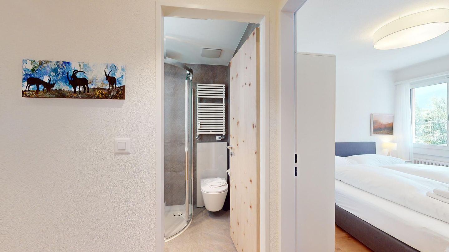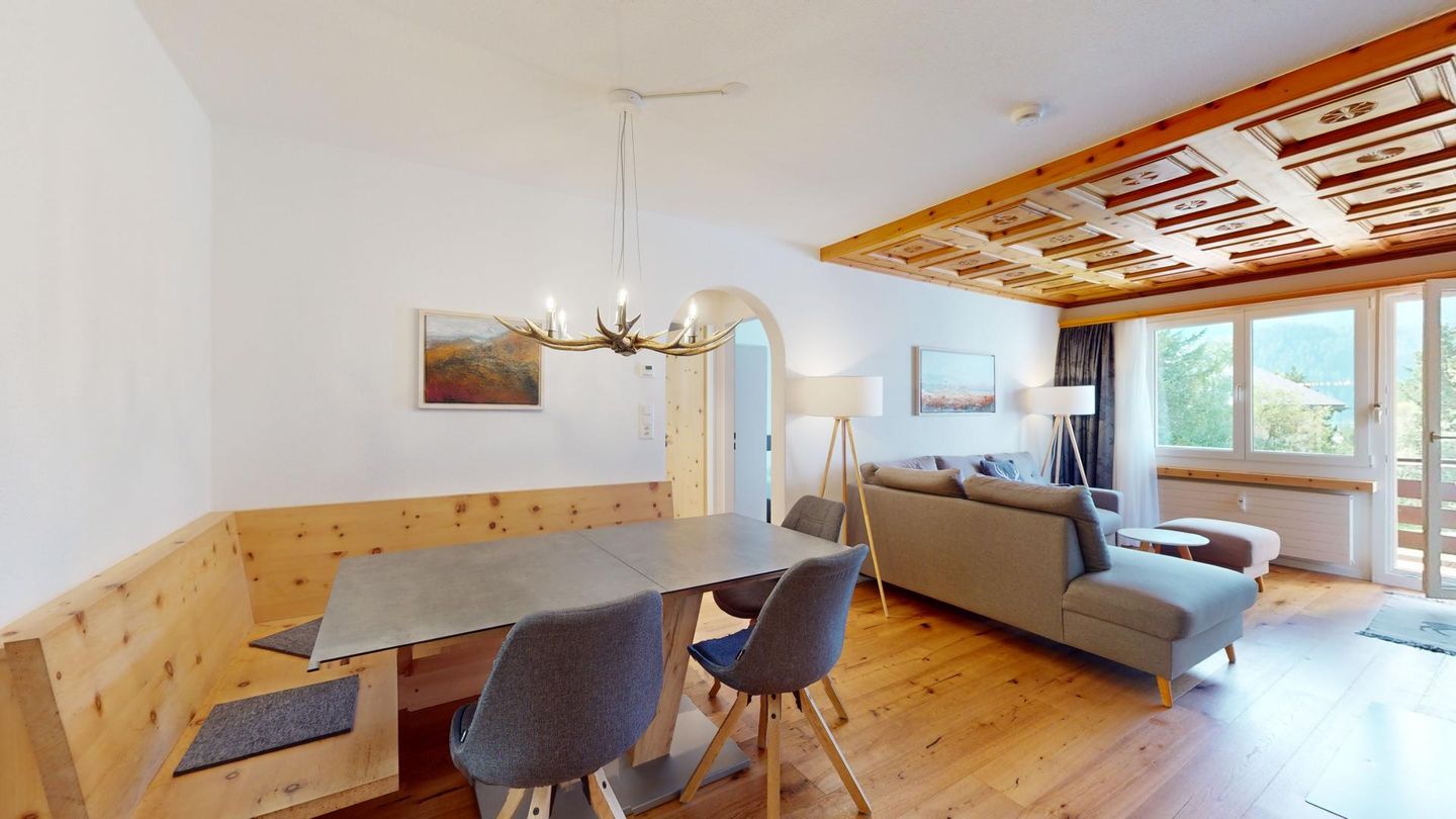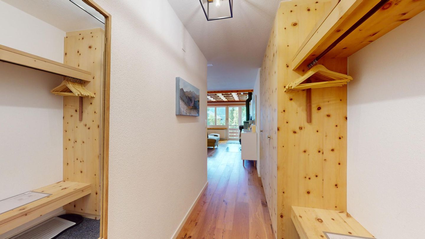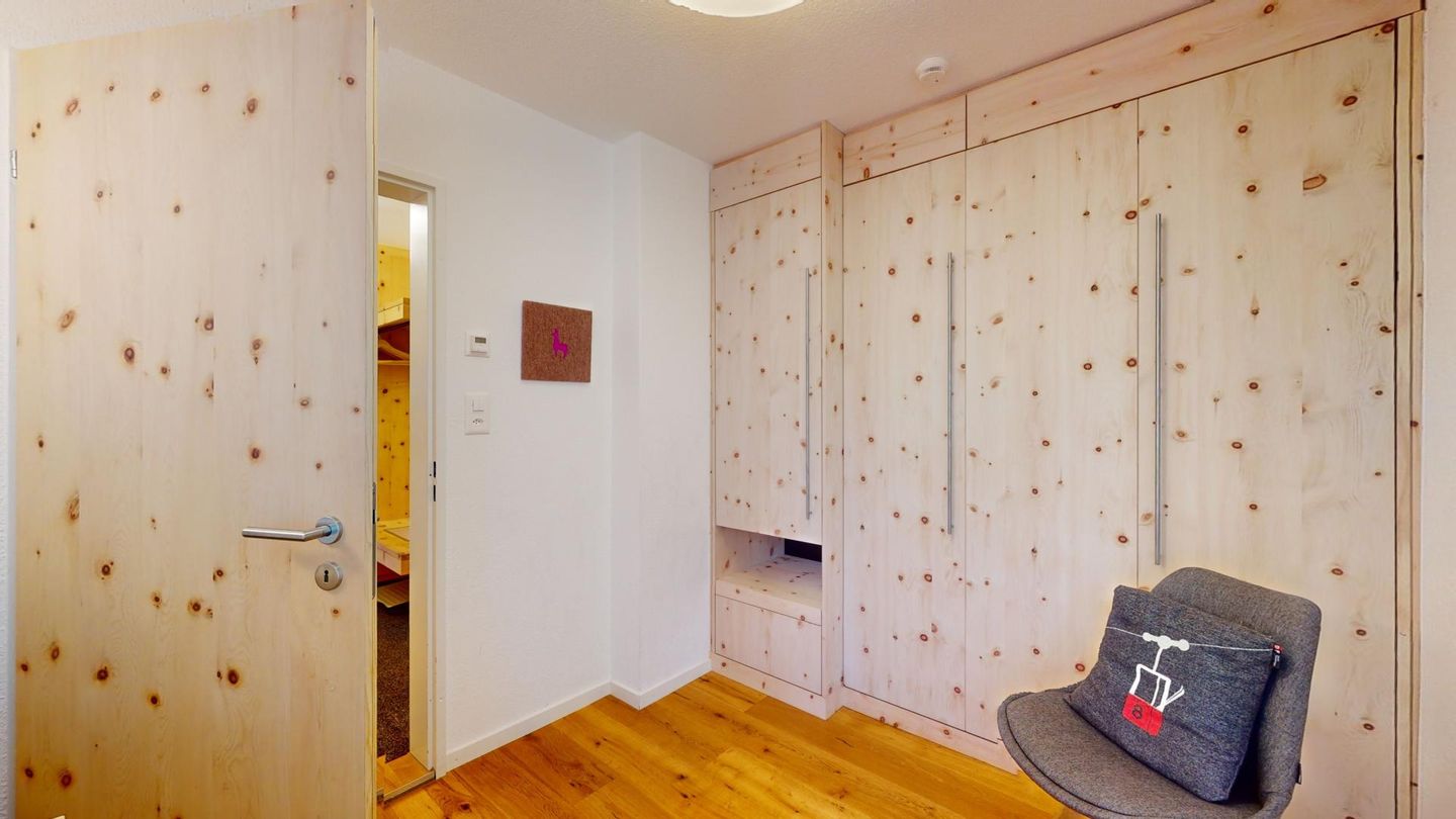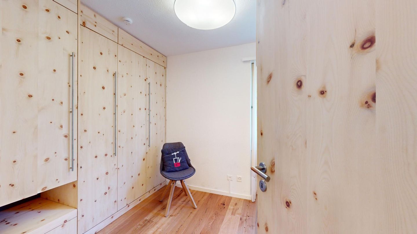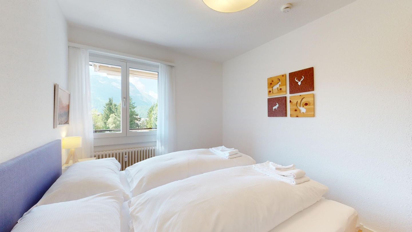4-Zimmerwohnung im erhöhten Erdgeschoss, 80m². Entree mit Garderobe. Wohn-/ Esszimmer mit Kamin. Südbalkon mit Bergsicht. Separate Küche mit Backofen, Kühlschrank, Chicco d'Oro Kaffeemaschine und Geschirrspülmaschine. Schlafzimmer mit zwei Einzelbetten. Ein Schlafzimmer mit einem Doppelbett. Bürozimmer. Dusche/WC/Lavabo. Bad/WC/Lavabo. TV, Radio und Internet. Erstklassige und moderne Einrichtung. Holzböden in den Schlaf- und Wohnzimmern. Zur Wohnung gehört auch eine private Garagenbox (Einfahrt max. 2.2m breit, 1.9m hoch) für ein Fahrzeug. Ski und Skischuhe können im Skiraum oder in der Garage deponiert werden. Haustiere und Rauchen sind nicht erlaubt.