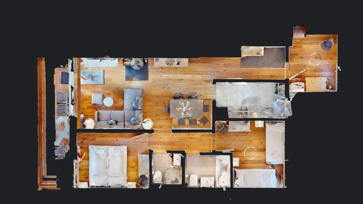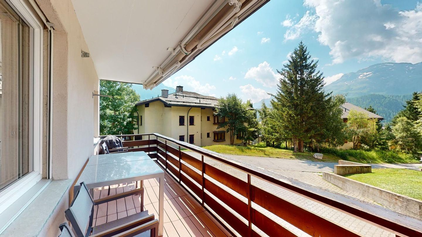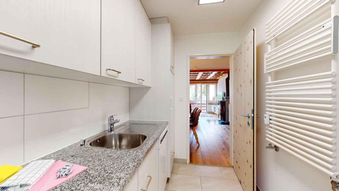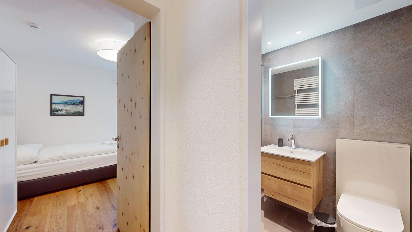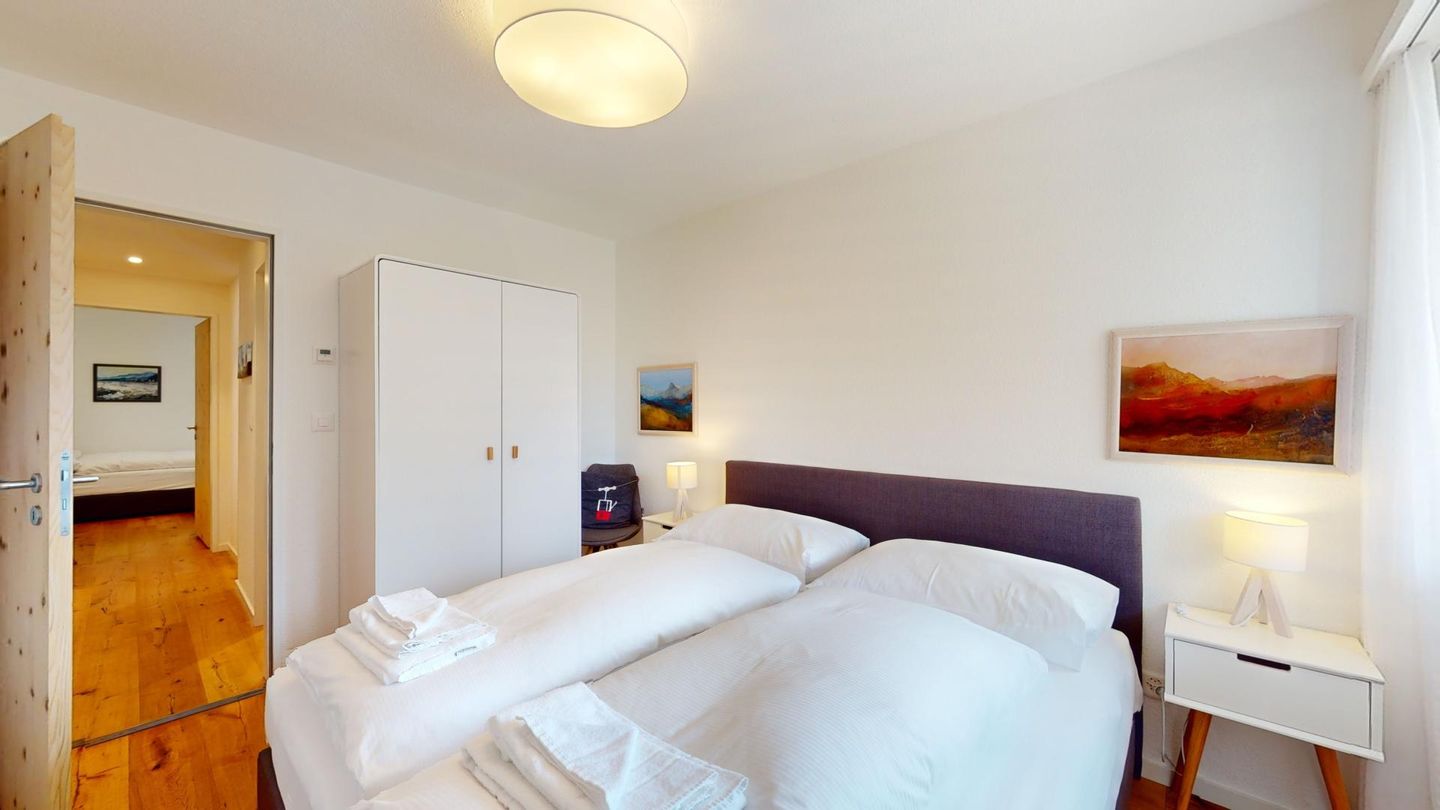 4-Zimmerwohnung im erhöhten Erdgeschoss, 80m². Entree mit Garderobe. Wohn-/ Esszimmer mit Kamin. Südbalkon mit Bergsicht. Separate Küche mit Backofen, Kühlschrank, Chicco d'Oro Kaffeemaschine und Geschirrspülmaschine. Schlafzimmer mit zwei Einzelbetten. Ein Schlafzimmer mit einem Doppelbett. Bürozimmer. Dusche/WC/Lavabo. Bad/WC/Lavabo. TV, Radio und Internet. Erstklassige und moderne Einrichtung. Holzböden in den Schlaf- und Wohnzimmern. Zur Wohnung gehört auch eine private Garagenbox (Einfahrt max. 2.2m breit, 1.9m hoch) für ein Fahrzeug. Ski und Skischuhe können im Skiraum oder in der Garage deponiert werden. Haustiere und Rauchen sind nicht erlaubt.