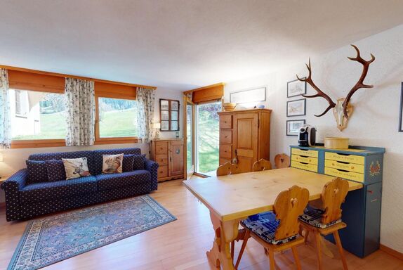 2-Zimmerwohnung im Erdgeschoss, ca. 40 m2. Entree mit Garderobe. Dusche/WC/Lavabo. Zimmer mit französischem Bett. Wohn-/Esszimmer mit Sofabett, Satelliten-Fernseher und direktem Ausgang auf den Sitzplatz. Offene Küche mit Backofen. Laminatboden. Gemütliche Einrichtung. 1 Garagenplatz. Haustiere sind nicht erlaubt.
