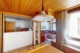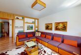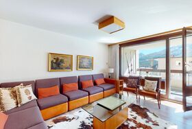 Wohnbereich: Grosses Wohnzimmer mit neu renovierter Boiserie, 8-Sitzer-Sofa + 40er Jahre Designstühlen. Vintage-Bildergalerie. Zugang zur Panoramaterrasse mit Tisch und Stühlen, mit herrlichem Blick auf die Berge und das Dorf. Wifi, Smart TV, Radio, DVD-Player. Essbereich mit Tisch 8 Sitzplätze. Vintage-Bildergalerie. Hochstuhl für Kinder; Separate Küche mit Essenspassagen zum Essbereich.