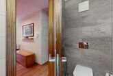 Grosser Flur, mit Teppich, typischen Möbeln und Kleiderschränken. Badezimmer mit WC und Dusche und elektrischem Handtuchwärmer.