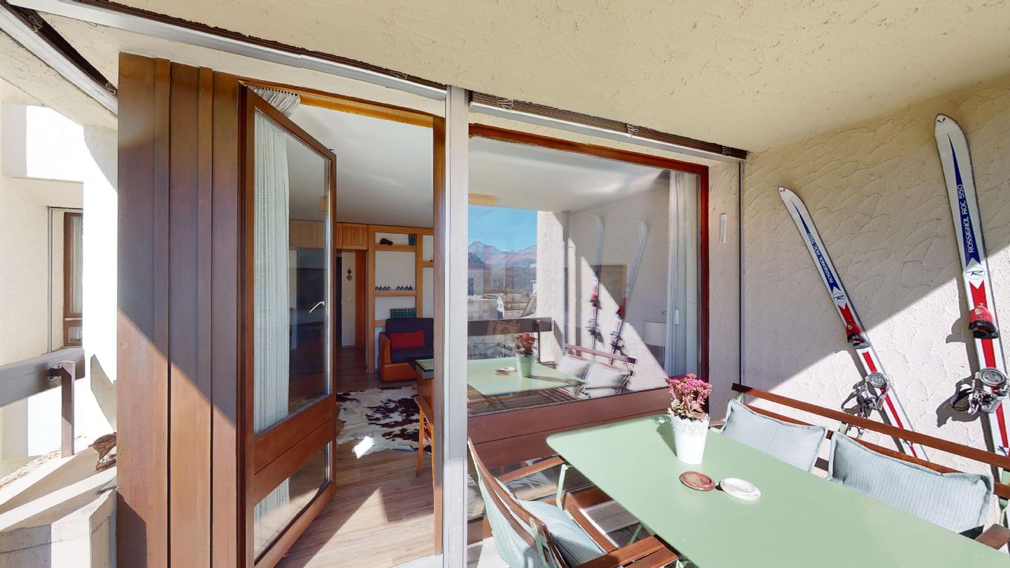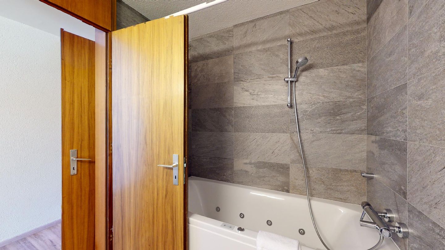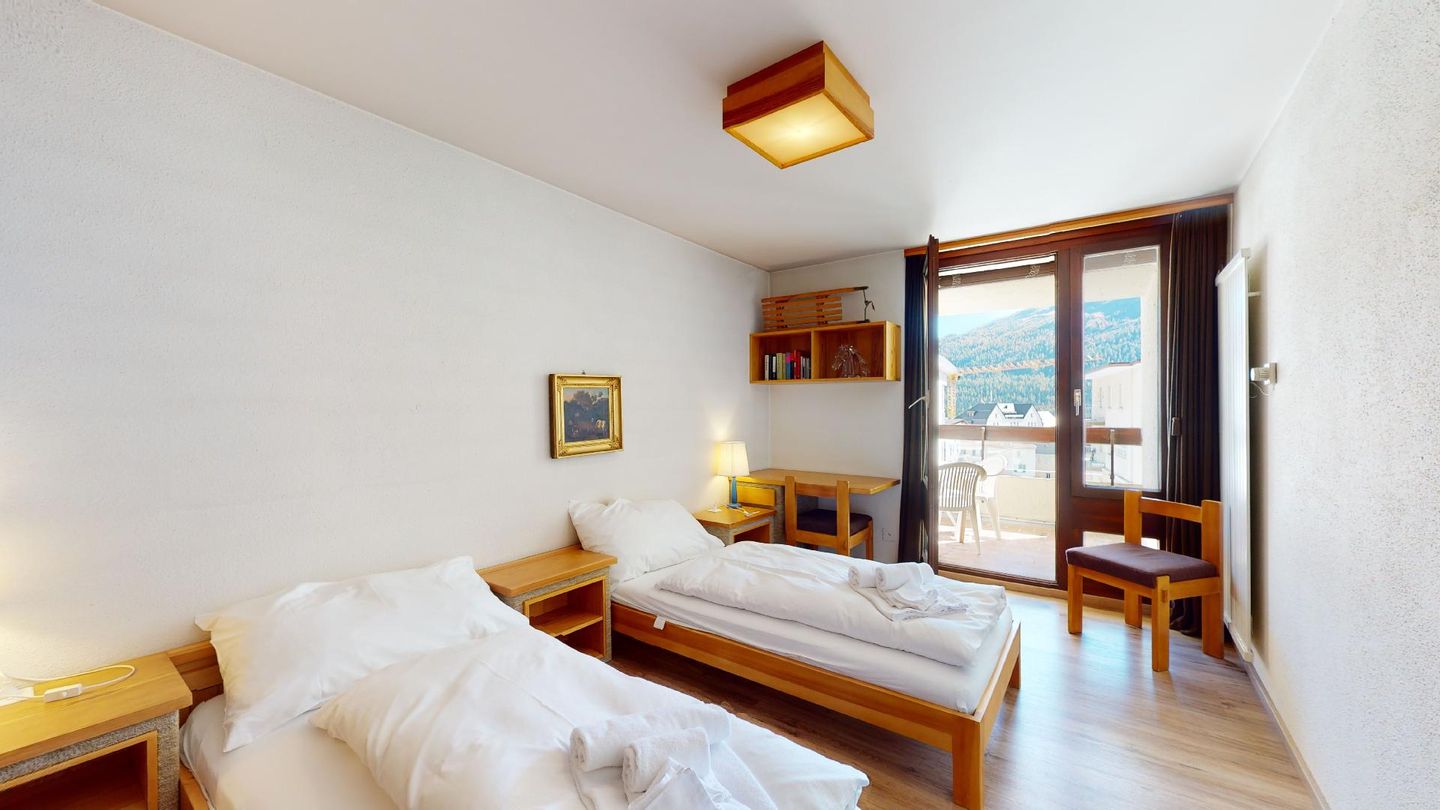 - 1 Zimmer mit 2 Betten (90 cm, Länge 190 cm), Regalen, Schreibtisch und Bücherregal. Terrasse mit grossem Panoramablick, möbliert.