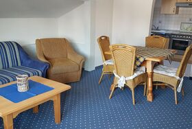 2 Raum Komfort-Wohnung mit Teppichboden, ca. 60qm im 2.Stock mit West-Balkon. Diele mit Garderobe, großzügiger Wohnraum mit Essplatz, gemütliche Polstergarnitur. SAT-TV Flachbildschirm und CD-Radio Stereoanlage. Küche komplett eingerichtet mit Backofen, Ceran Kochfeld, Kaffeemaschine, Spülmaschine, Toaster und Wasserkocher. Bad mit Dusche und WC.