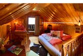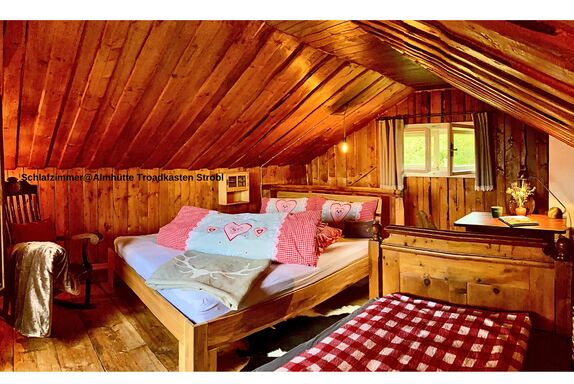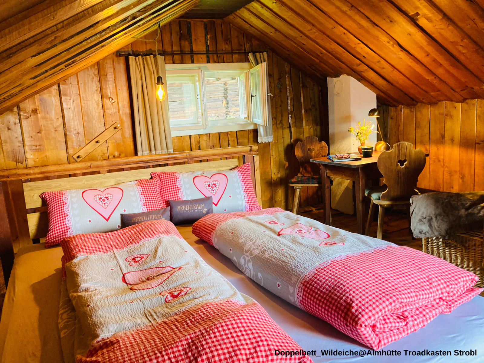 Das Schlafzimmer im Mansarden-Obergeschoß ist heimelig, romantisch eingerichtet. Mit kuscheligem Doppelbett aus geölter Wildeiche und dem antiken Natur-Holz-Hochzeitsbett meiner Urgroßmutter Theresia, Gründerin der Bäckerei Strobl in Afritz.
