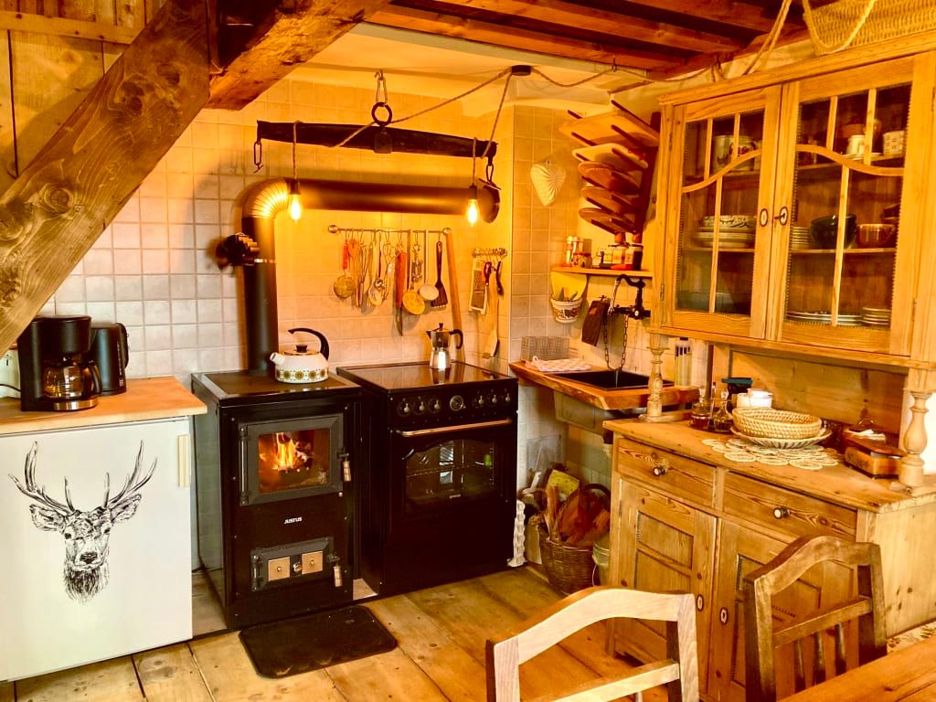 Die Küche ist voll ausgestattet mit Retro-Elektroherd, sowie Filter- & italienischer Kaffee-Maschine, Toaster und Wasserkocher.