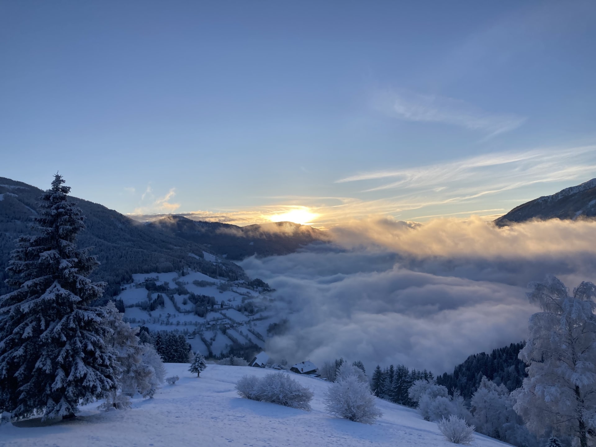 Ihr werdet verzaubert sein, von den vielen unterschiedlichen Stimmungen, mit denen euch hier heroben die Natur täglich beschenkt. Mal bauschige Wolkendecke im Tal. Ein strahlend blauer, wolkenloser Himmel bis zum Horizont. Fantastischer Sonnenaufgang über der Nockalm im Osten. Atemberaubend schönes Abendrot über den Karawanken. Ein imposanter Sternenhimmel mit Lichtermeer im Tal. Und romantisches Schneetreiben mit frisch verschneiten Tiefschneehängen im Winter. Da geht einem das Herzerl auf ❤️