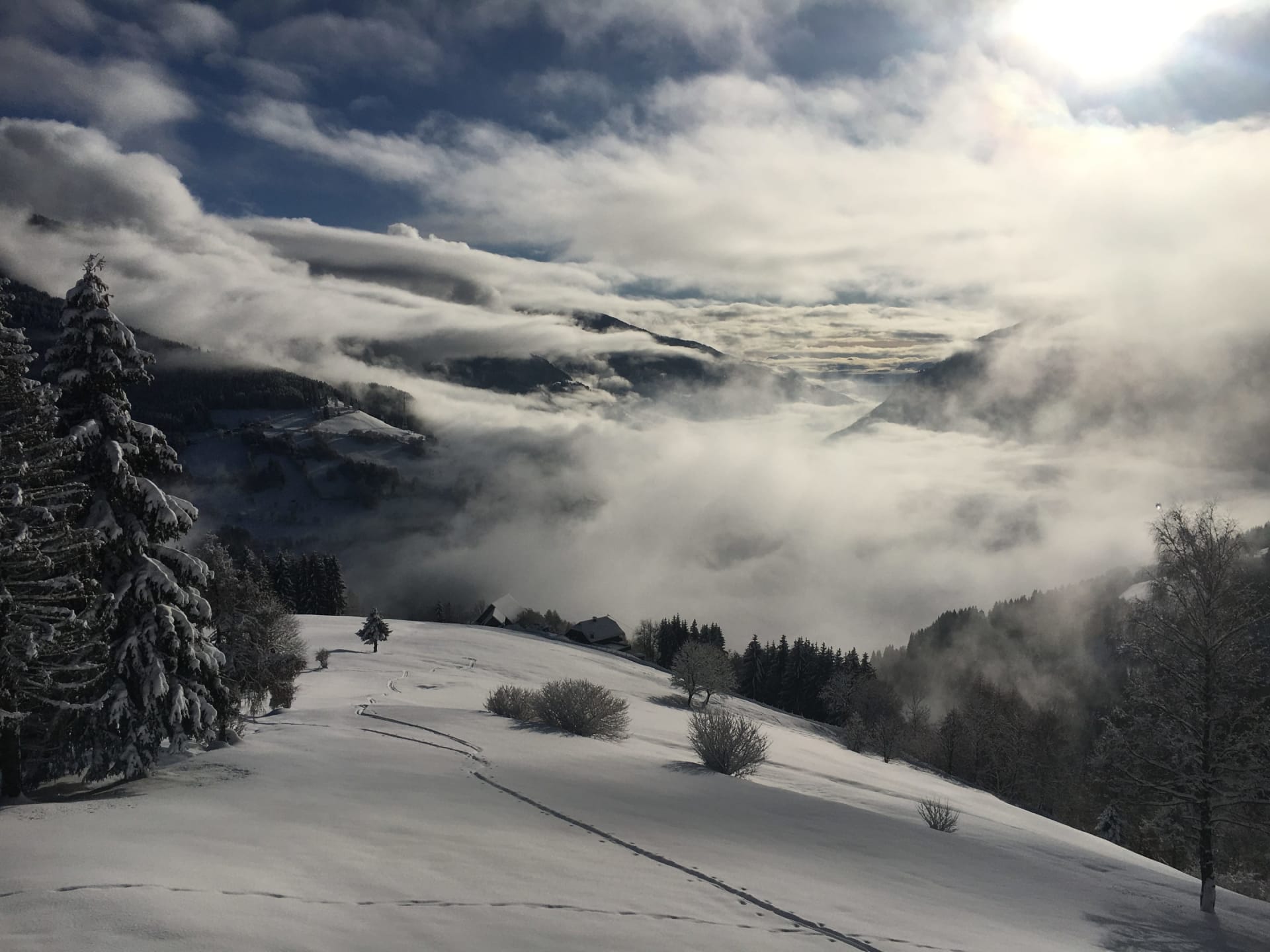 Ihr werdet verzaubert sein, von den vielen unterschiedlichen Stimmungen, mit denen euch hier heroben die Natur täglich beschenkt. Mal bauschige Wolkendecke im Tal. Ein strahlend blauer, wolkenloser Himmel bis zum Horizont. Fantastischer Sonnenaufgang über der Nockalm im Osten. Atemberaubend schönes Abendrot über den Karawanken. Ein imposanter Sternenhimmel mit Lichtermeer im Tal. Und romantisches Schneetreiben mit frisch verschneiten Tiefschneehängen im Winter.