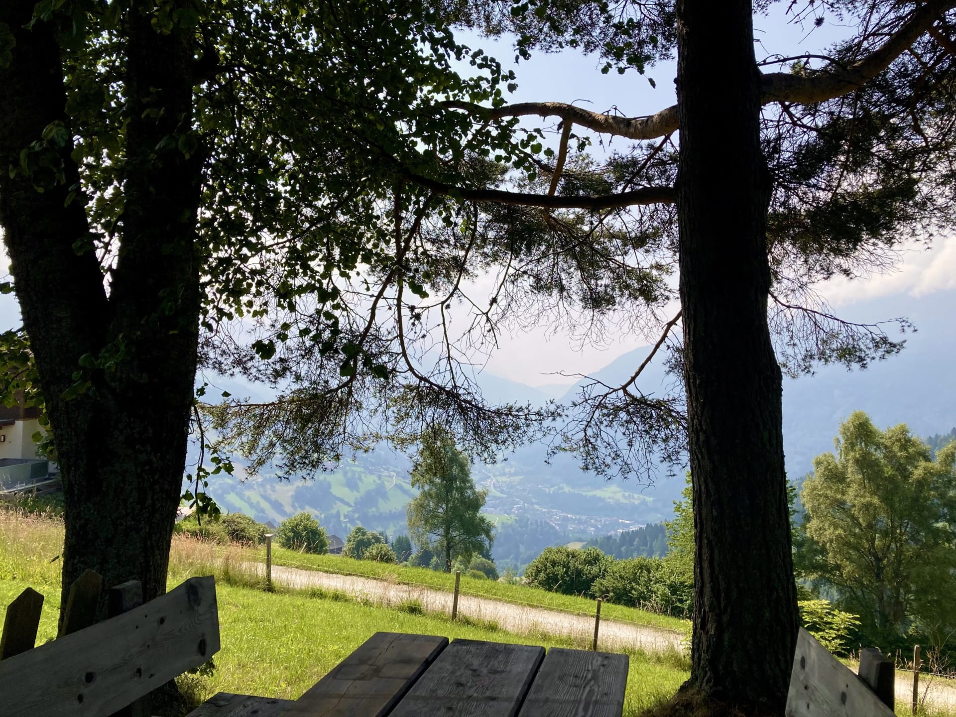 Eines der Lieblings-Platzerln unserer Gäste, ist die Holzterrasse unter der alten Linde, mit traumhaftem Panoramablick, handgezimmertem Lärchentisch, Griller, Korbschaukel, Hängematte und Brunnen mit erstklassiger Trinkwasserqualität aus der eigenen Berg-Quelle.