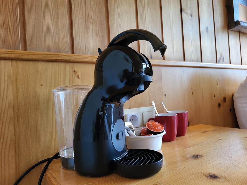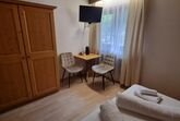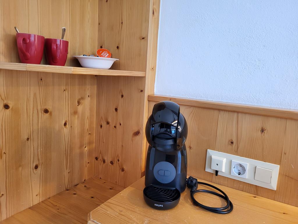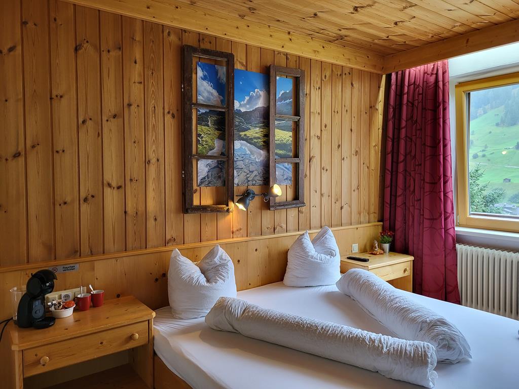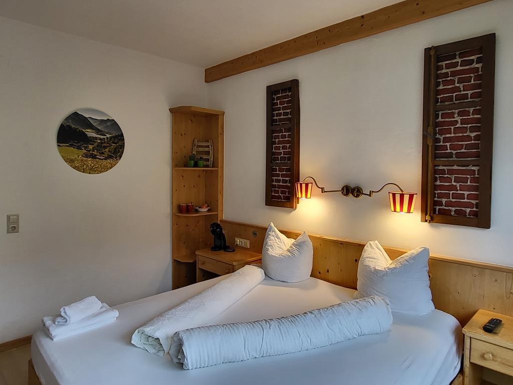 Doppelzimmer ohne Balkon, Badezimmer mit Dusche und WC. Kaffeemaschine im Zimmer vorhanden, Wasserkocher auf Anfrage. Blick auf die Garten-/Gästehausseite oder die Bergseite/den Parkplatz