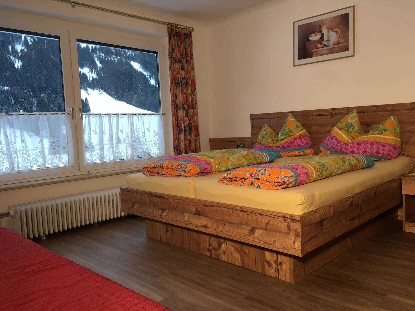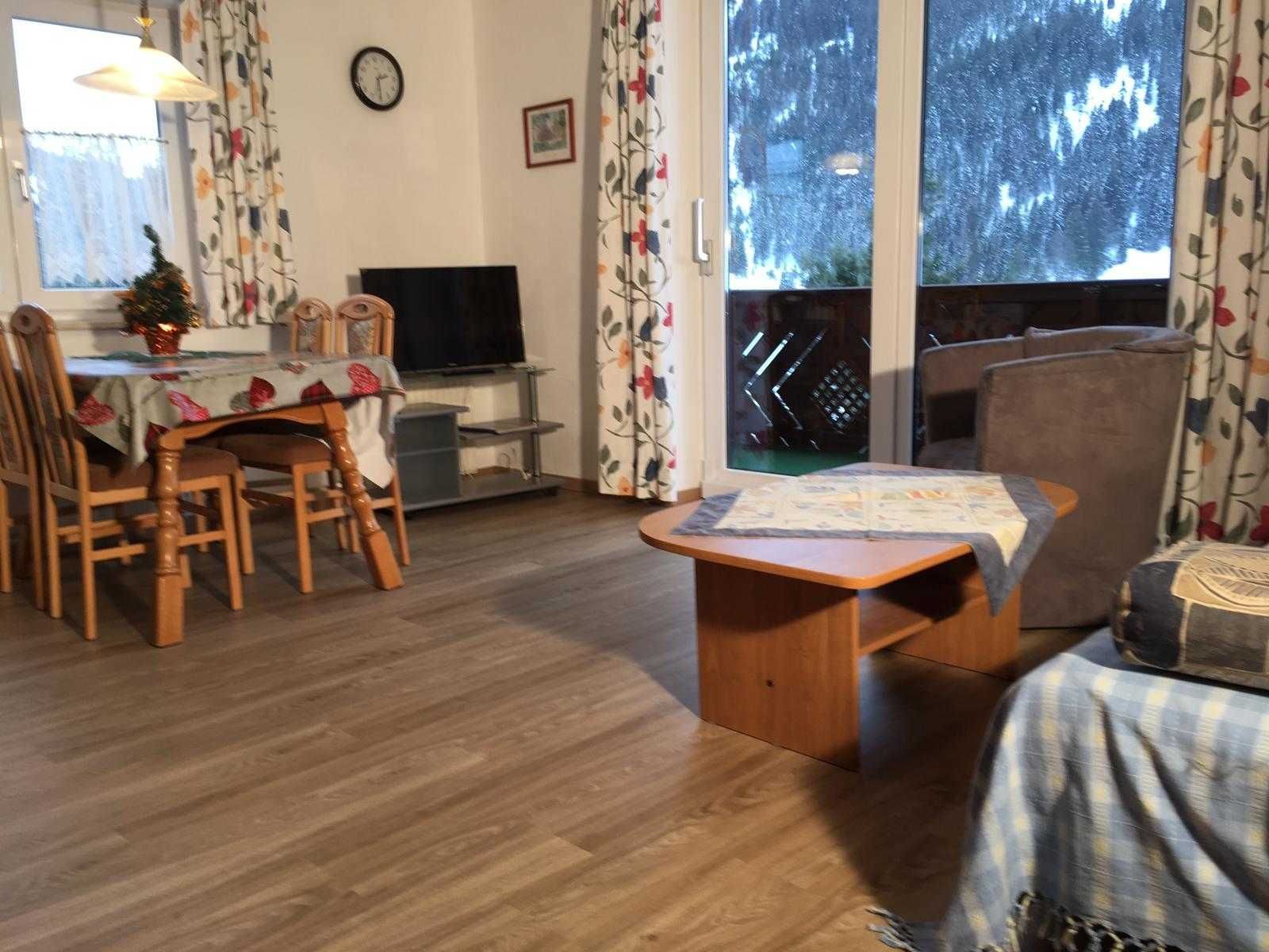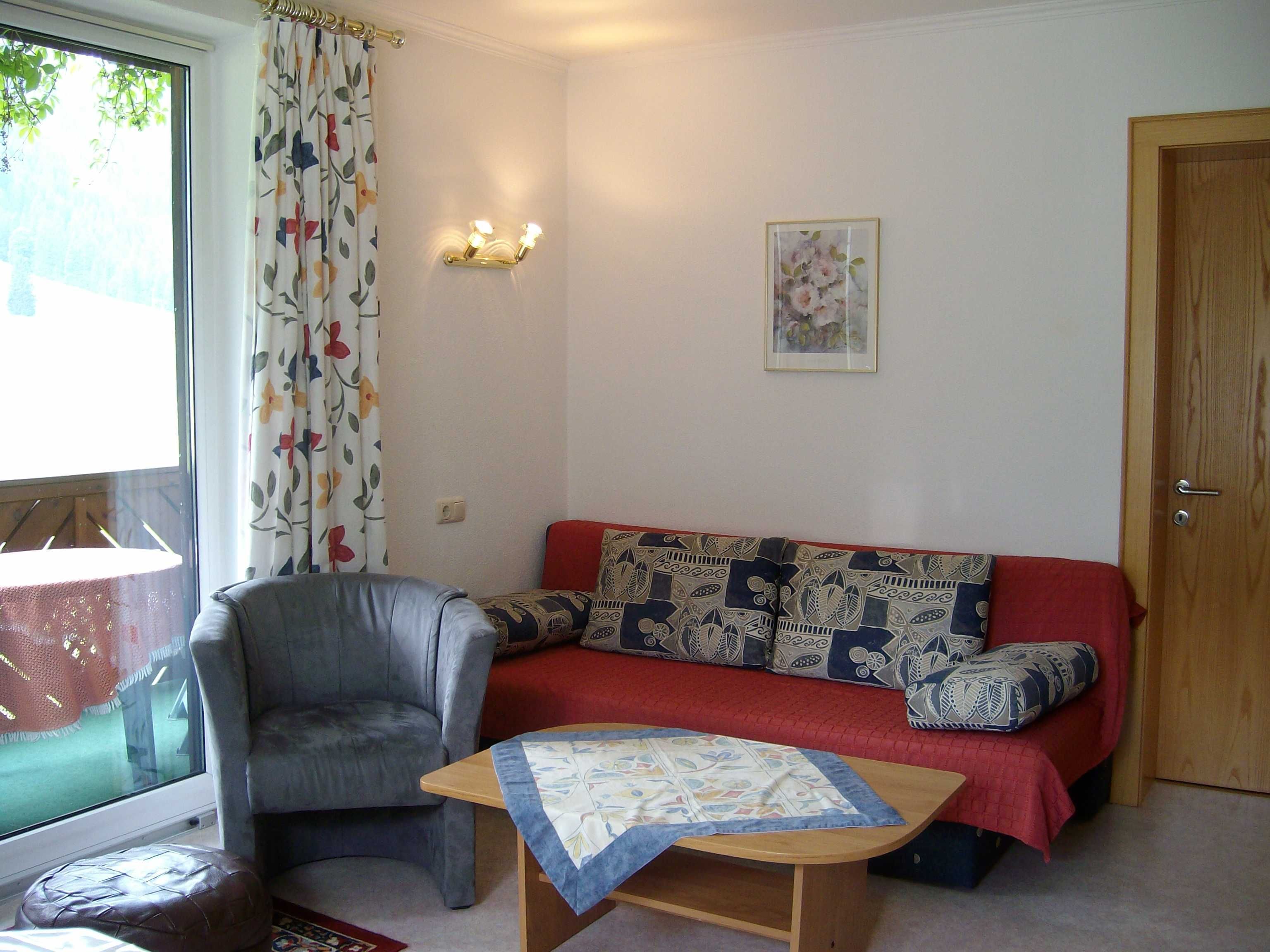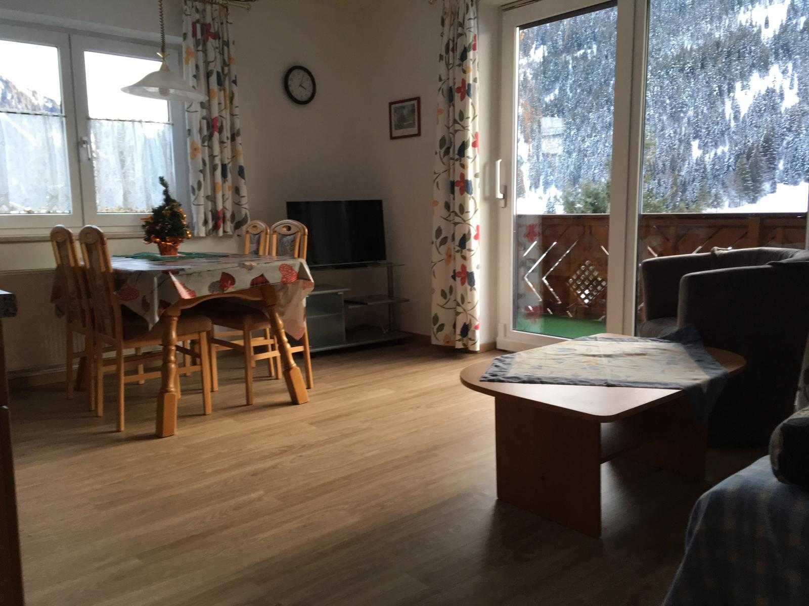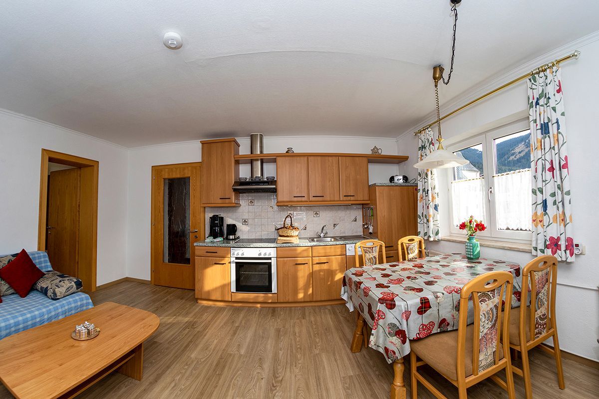 Appartement No.1: 52 m²,Küche im Wohnraum mit Essecke und ausziehbare Doppelbettcouch, Schlafzimmer mit Doppelbett und eine Schlafcouch, Diele, großes Bad(DU/WC) mit Balkontüre. südseitiger Balkon mit Sicht zur Krinnenspitze, Balkon  mit drei Zugängen, große Panoramafenster.