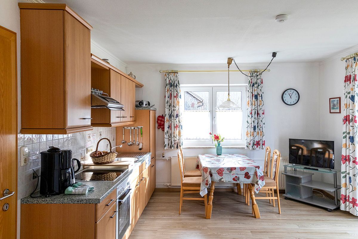 Rustikal ausgestattet mit einer Wohnküche ,gemütlicher Essecke mit Eckbank, Kabel/TV ,ein Schlafzimmer mit Doppelbett ,ein kleiner Tisch mit Stuhl  ,DU/WC, Balkon