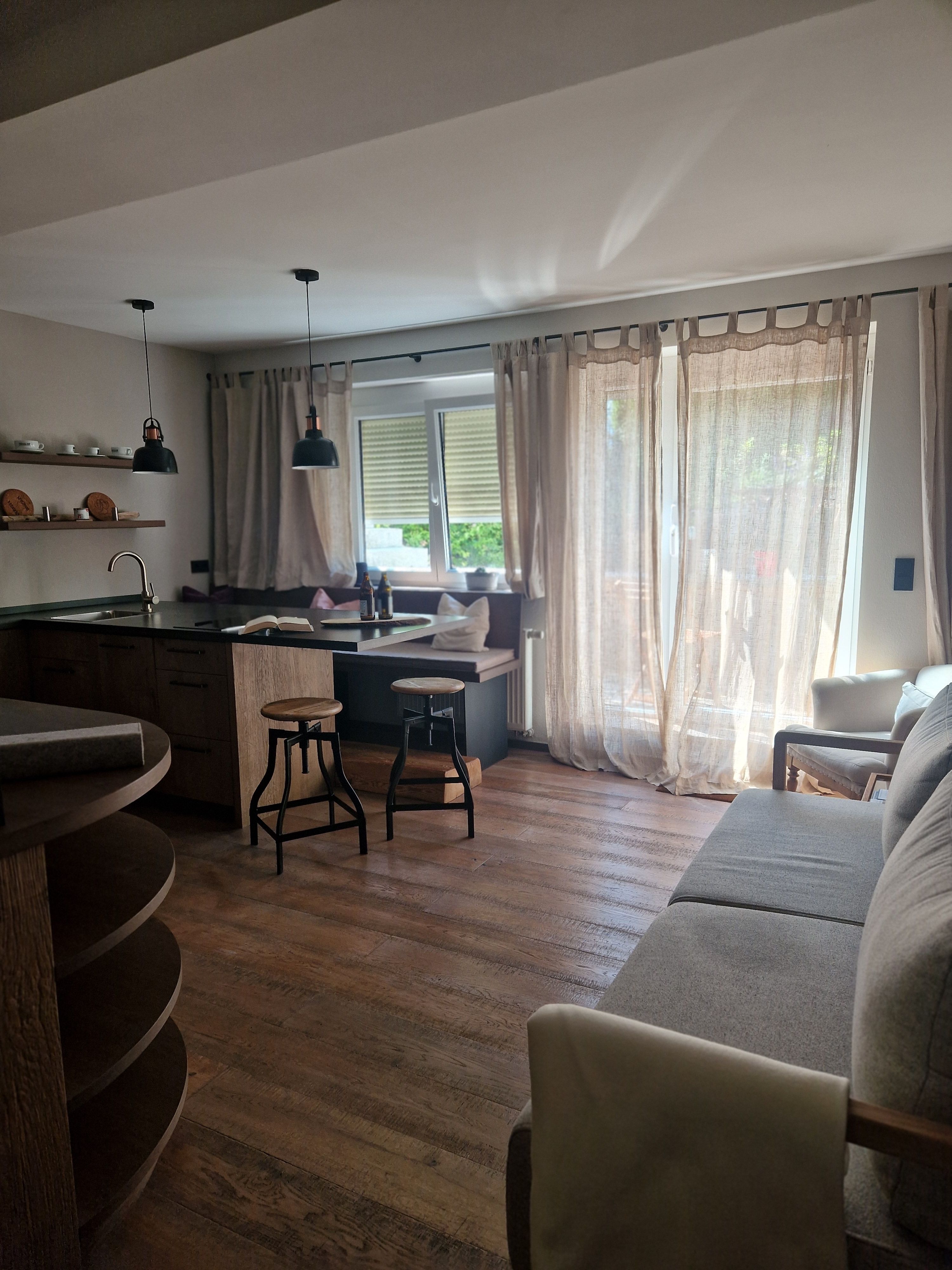 Es gibt zwei separate Schlafzimmer, ein Bad mit begehbarer Dusche sowie eine offene, voll ausgestatteten Küche mit Inselfeeling, Barhockern und Eckbank. Vom lichtdurchfluteten Wohnbereich, in dem sich ein gemütliche Couch und Lesesessel befinden kommt man direkt zur sonnigen Terrasse .