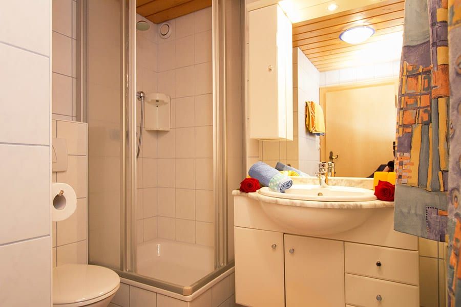 Das Doppelzimmer ist mit einem Doppelbett ausgestattet. Es verfügt auch über ein eigenes Bad mit Dusche und WC .