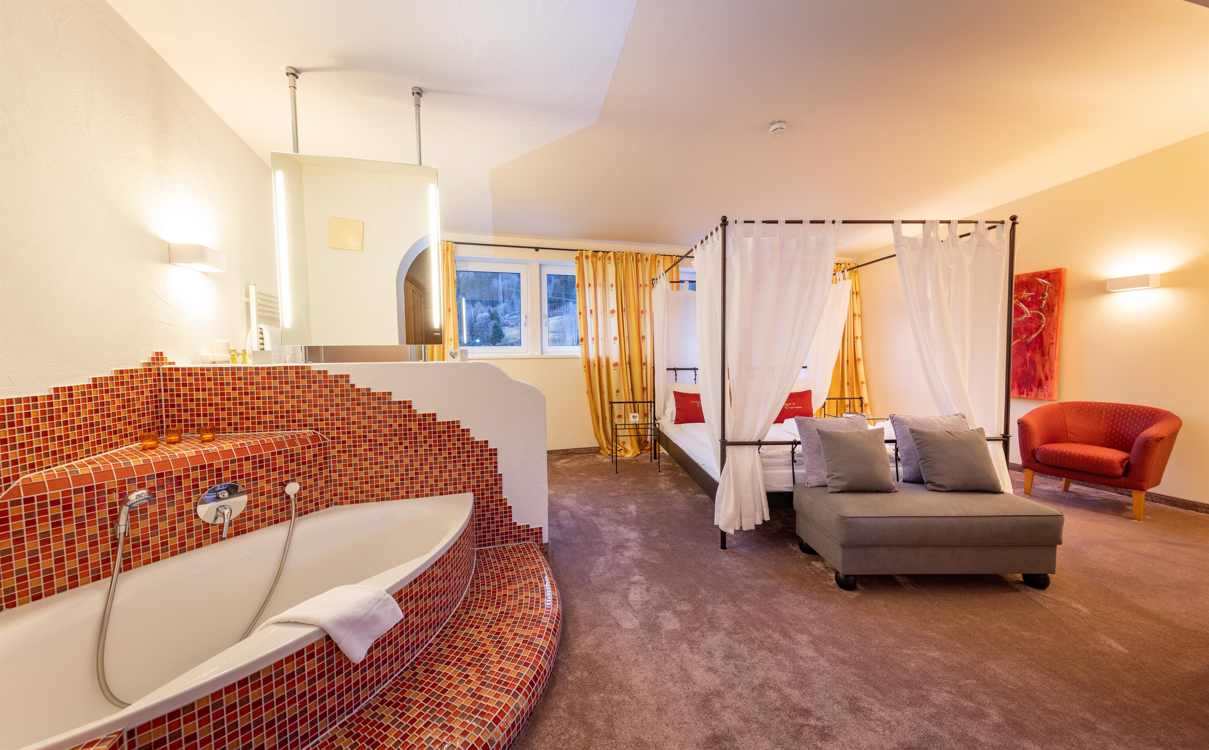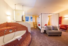 Wunderschöne Suite mit 40m² mit besonderen Akzenten für romantische Stunden zu Zweit. Selbstverständlich inklusive aller Verwöhnhotel Extras. Helle, großzügige Suite mit offenem Schlaf-, Wohn- und Badebereich, Dusche, getrenntem WC, Minibar, BALKON, gratis Wlan