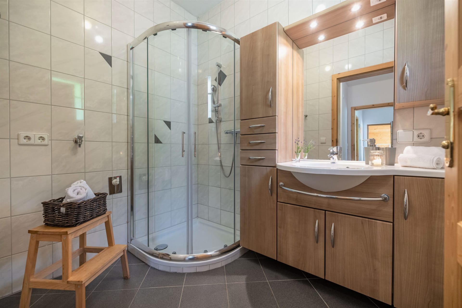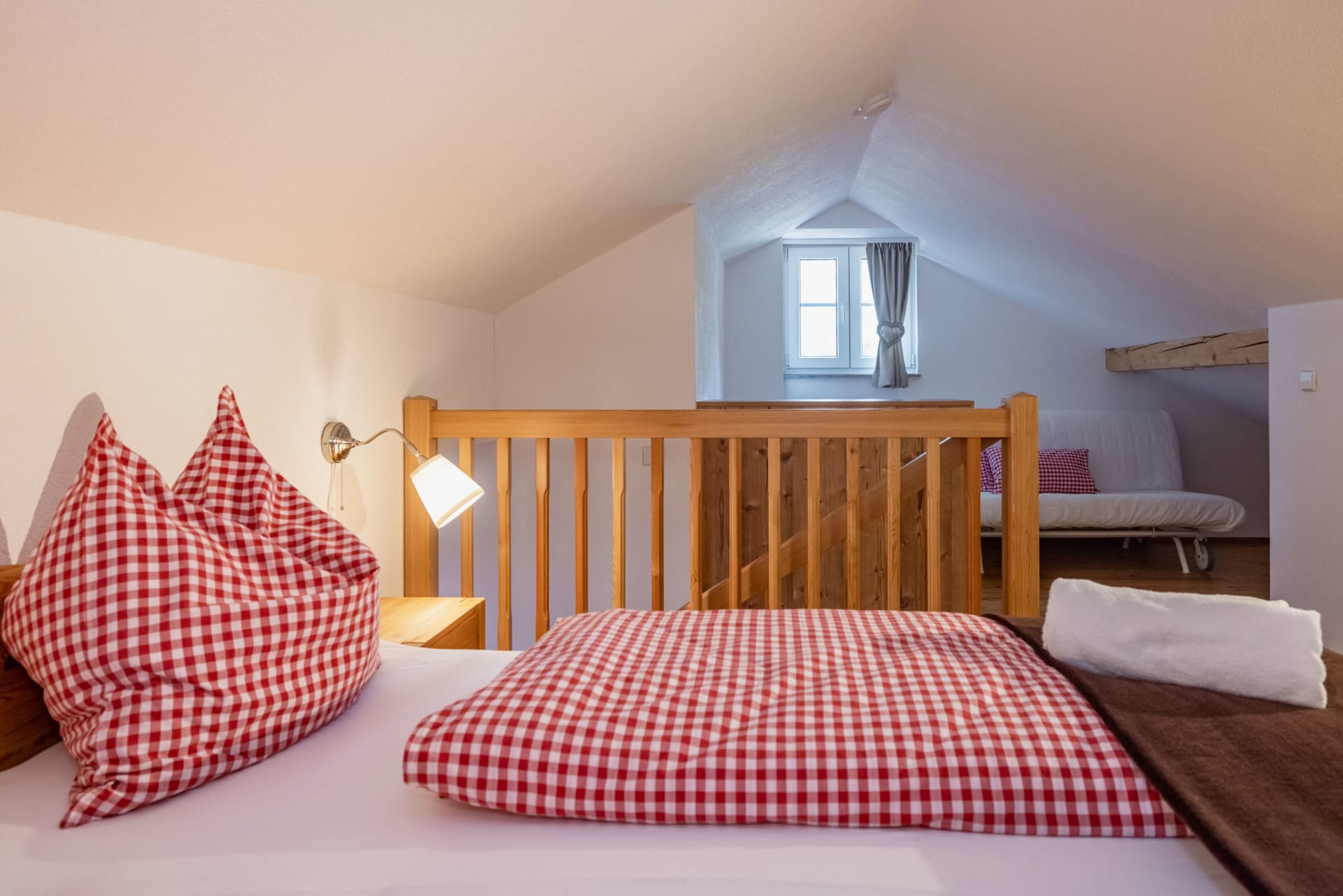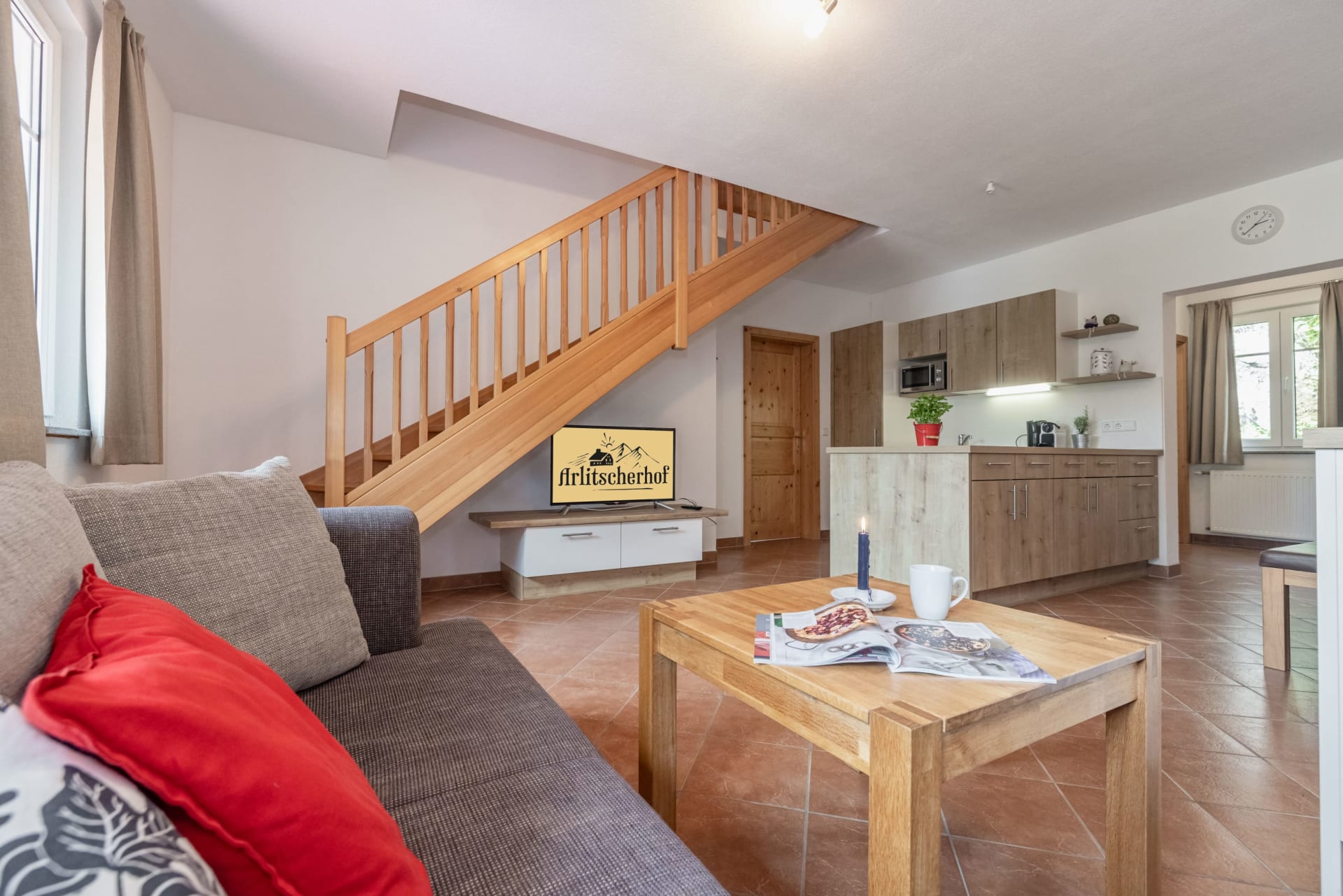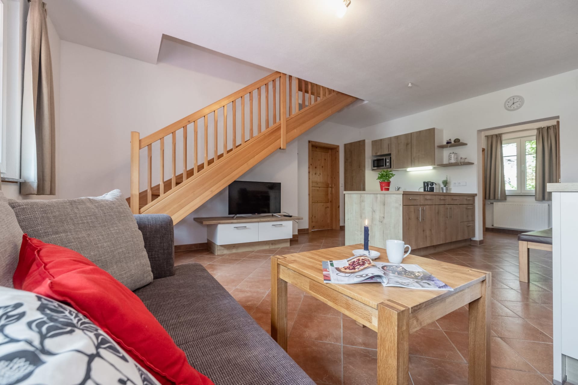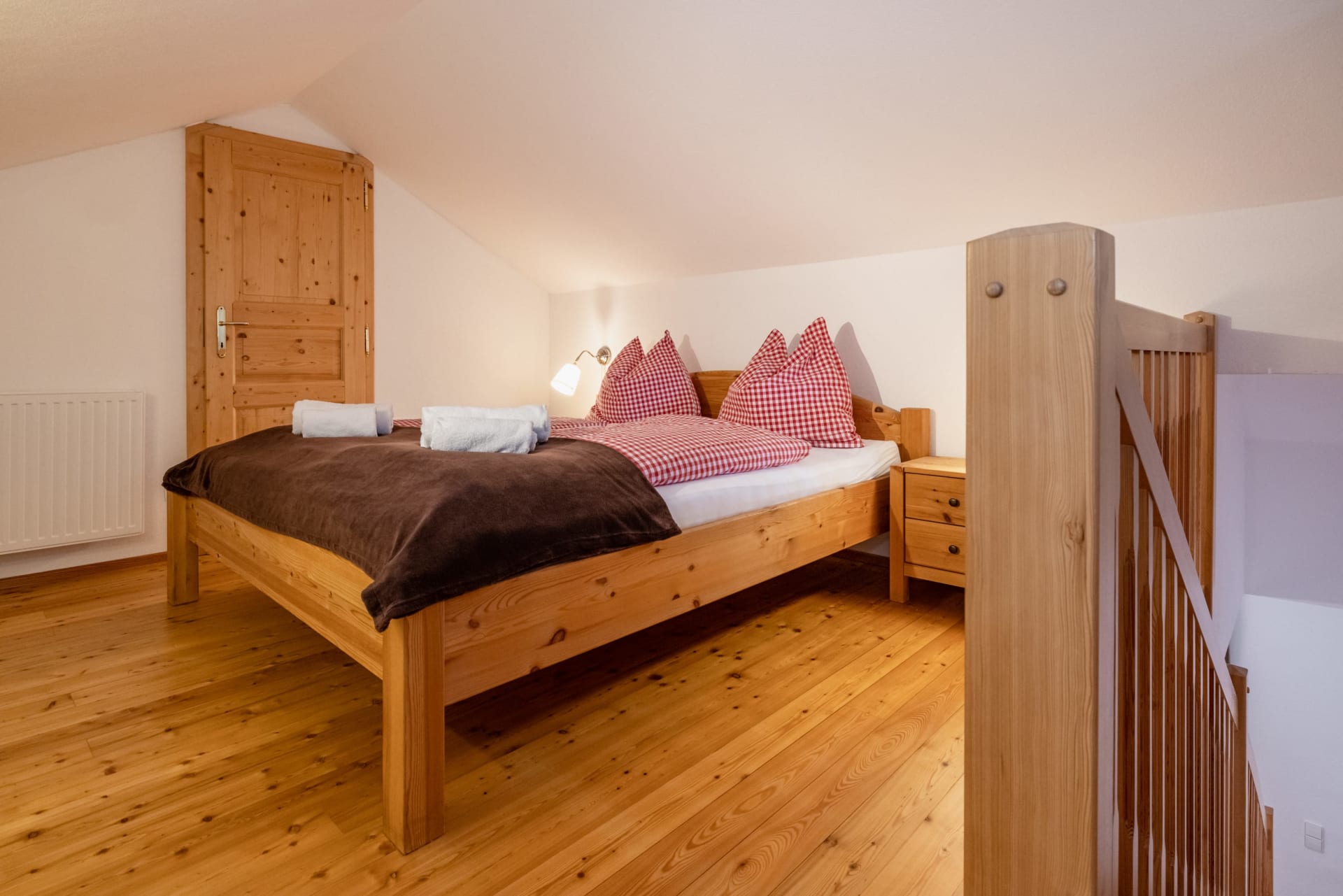Vom offenen Wohnraum mit komfortabler Couch, modernen Möbeln, Flat-TV führt eine Lärchenholztreppe auf die Galerie wo sich eines der 2 Schlafzimmer befindet. Die Schlafzimmer sind mit Vollholzböden und Möbeln aus warmen Fichtenholz ausgestattet. Badezimmer mit Dusche. WC getrennt.