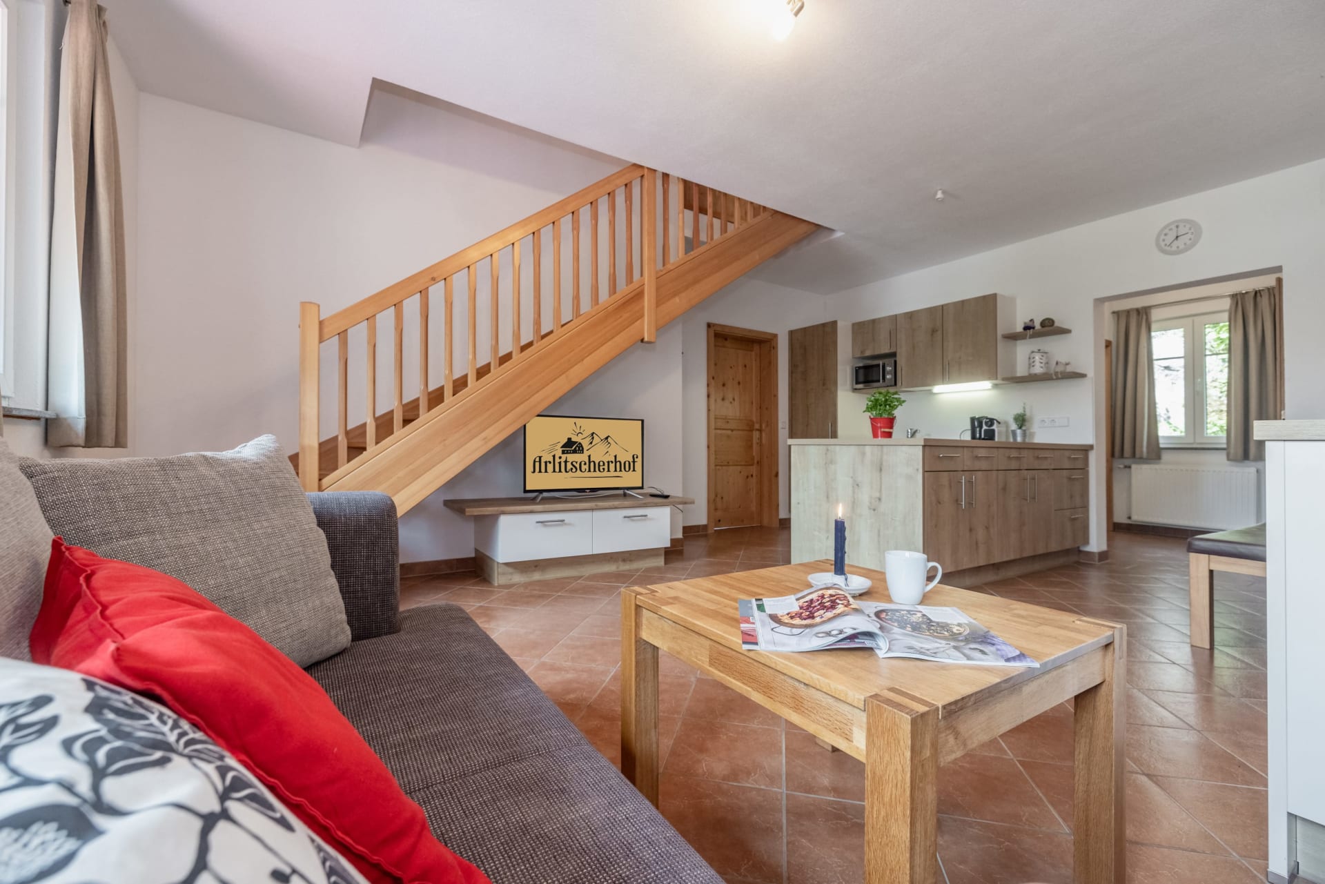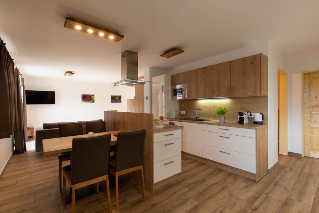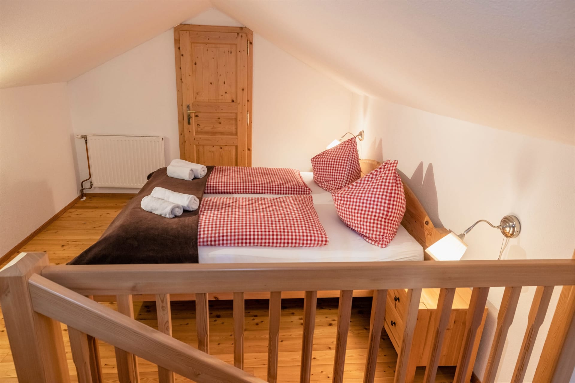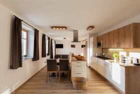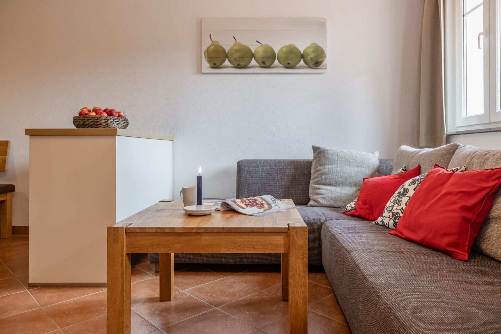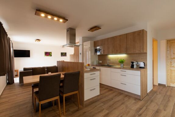Unsere Bauernhof-Suite verfügt über einen großzügigen, offenen Wohn-und Essraum und einen abgeteilten Schlafbereich. Im modernen Badezimmer lässt es sich wunderbar entspannen.