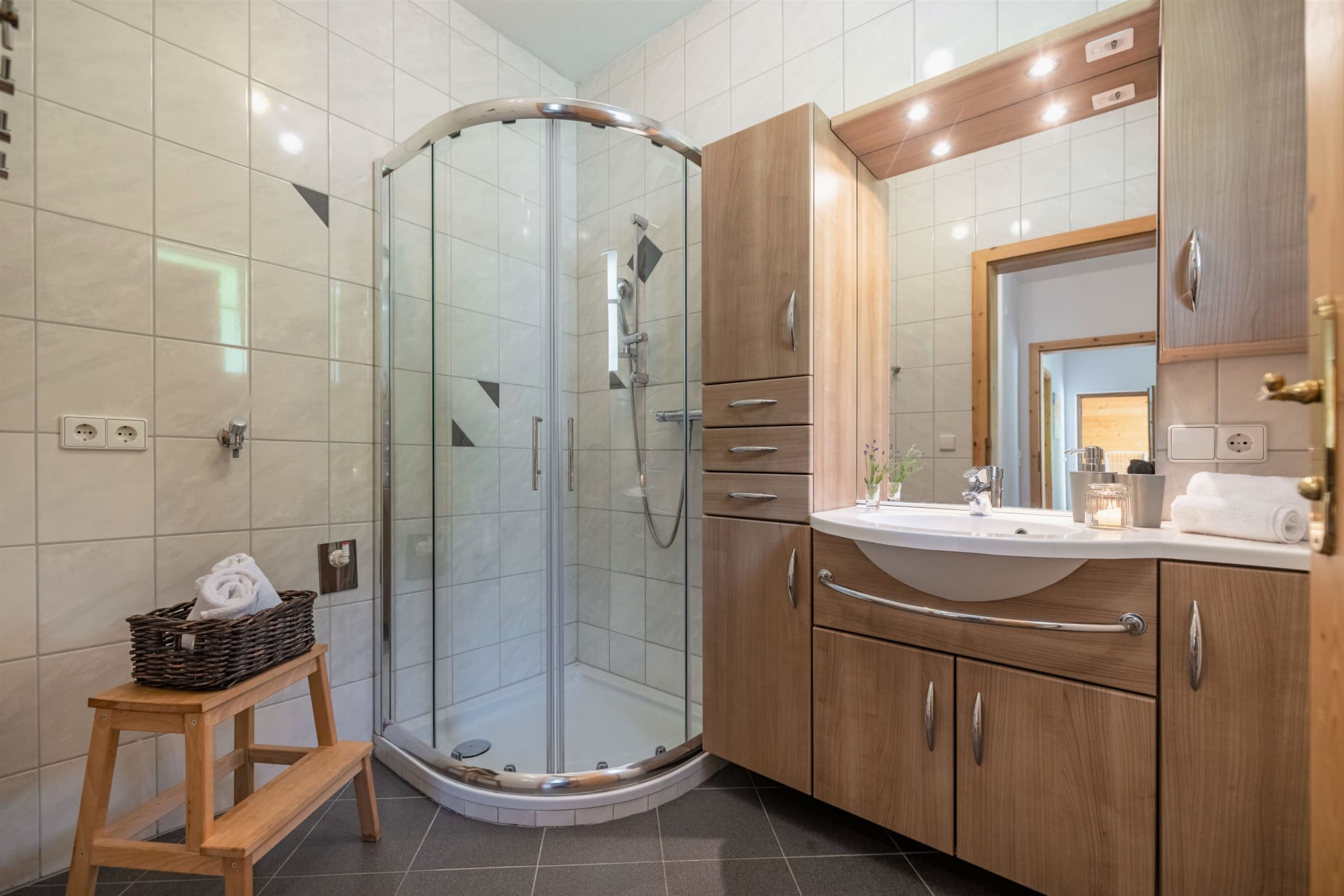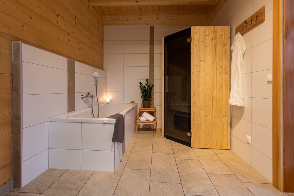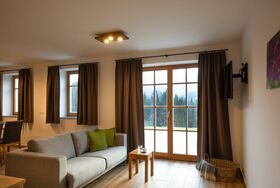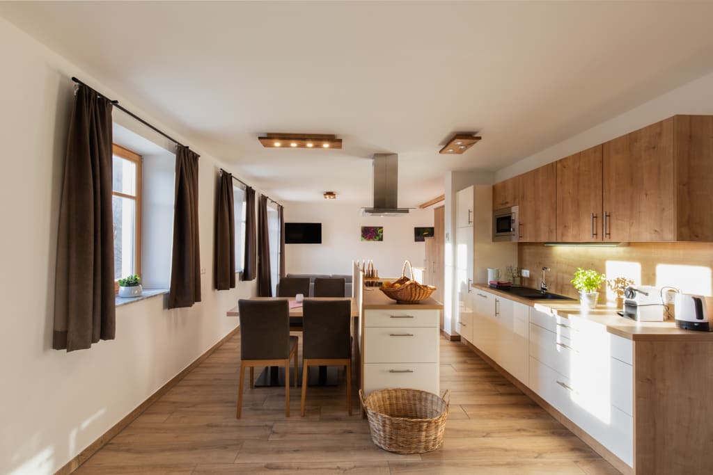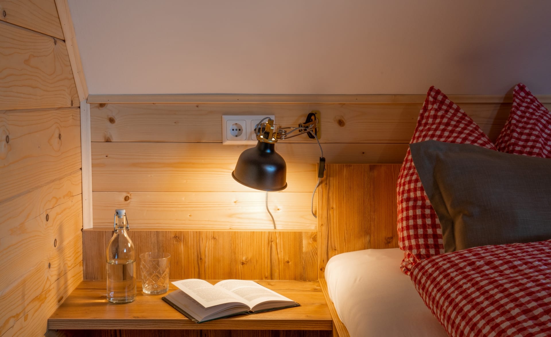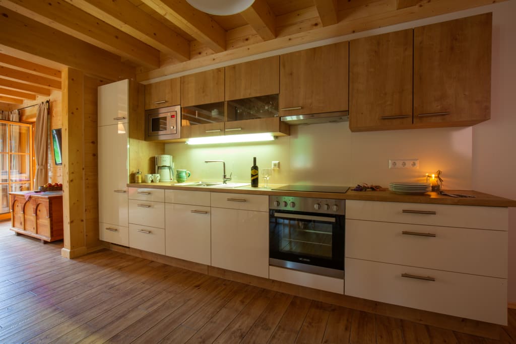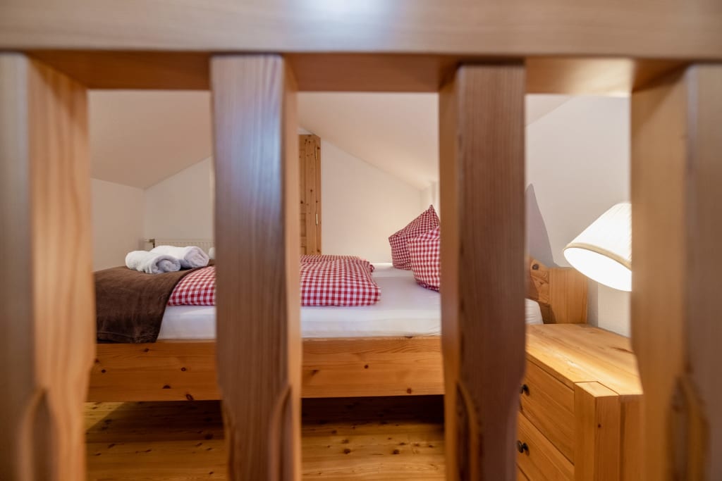 Unsere Bauernhof-Suite verfügt über einen großzügigen, offenen Wohn-und Essraum und einen abgeteilten Schlafbereich. Im modernen Badezimmer lässt es sich wunderbar entspannen.