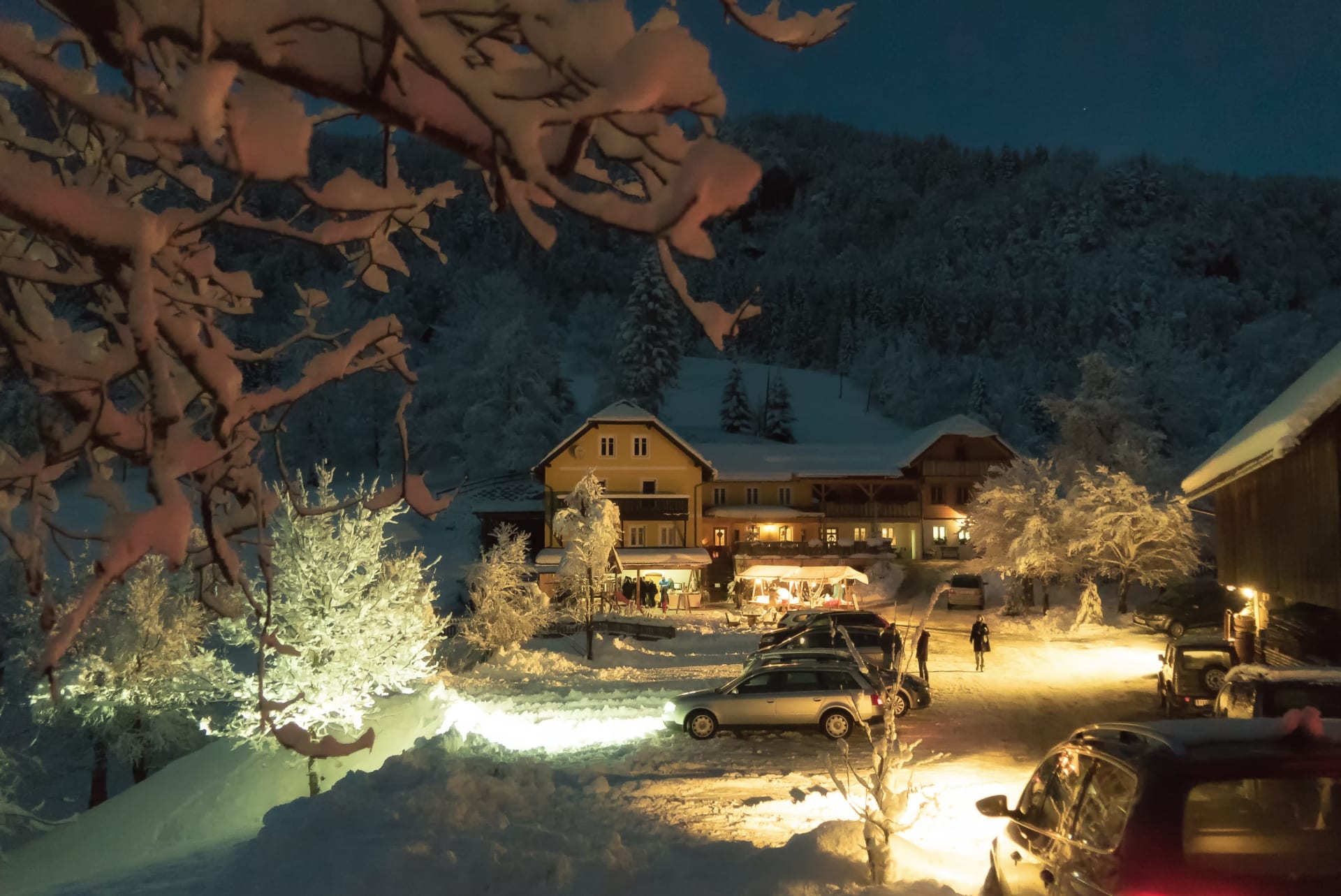 Wenn die Temperaturen sinken und die Natur zur Ruhe kommt, entfaltet unser Hof seinen ganz besonderen Charme. Auf 650 Metern Seehöhe, nicht weit vom Luftkurort Bad Eisenkappel entfernt, genießt du eine traumhafte Aussicht auf die Bergwelt der Karawanken – egal ob mit oder ohne Schnee.