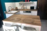 einer Esstheke, Herd, Kühlschrank, Spülmaschine, Toaster,