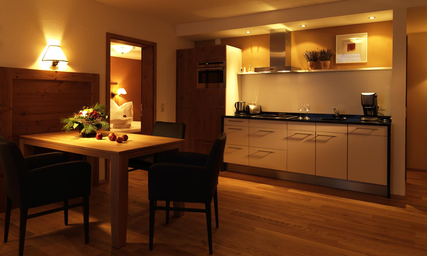 Unsere Nichtraucherappartements sind mit Flat-TV, kostenlosem W-Lan, Bademantel, Fön, Telefon und Safe ausgestattet. In den Küchen finden Sie einen Ceran-Herd, Kombi-Backofen, Geschirrspüler, Kühlschrank mit Gefrierfach, Espresso- und Kaffeemaschine, Wasserkocher, Toaster, Töpfe & Pfannen, Gläser, Geschirr, Besteck und Kochutensilien. Selbstverständlich stellen wir Ihnen auch die Bettwäsche, Handtücher und Toilettenpapier zur Verfügung.