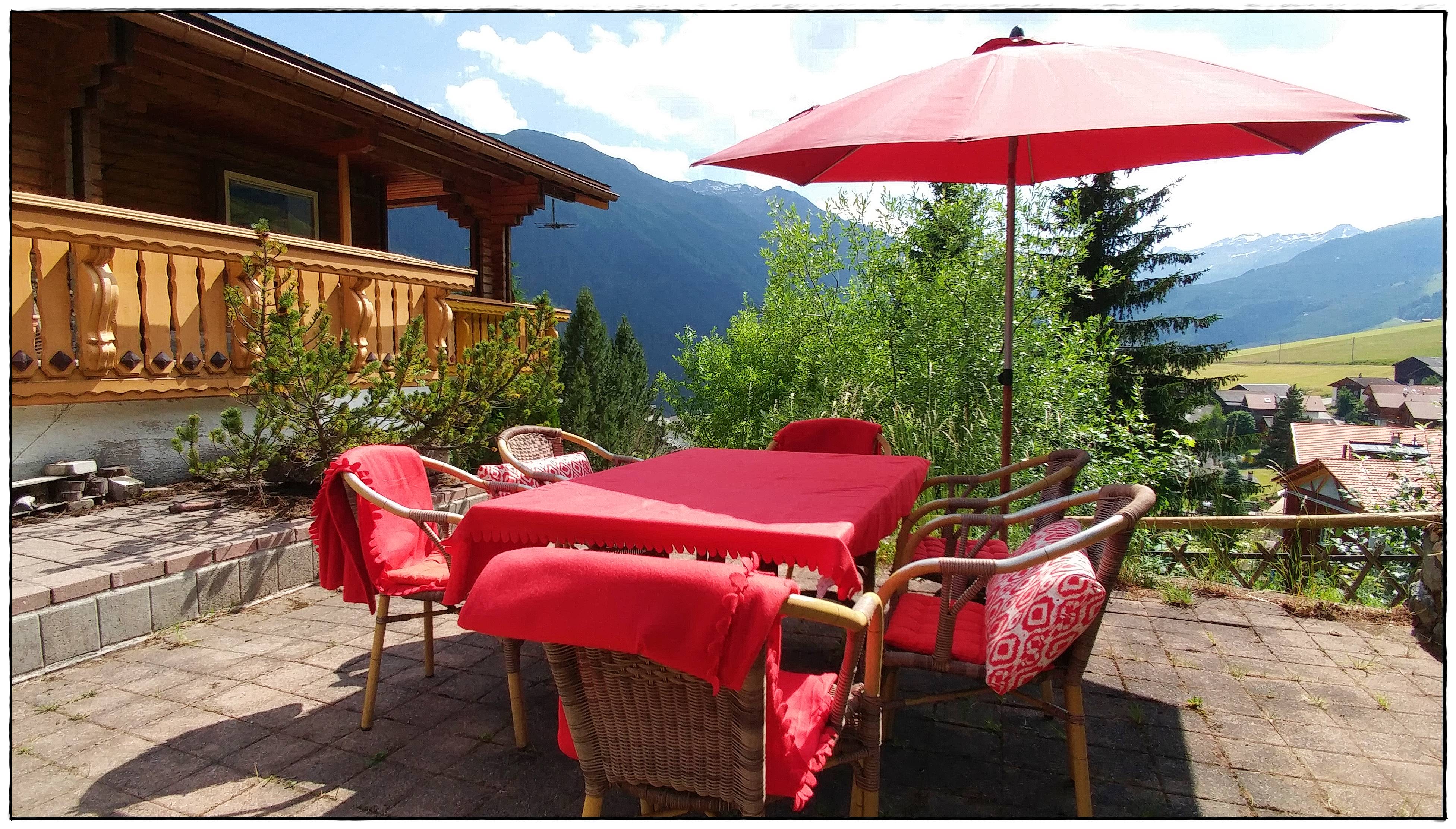 Grosser Balkon/ Terrasse, seitlich und über die ganze Hausfront, teils gedeckt mit gemütlichen Sitzplätzen. Am Haus angrenzend Aussensitzplatz und Garten zur Mitbenützung. Waschautomat zur Mitbenützung; Stau-Platz für Ski und Schischuhe oder Bike vorhanden; Parkplatz;