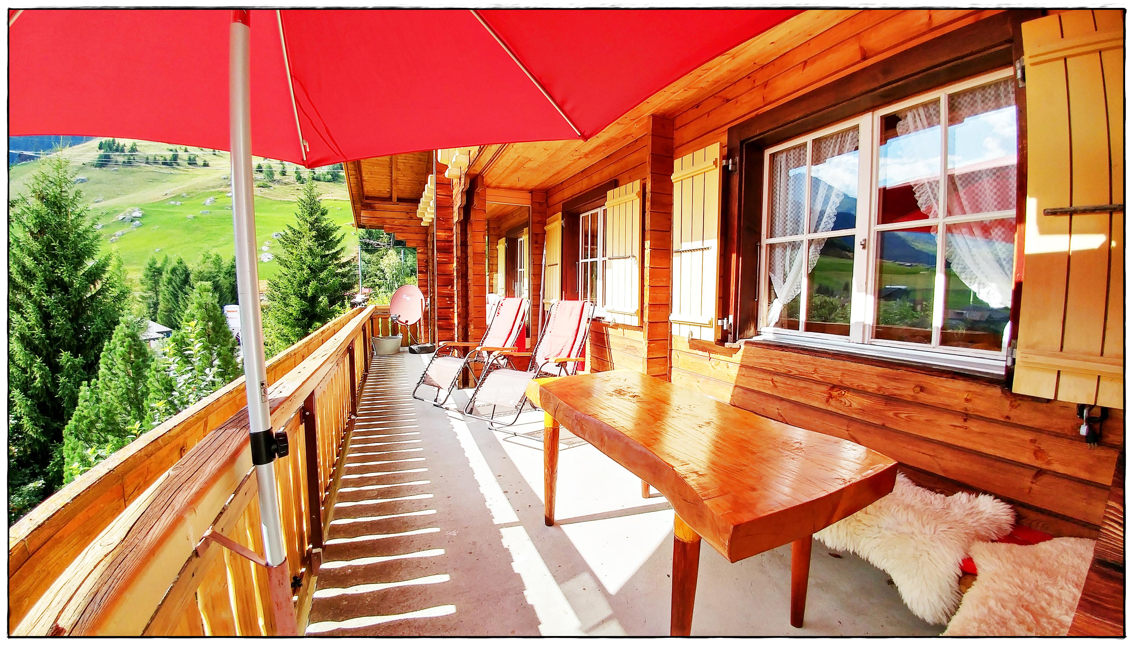 Grosser Balkon/Terrasse rund ums Haus, seitlich und über die ganze Hausfront, teils gedeckt mit gemütlichen Sitzplätzen. Am Haus angrenzender Aussensitzplatz und Garten zur Mitbenützung. Waschautomat zur Mitbenützung; Stau-Platz für Ski und Skischuhe oder Bikes im Sommer vorhanden. Parkplatz vorhanden.