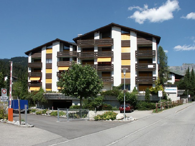 2.5 Zimmerwohnung, 2 Stern Superior, 49 qm, (4 Betten in einem Mehrfamilienhaus, in der Nähe der Bergbahnen. Einfach und zweckmässig eingerichtet. Küche gegen Wohnzimmer mit Einbauschränken abgetrennt, Durchreiche, Elektroherd, Backofen, Dampfabzug, Kühlschrank mit Gefrierfach und Geschirrspüler. Wohnzimmer mit 1 franz. Schrankbett, Esstisch, Stoffpolstergruppe, Klubtisch, Einbauschrank, TV, Internet, Stehlampe und Cheminée. Schlafzimmer mit 1 franz. Schrankbett, 2 Einzelbetten und Einbauschrank. Badezimmer mit Doppellavabo, Bad und Toilette. Balkon nach Süden. Hallenbad mit direktem Zugang durch Einstellhalle. Sauna im Hause, kleine Gebühr (Münzautomat).