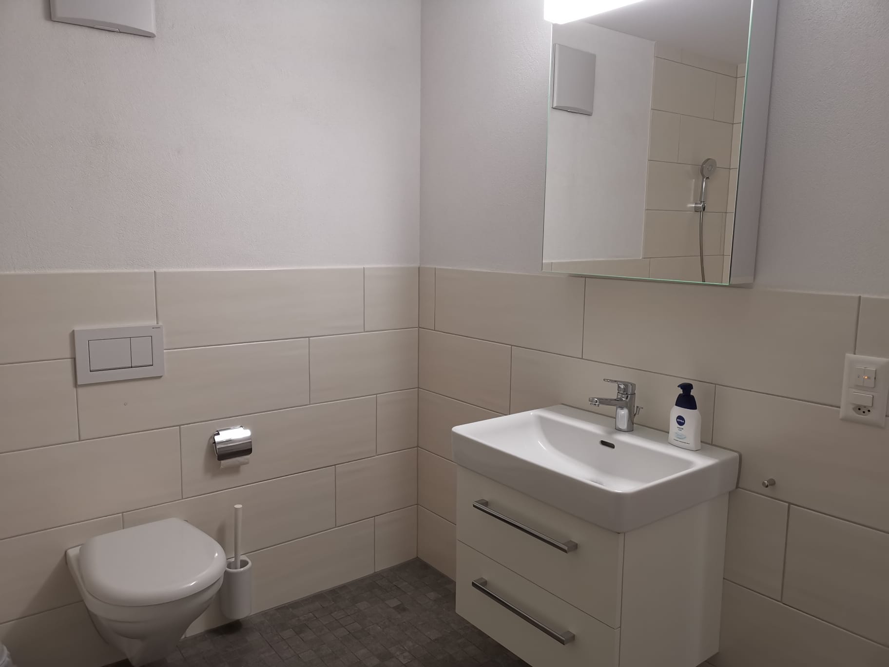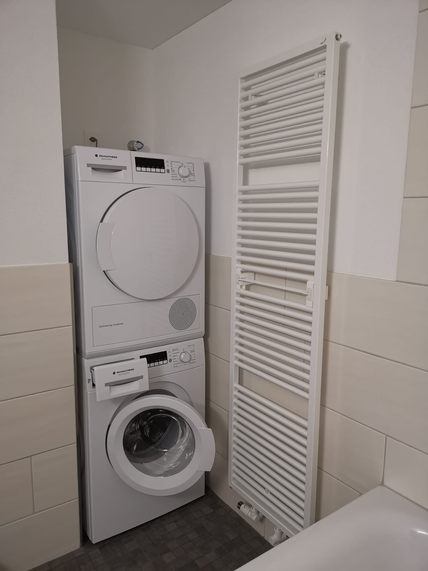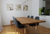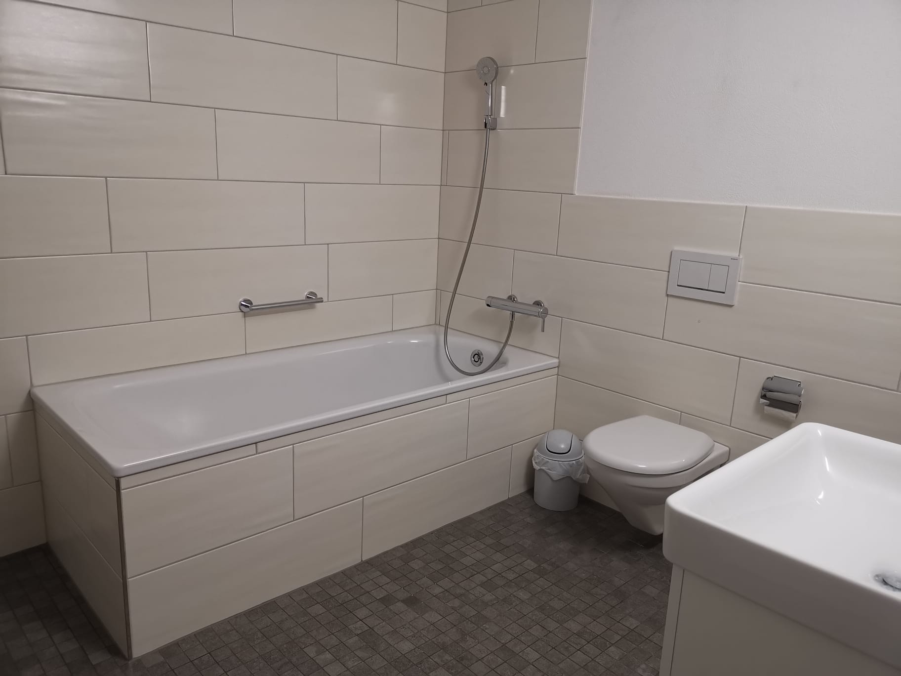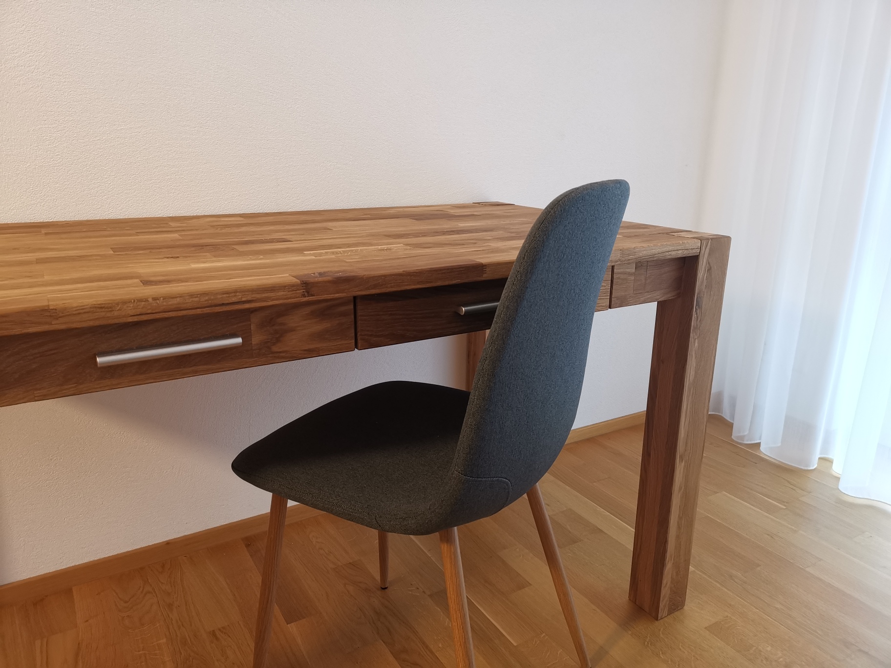Die Bettwäsche ist im Preis inbegriffen. Badezimmer: Das grosse Badezimmer ist mit einem Waschbecken mit Spiegelschrank, einer Badewanne und einer Toilette ausgestattet. Zusätzlich befindet sich in dem Badezimmer ein Waschturm mit Waschmaschine und Wäschetrockner. Haartrockner und Frotteewäsche sind im Preis inbegriffen. Wohnzimmer: Im Wohnzimmer befindet sich ein gemütliches, grosses Leder Ecksofa und ein Club Tisch. Zusätzlich lädt ein gemütlicher Leder Schaukelstuhl in der Ecke zum Lesen ein. Die Essecke ist mit einem neuen, grossen Esstisch aus Eichenholz, 6 Stühlen und einer Holzbank ausgestattet. Küche: