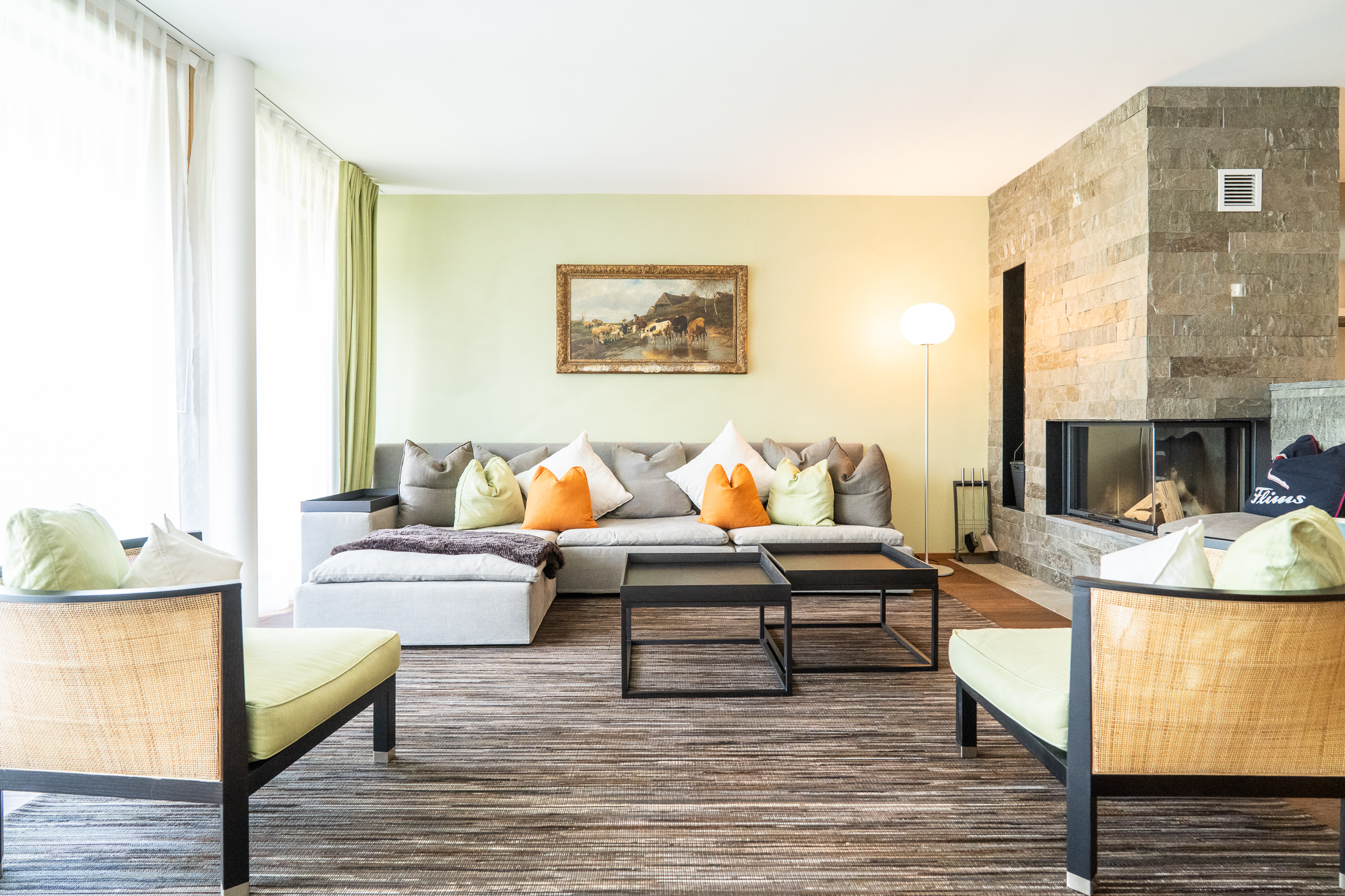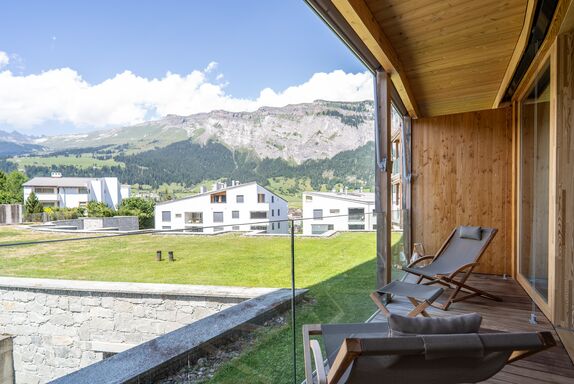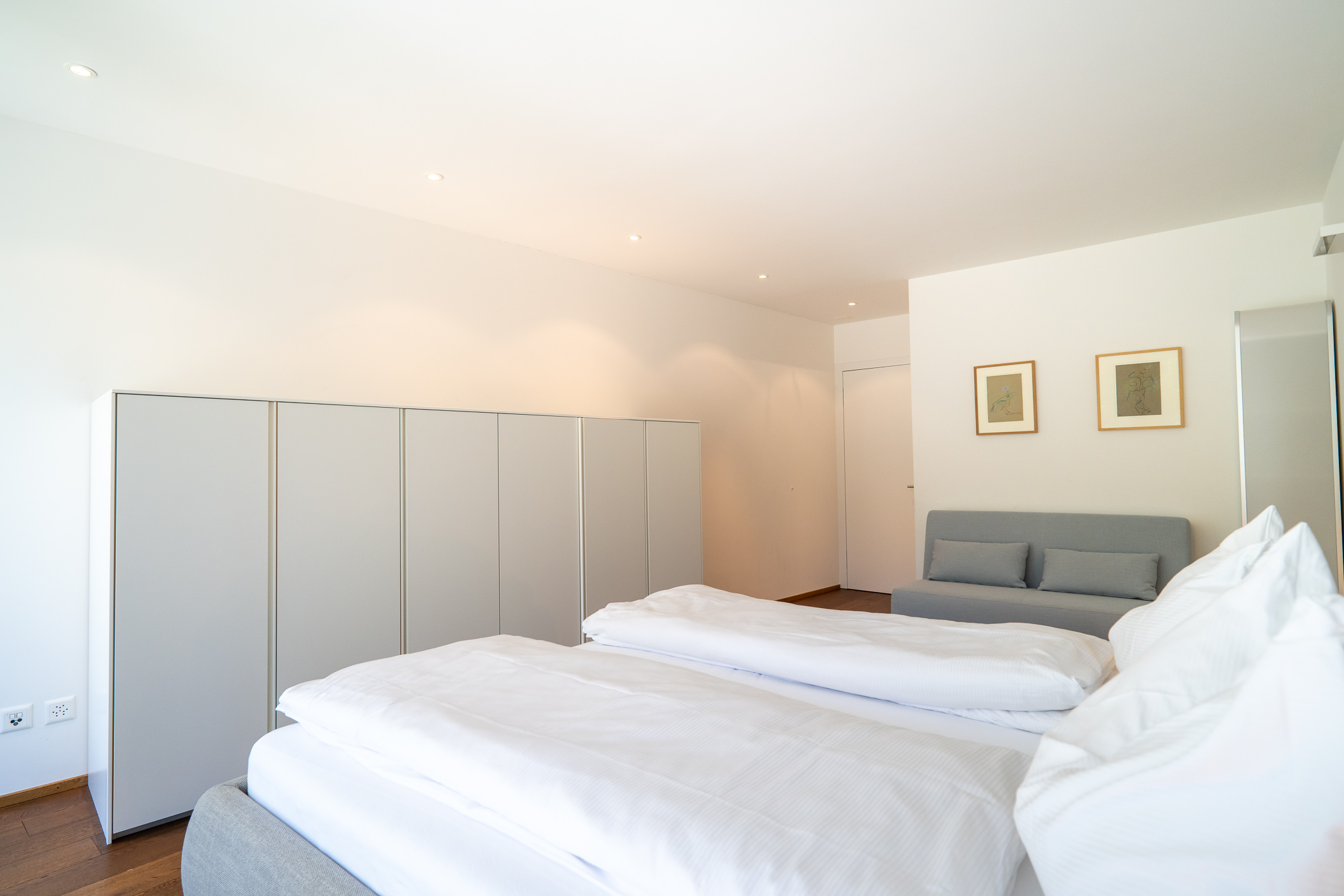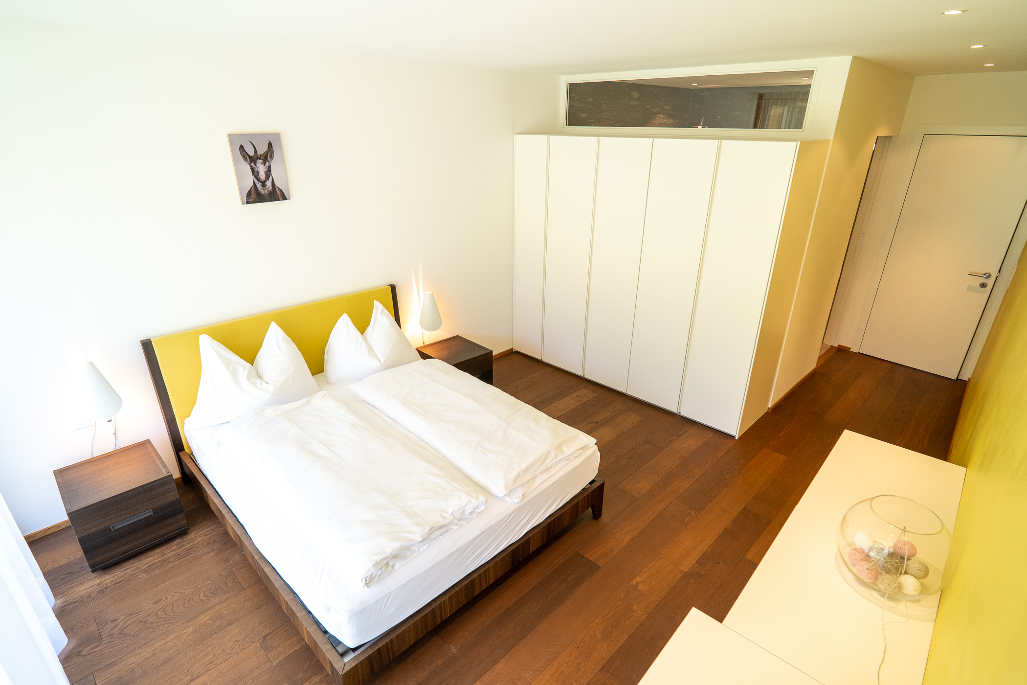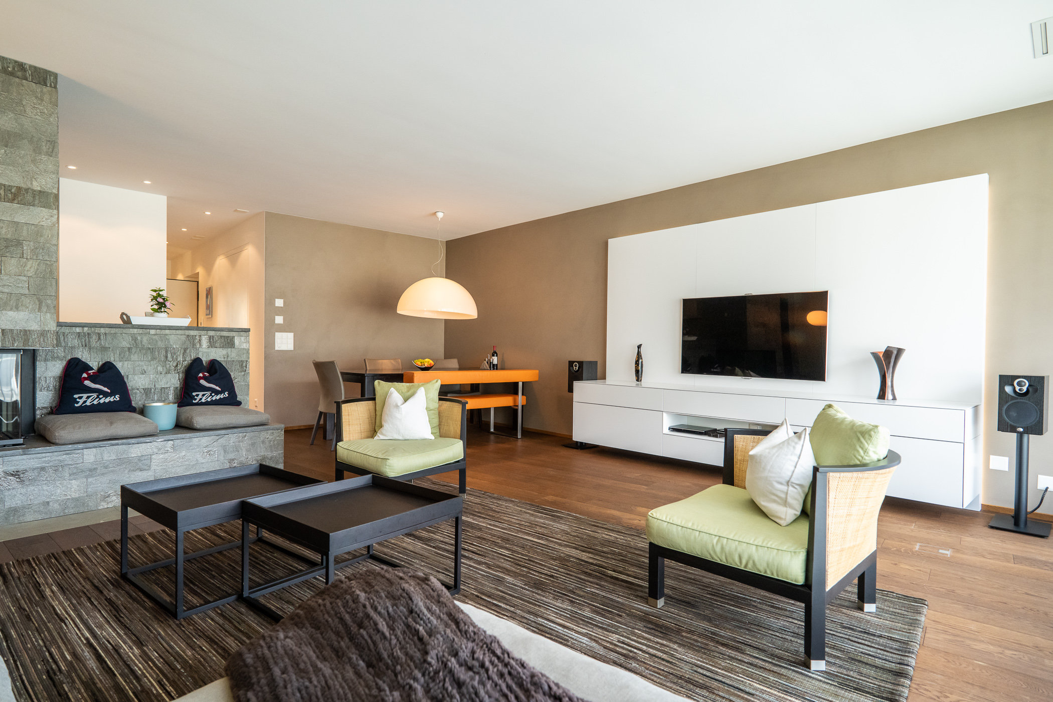 Luxuriöse 3.5 Zimmerwohnung für max. 4 Personen, mit 2 Schlafzimmern mit jeweils eigenem Badezimmer (Badewanne oder Dusche) und separater Gästetoilette. 130qm Wohnfläche mit Fussbodenheizung im 1. OG der Luxus-Ferienwohnungresidenz The Mountain Suites. Nur 10 Gehminuten von der Talstation Flims entfernt.