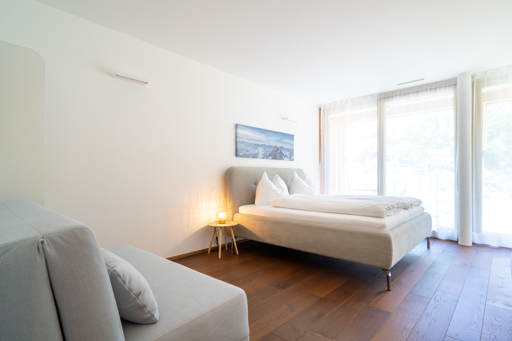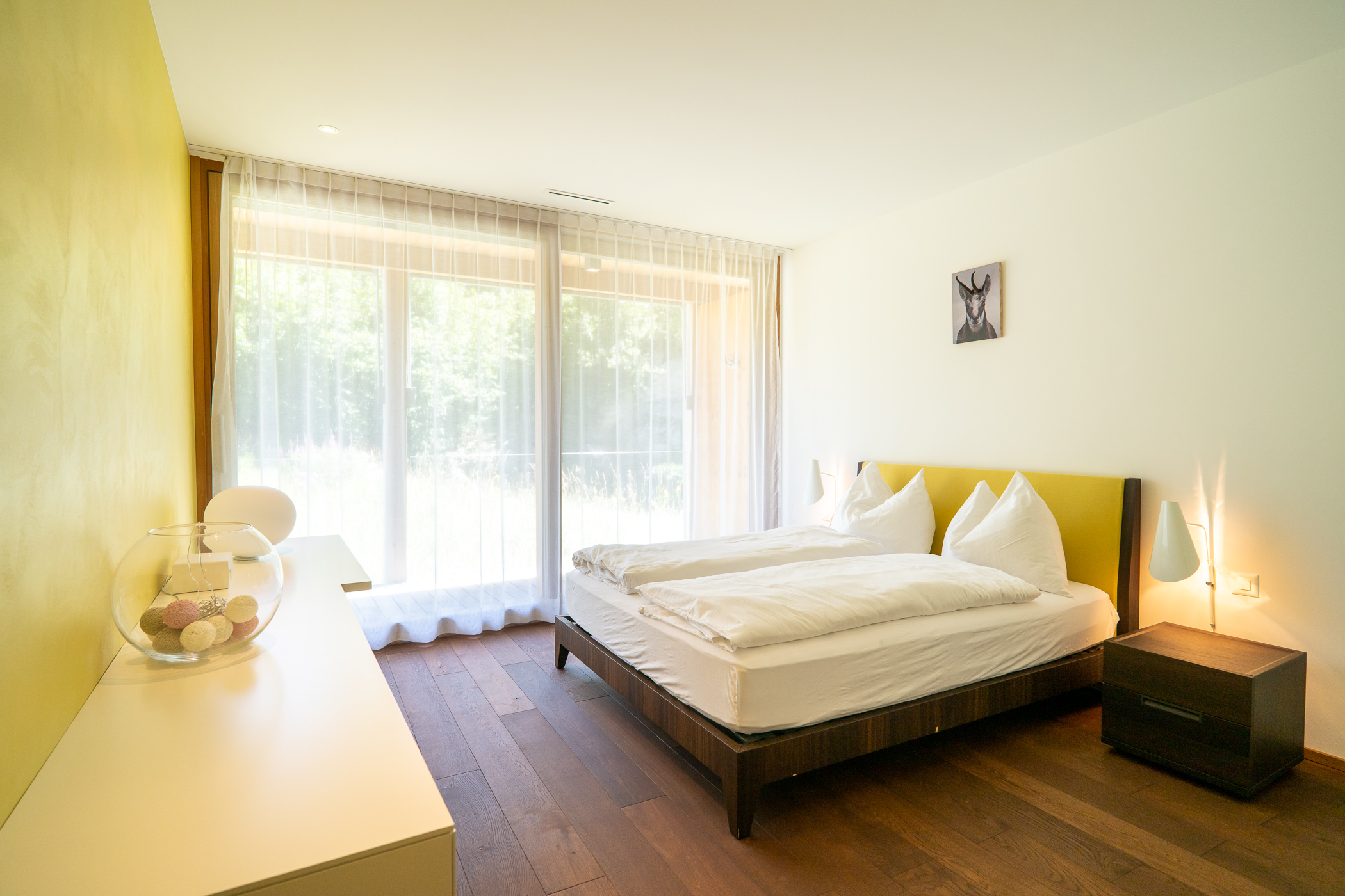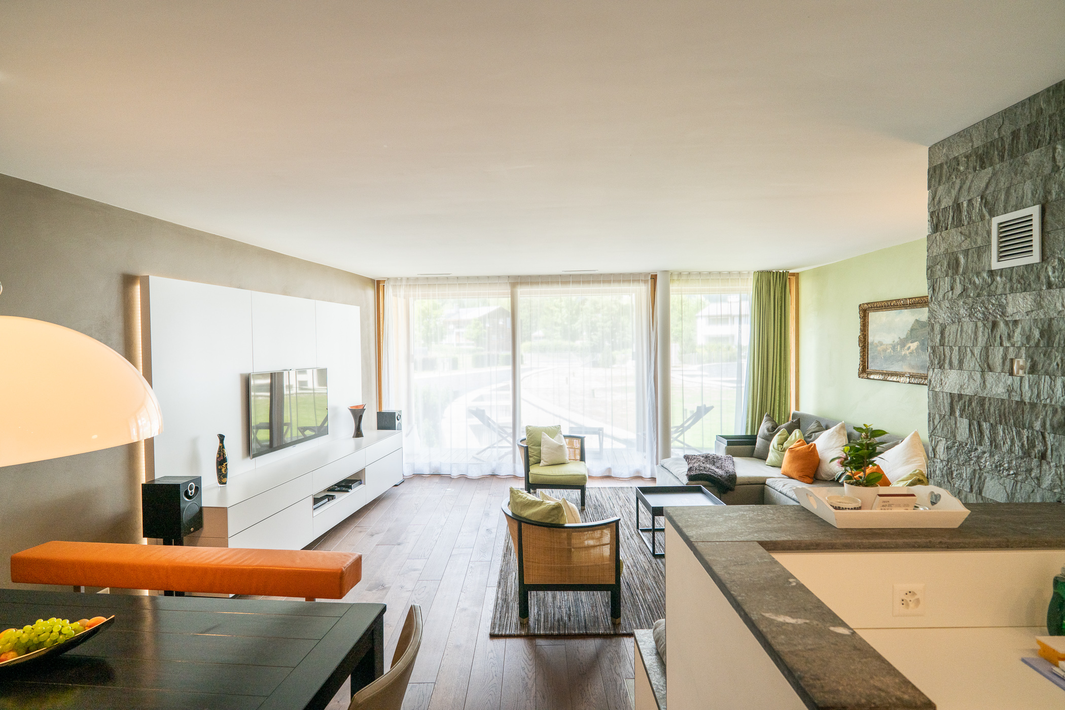 Luxuriöse 3.5 Zimmerwohnung für max. 4 Personen, mit 2 Schlafzimmern mit jeweils eigenem Badezimmer (Badewanne oder Dusche) und separater Gästetoilette. 130qm Wohnfläche mit Fussbodenheizung im 1. OG der Luxus-Ferienwohnungresidenz The Mountain Suites. Nur 10 Gehminuten von der Talstation Flims entfernt.