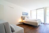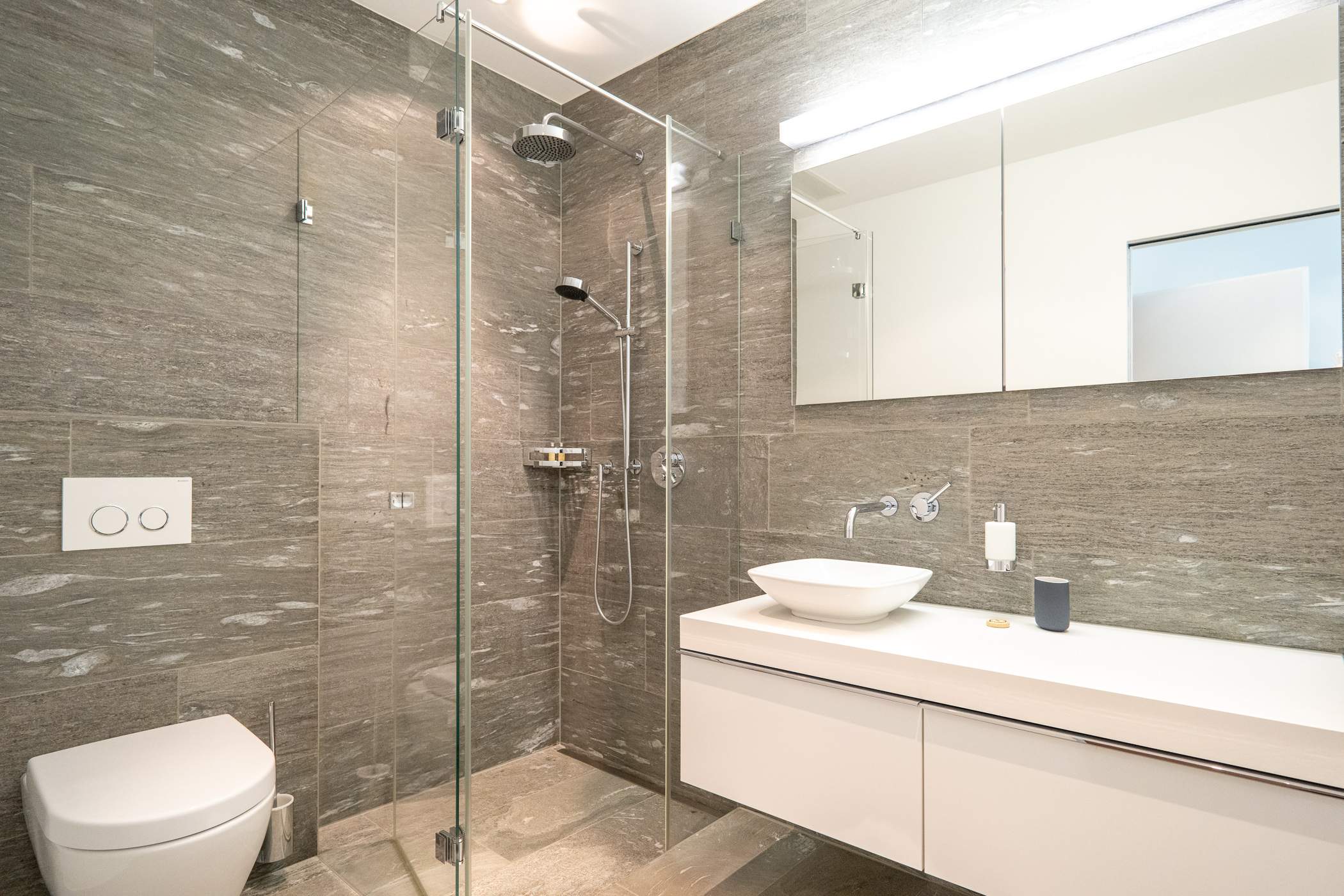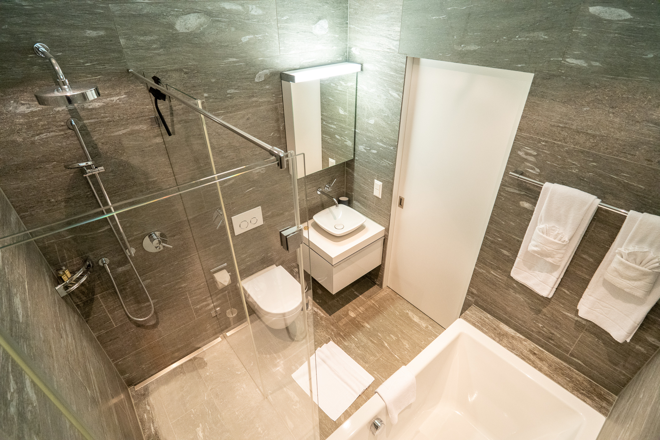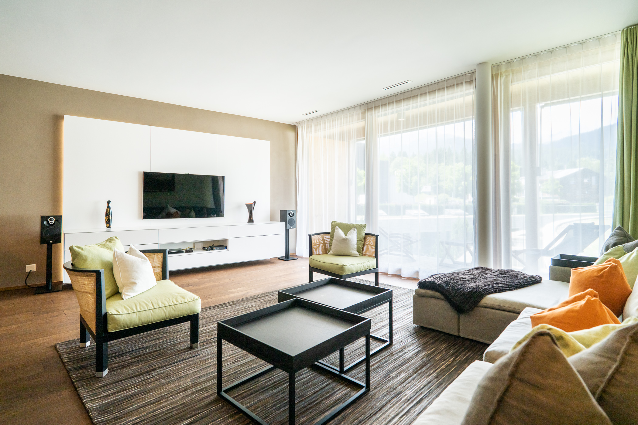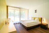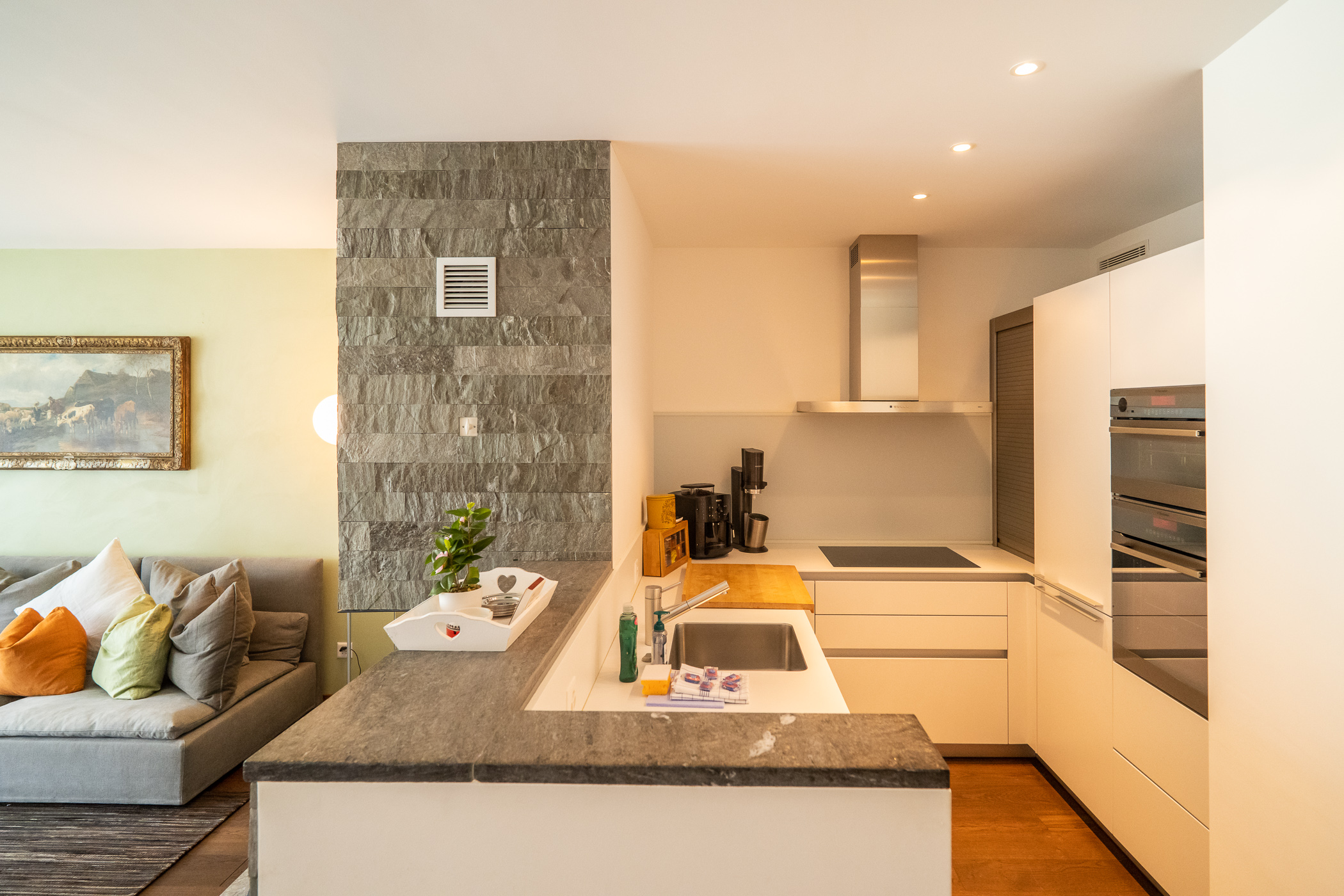 Luxuriöse 3.5 Zimmerwohnung für max. 4 Personen, mit 2 Schlafzimmern mit jeweils eigenem Badezimmer (Badewanne oder Dusche) und separater Gästetoilette. 130qm Wohnfläche mit Fussbodenheizung im 1. OG der Luxus-Ferienwohnungresidenz The Mountain Suites. Nur 10 Gehminuten von der Talstation Flims entfernt.