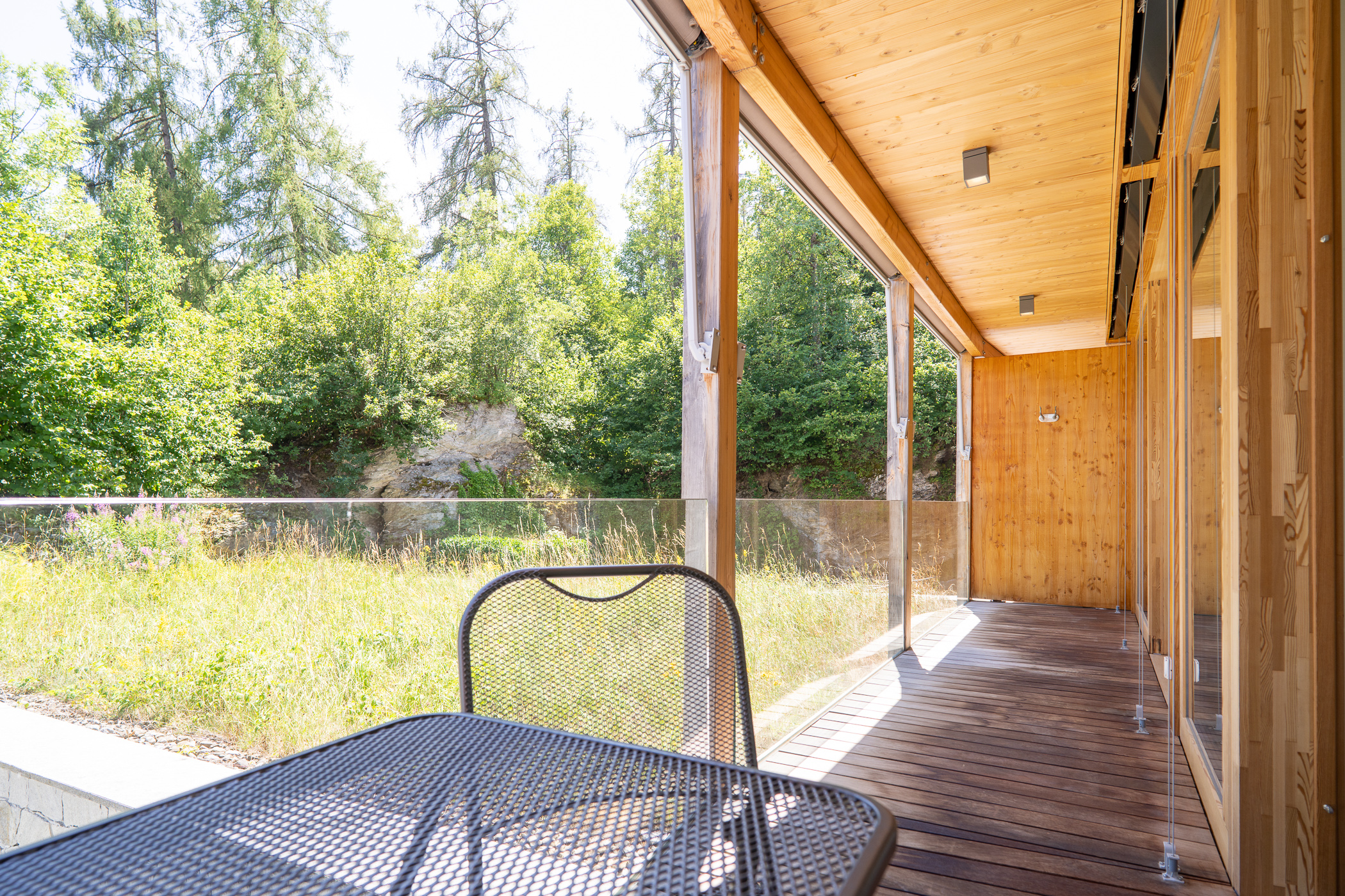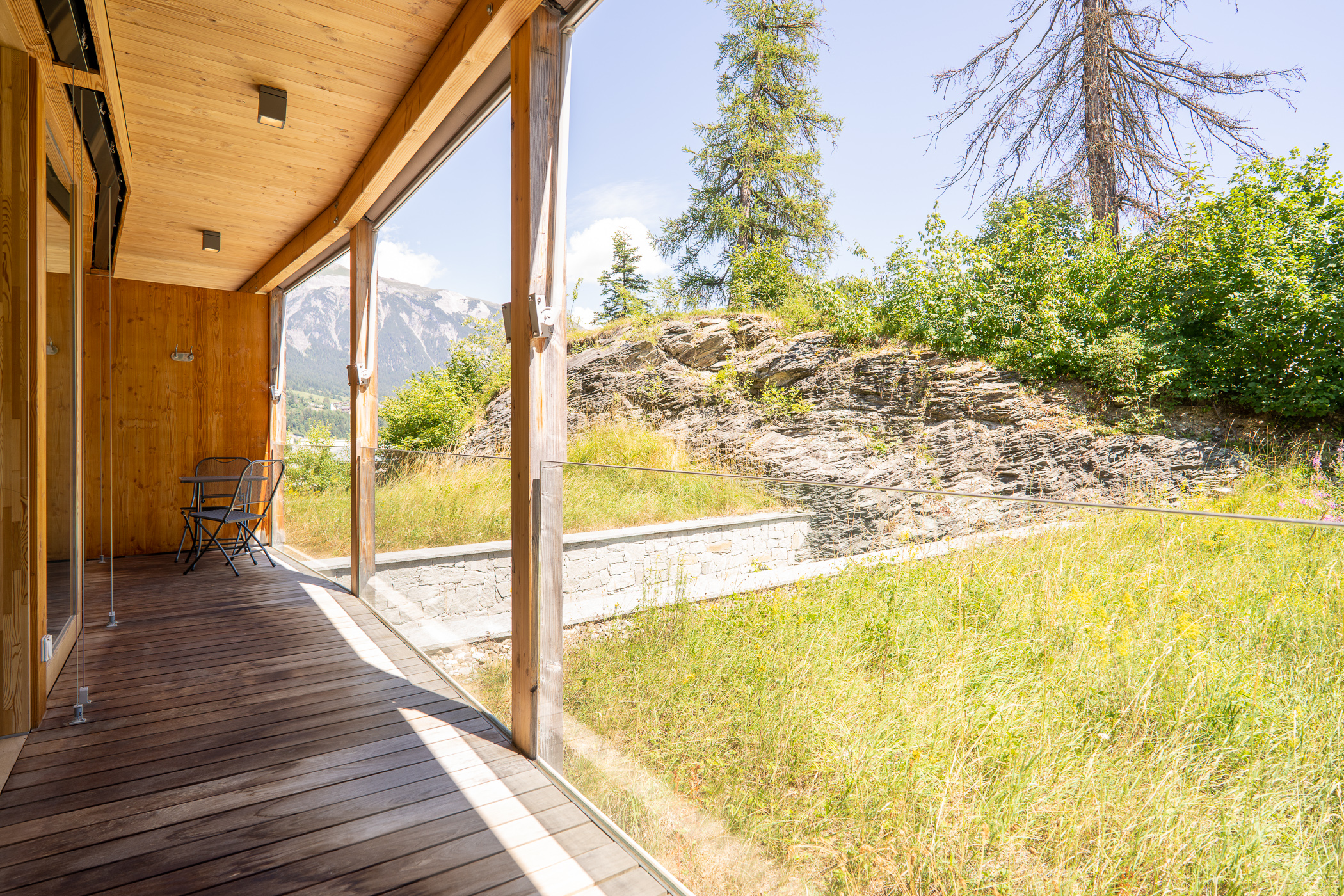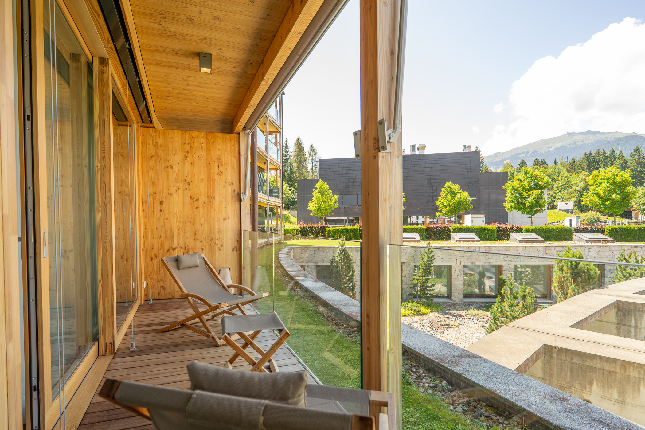 THE MOUNTAIN SUITES setzen mit zwei architektonisch markanten, halbrund über- einander gesetzten Gebäuden mit einer leichten Glas - Holz Fassade, eindrückliche Akzente. Über ein grosszügiges Atrium gelangen Sie ins Zentrum der Luxusresidenz. Hier werden Bewohner und Gäste vom Lifestyle Concierge empfangen. In Laufnähe findet man eine Bäckerei, einen Supermarkt und einige Geschäfte und Restaurants. Ausflugsziele wie der Cauma See, die Rheinschlucht und das Sportzentrum Prau la Selva befinden sich in der Nähe. Bei guten Schneeverhältnissen kann die Wohnung über die Talabfahrt Flims Waldhaus mit Skiern bis auf wenige Meter erreicht werden. Direkt vor dem Haupteingang holt Sie ein kostenloser Skishuttle ab und fährt Sie fahrplanmässig an die Bergbahnen und abends wieder nach Hause (Service ab Weihnachtswoche bis Ostern verfügbar).