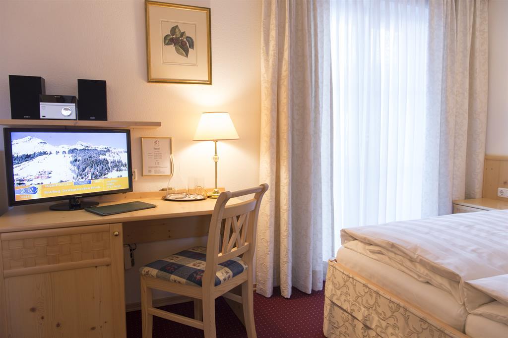 Schönes Doppelzimmer im 1. Stock mit Süd-Terrasse. Schöner Blick nach Lech. Das Doppelzimmer Horaplätz ist mit hellen Holzmöbeln ausgetattet. Badezimmer mit Dusche, Eckbadewanne, Doppelwaschbecken, Handtuchtrockner, Haarfön, Kosmetikspiegel. Separates WC. Tisch, Sitzfauteuil, Schreibtisch, Kabel-TV mit Flat Screen, Radio, CD-Player, Zimmersafe, Kostenfreie Internetbenützung WLAN Fibre.