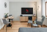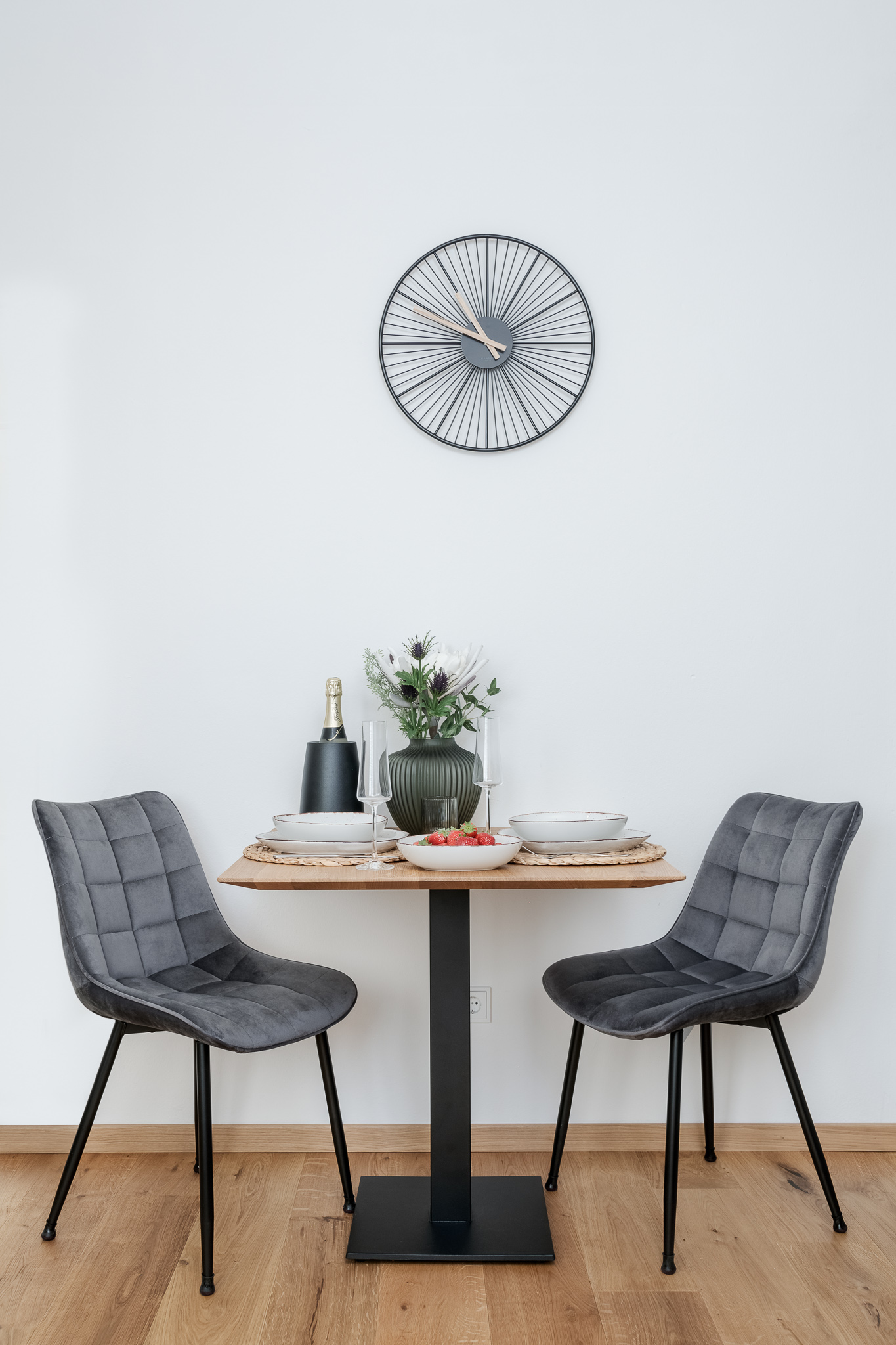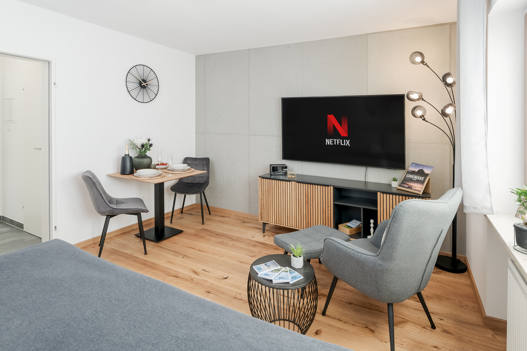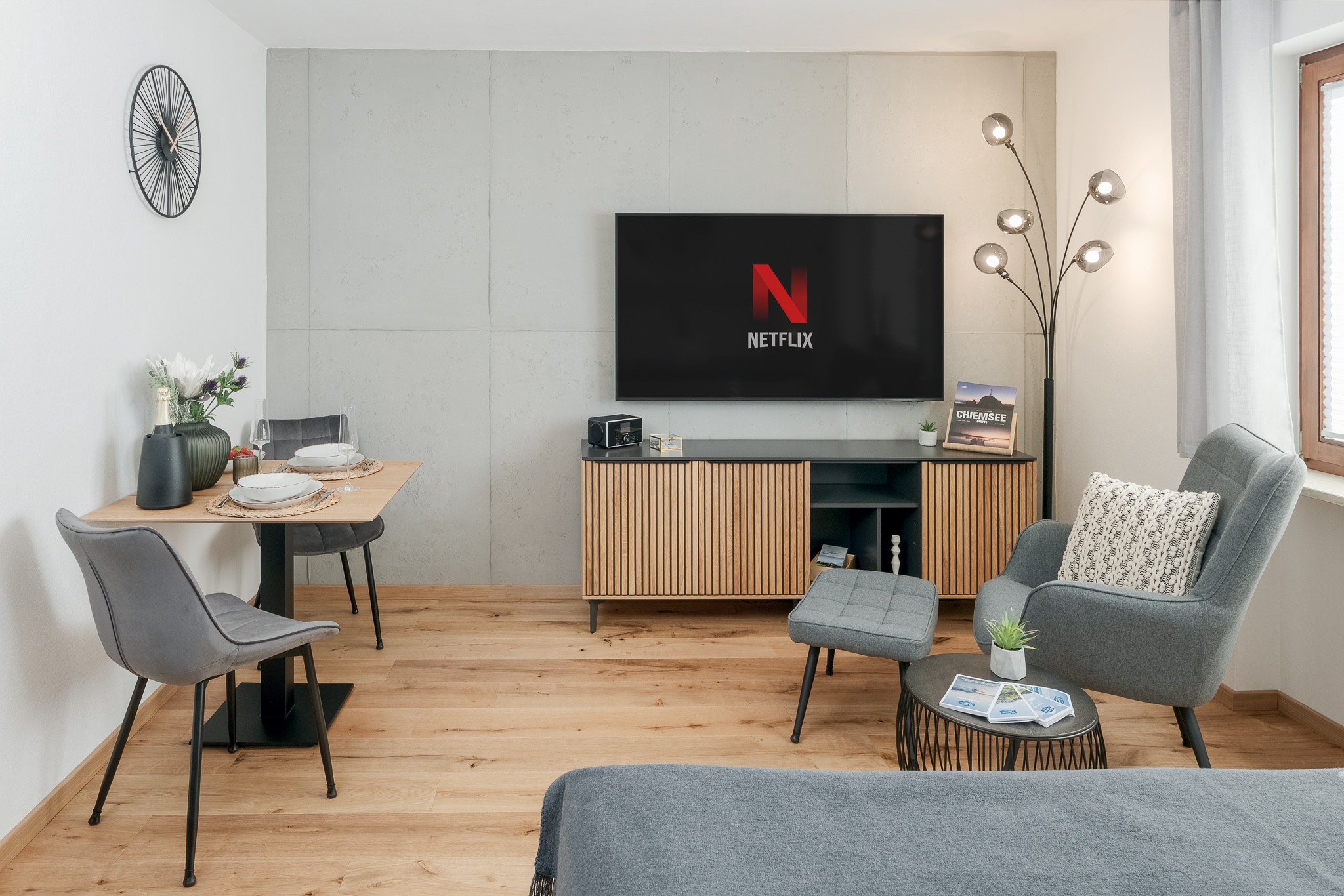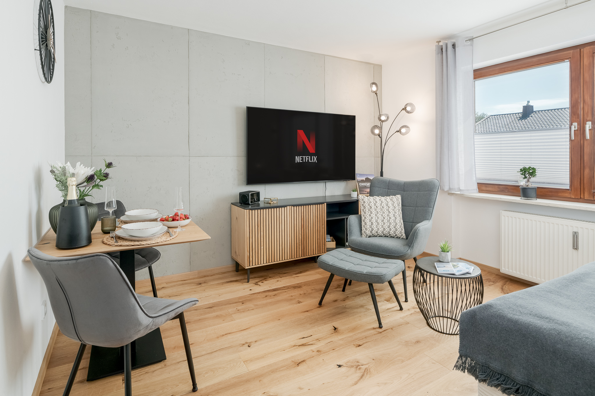Darüber hinaus verfügt die Wohnung über einen Essbereich für 2 Personen. Entspann Dich anschließend im gemütlichen Ambiente, das mit einem 65-Zoll-Smart-TV inkl. NETFLIX und Internet-TV in UHD-Qualität ausgestattet ist. Genieße Deine Lieblingssendungen und Filme in bester Bildqualität.