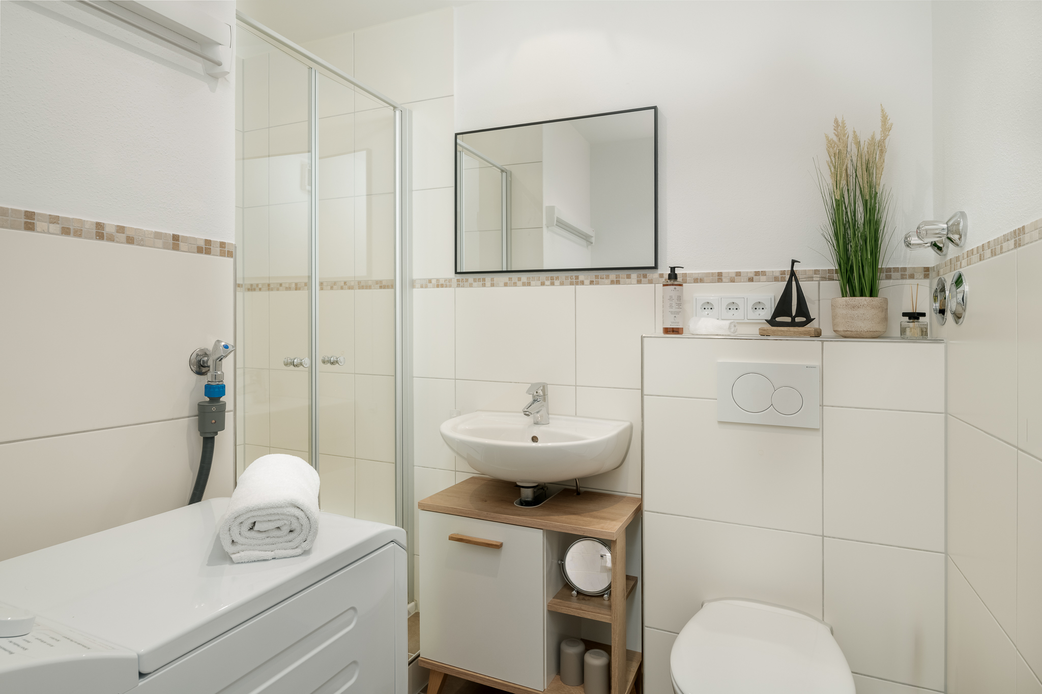 Das Badezimmer ist mit einer Dusche ausgestattet und verfügt auch über eine Waschmaschine.