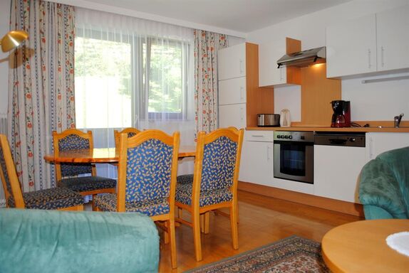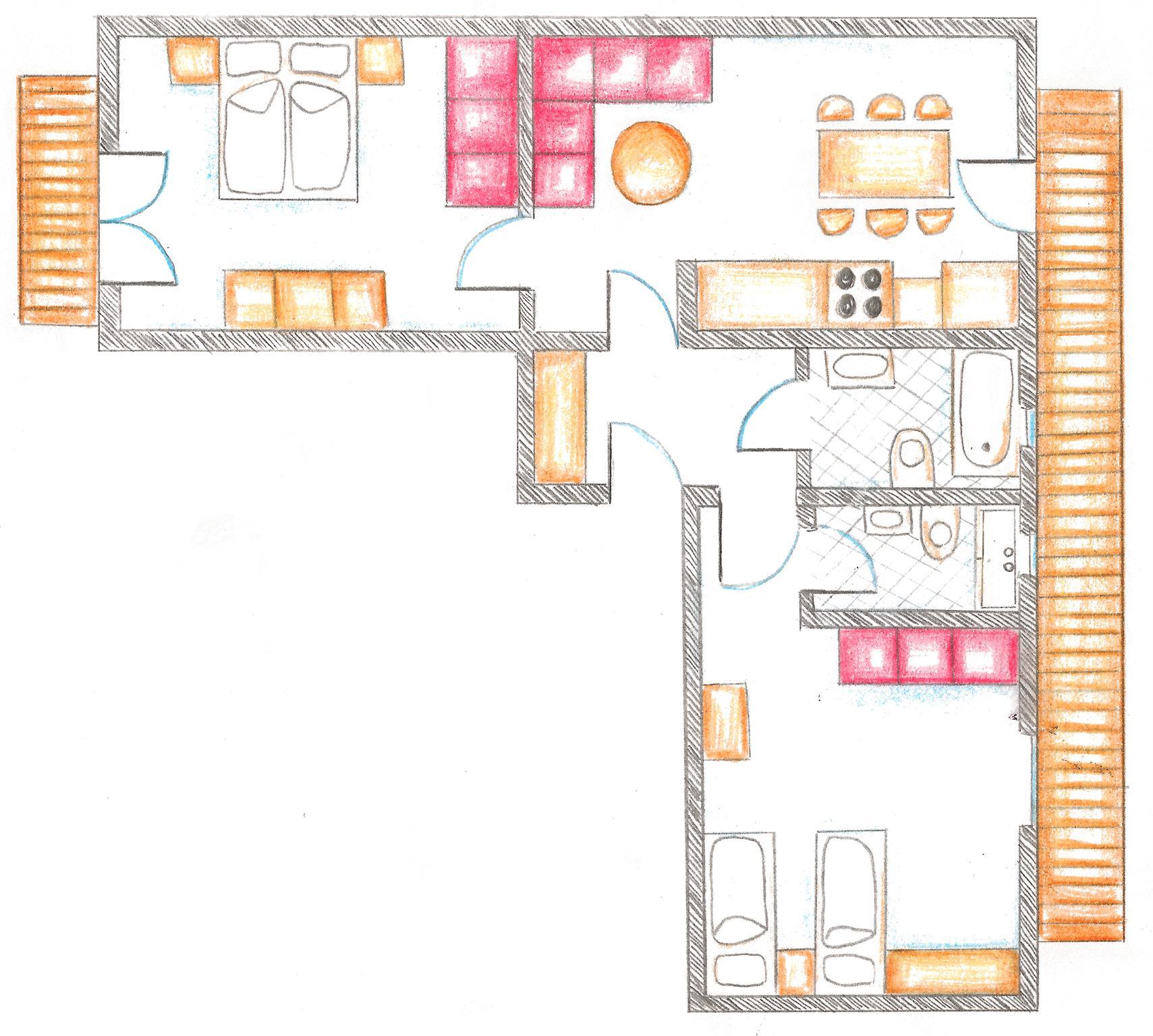 Liebevoll eingerichtete Ferienwohnung für bis zu 6 Personen mit zwei getrennten Schlafzimmern (einmal Ehebett, einmal 2 getrennte Betten, (kann man auch zusammenschieben) jeweils eine Couch), Wohnraum mit Couchecke (Ausziehcouch 1,95 m x 1,20 m) und Sat-TV, mit neuer komfortabler Küchenzeile mit Geschirrspüler, Kaffemaschine, Backrohr und gemütlicher Sitzecke, Esstisch für 6 Personen, 1 Badezimmer mit Badewanne/Dusche und WC sowie ein kleines Badezimmer mit Dusche und WC. Zwei große Balkone!