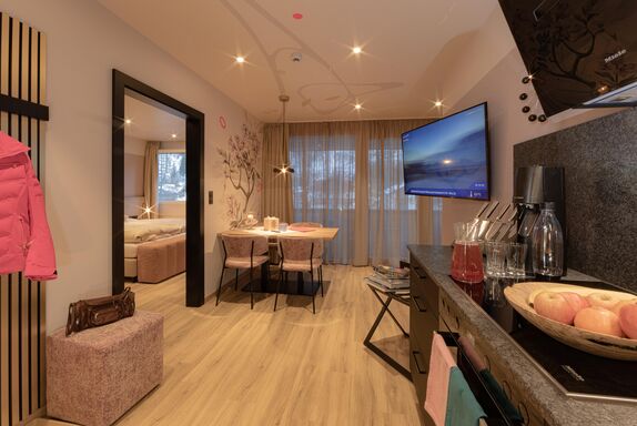 Inspiriert von den Alpenrosen, die im Juni und Juli in Sölden blühen, bringt das Appartement Alpenrose diese rosarote sommerliche Pracht direkt ins Wohnambiente. Das Appartement verfügt über 1 Doppelzimmer und 1 Dreibettzimmer sowie 2 Bäder mit Dusche und WC, beide ausgestattet mit Zirbenholz-Infrarotstühlen, die zusätzliche Entspannung bieten. Die Wohnküche ist modern und vollständig ausgestattet, inklusive Kapsel-Kaffeemaschine, Herd, Mikrowelle, Backofen, Geschirrspüler inklusive Tabs, Kühlschrank uvm. Eine Loggia bietet zusätzlichen Raum zum Entspannen, und durch die großen Fenster genießt man einen herrlichen Blick auf den Söldenkogl und den Brunnenkogl.