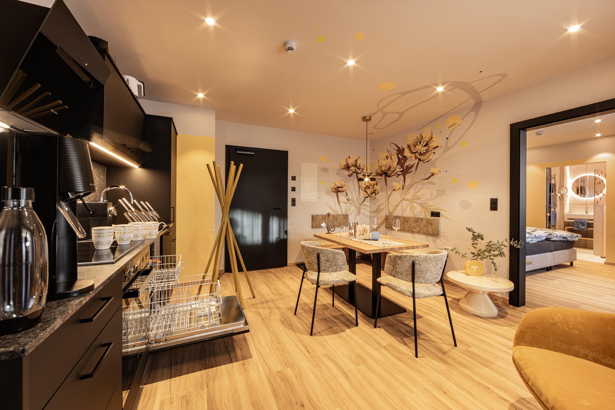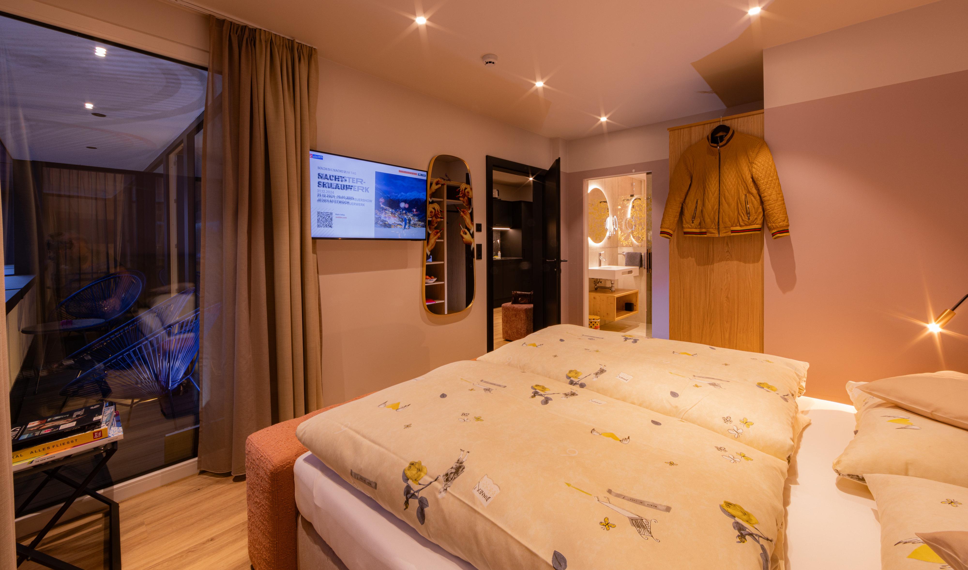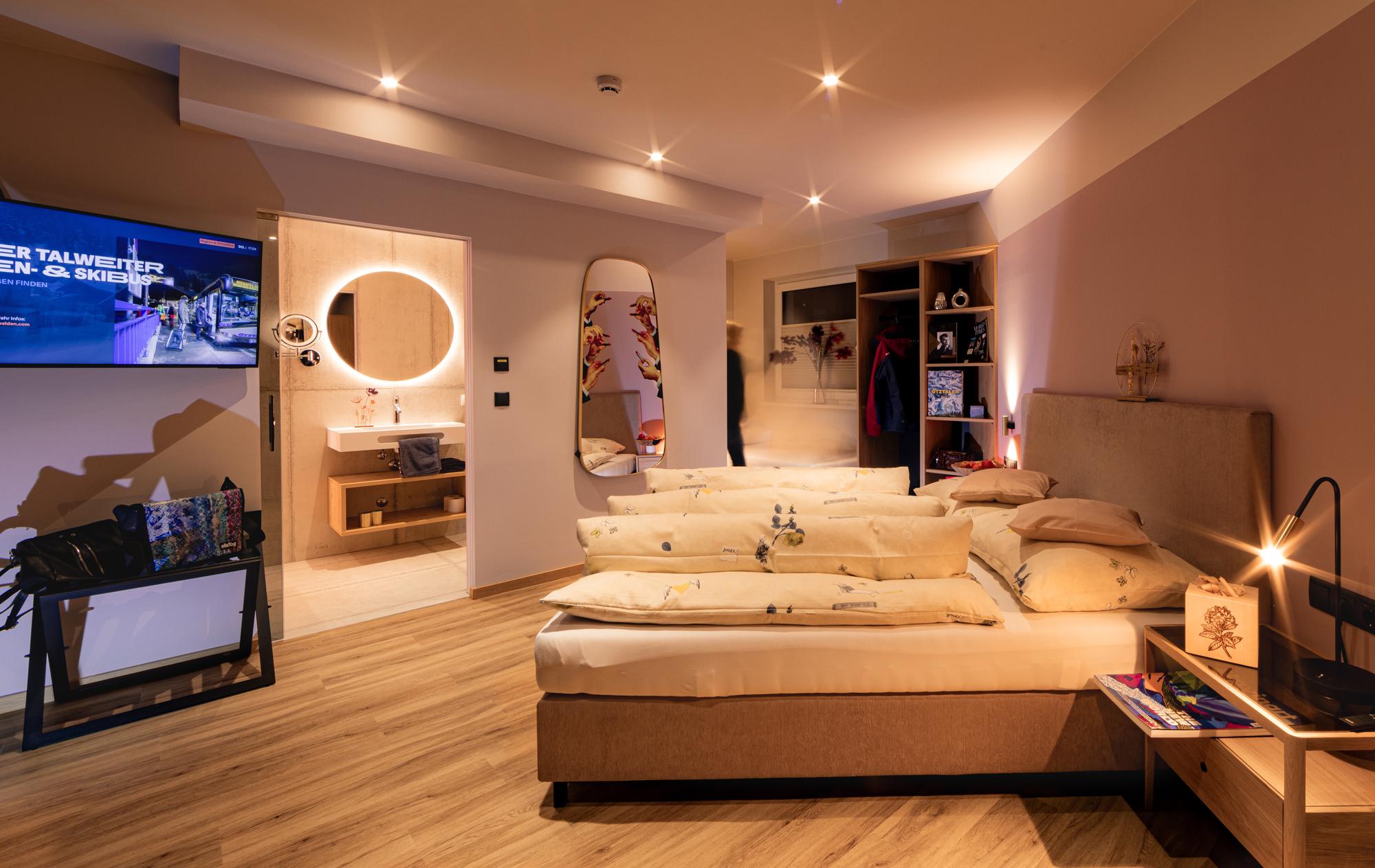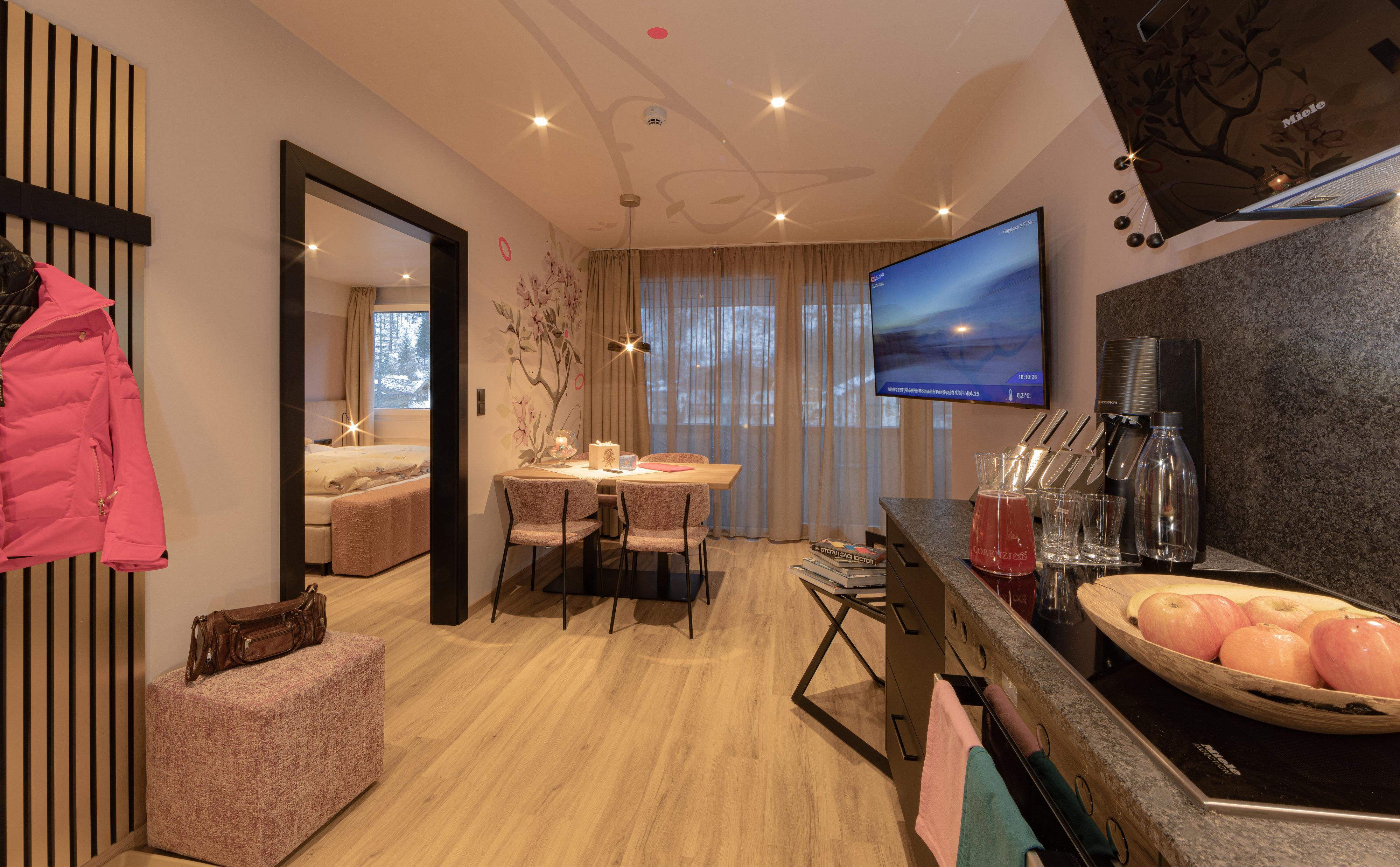 Die Appartements befinden sich in bester Lage im Zentrum von Sölden, direkt neben der Giggijochbahn und der Talabfahrt sowie den Lines der Bike Republic Sölden. Umgeben von Sportgeschäften, Restaurants, Skischulen und vielem mehr, bieten sie einen idealen Ausgangspunkt für Aktivitäten. Die Appartements sind mit viel Liebe zum Detail gestaltet und verbinden Qualität, Sauberkeit, Gemütlichkeit und Funktionalität. Inspiriert von der Natur, finden sich die Farben und Formen von heimischen Blumen im Interieur und den Namen der Appartements wieder. Ein besonderes Highlight sind die Bäder mit einzigartigen Leuchtwänden. Alle Appartements verfügen über Infrarot-Stühle, die für entspannte Muskeln und gestärkte Abfahrten sorgen. Im Gebäude befindet sich ein Bistro, welches täglich von 08:00 bis 18:00 Uhr geöffnet ist.
